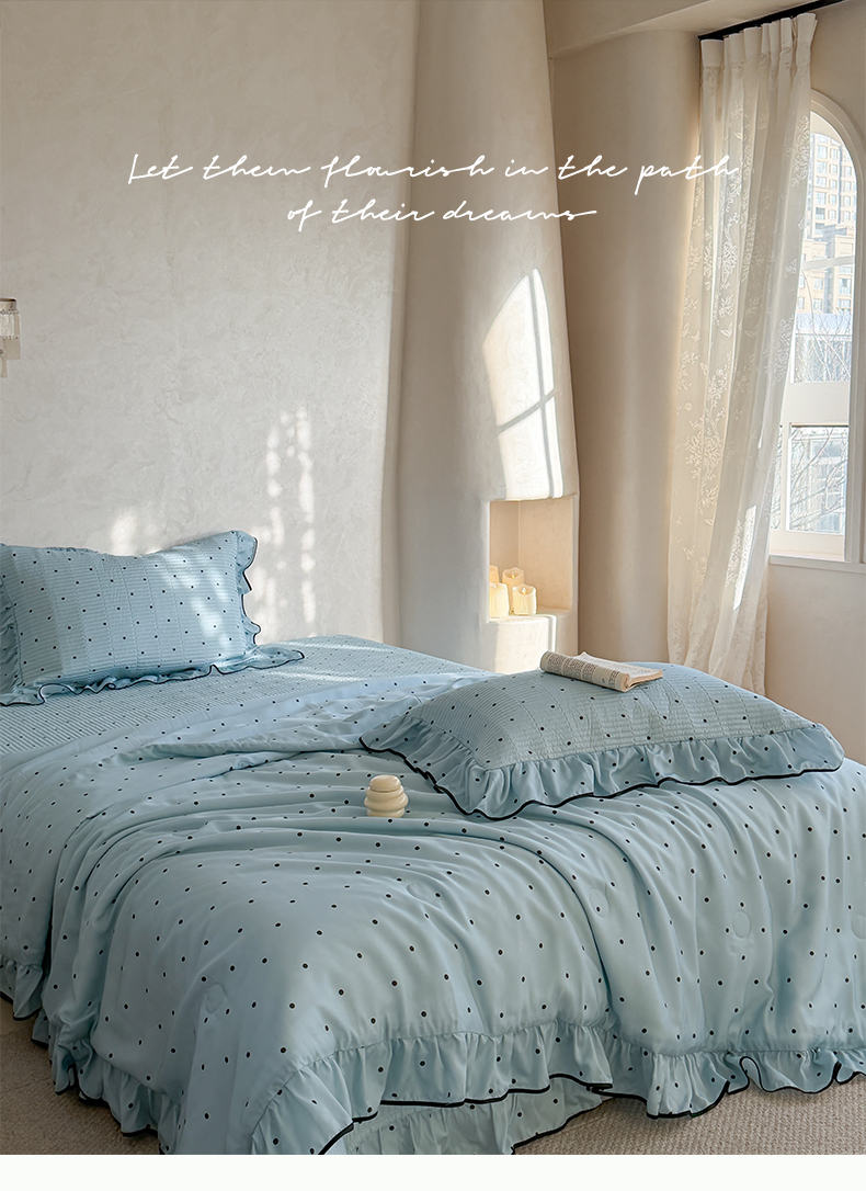 • 91家纺网 家纺一手货源 找家纺 (总)琳可家居 2026新款波点天丝系列花边款100%莱赛尔纤维天丝床盖可机洗A类床盖三件,组合图仅供展示不可下单,香草白,薄荷绿,海洋蓝,卡其杏,奶油粉,清新紫