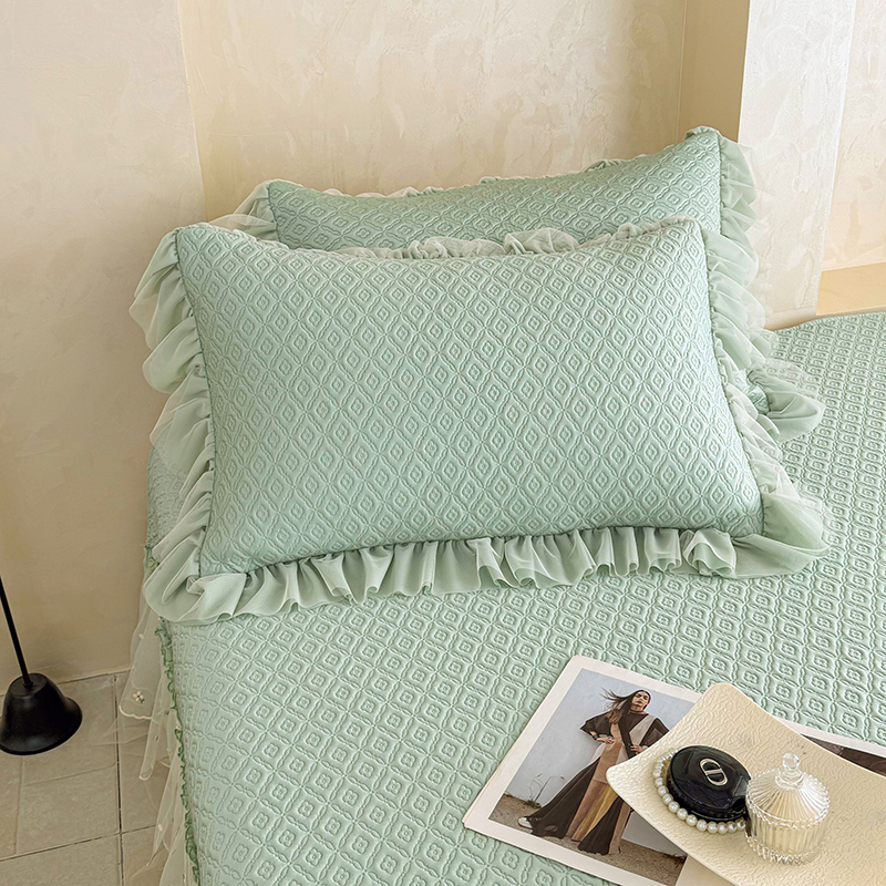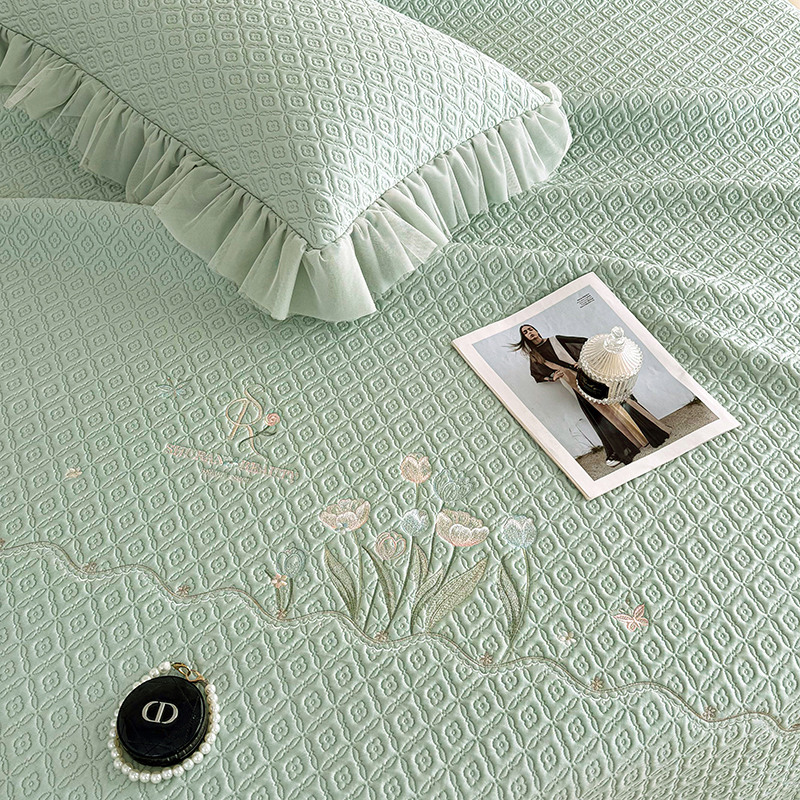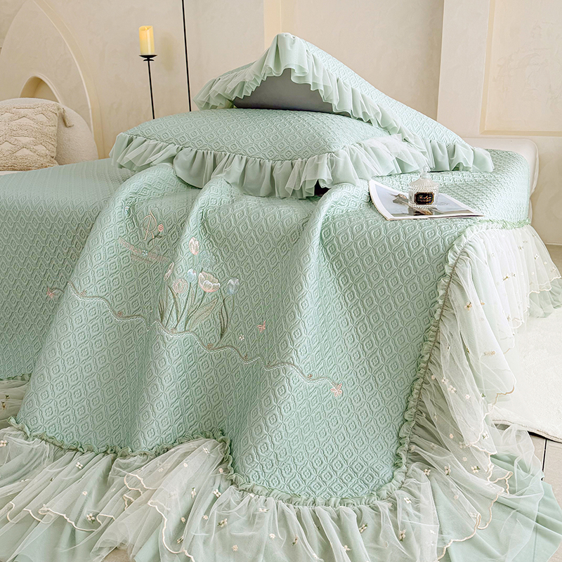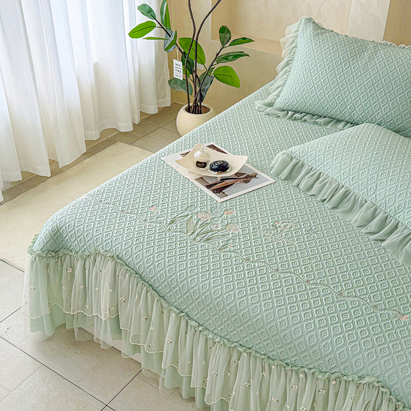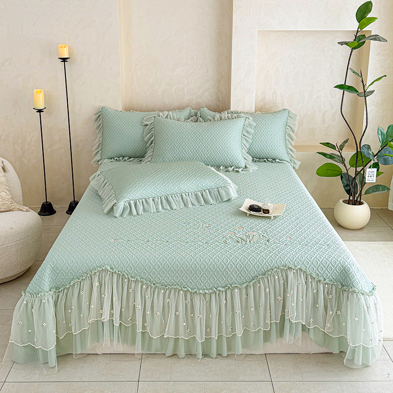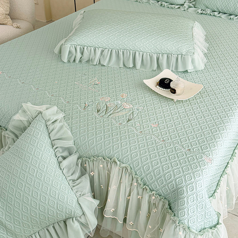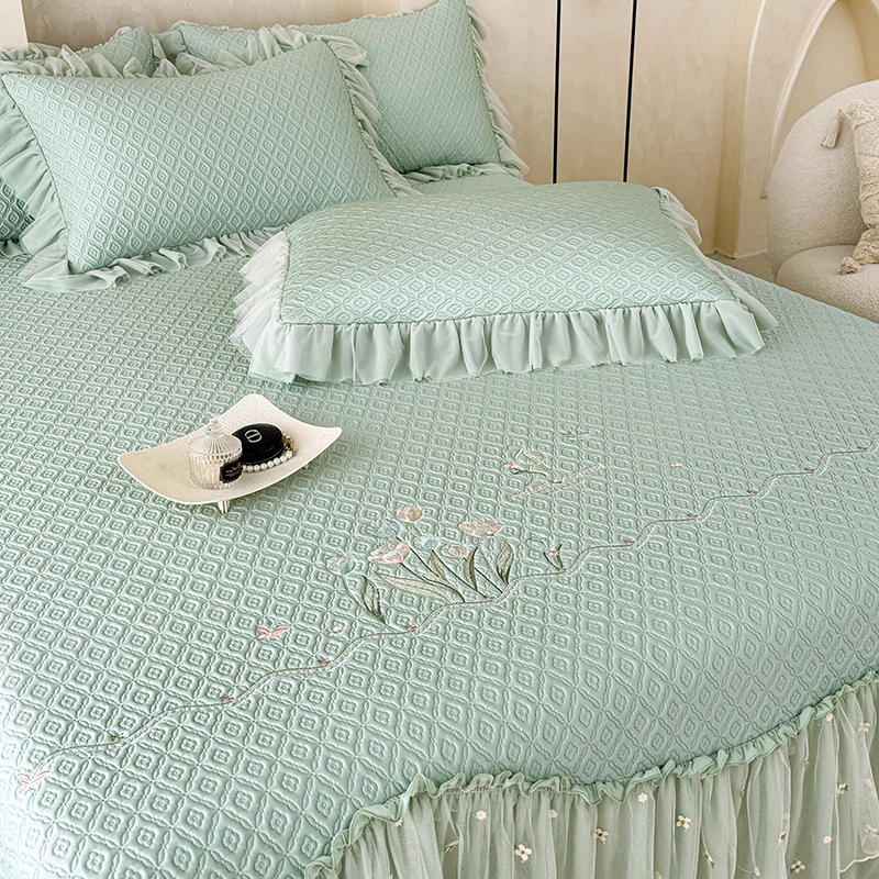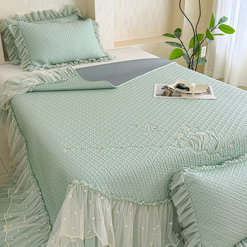 当前位置: 91家纺网 > 商品网购 > 床上用品 > 凉席 > 其他凉席 > 红夫人 2026新款凉豆豆PE高分子凉感绣花弯边床裙凉席三件套--安然影(三层花边+三明治复合+精美手提包) 安然影茶绿