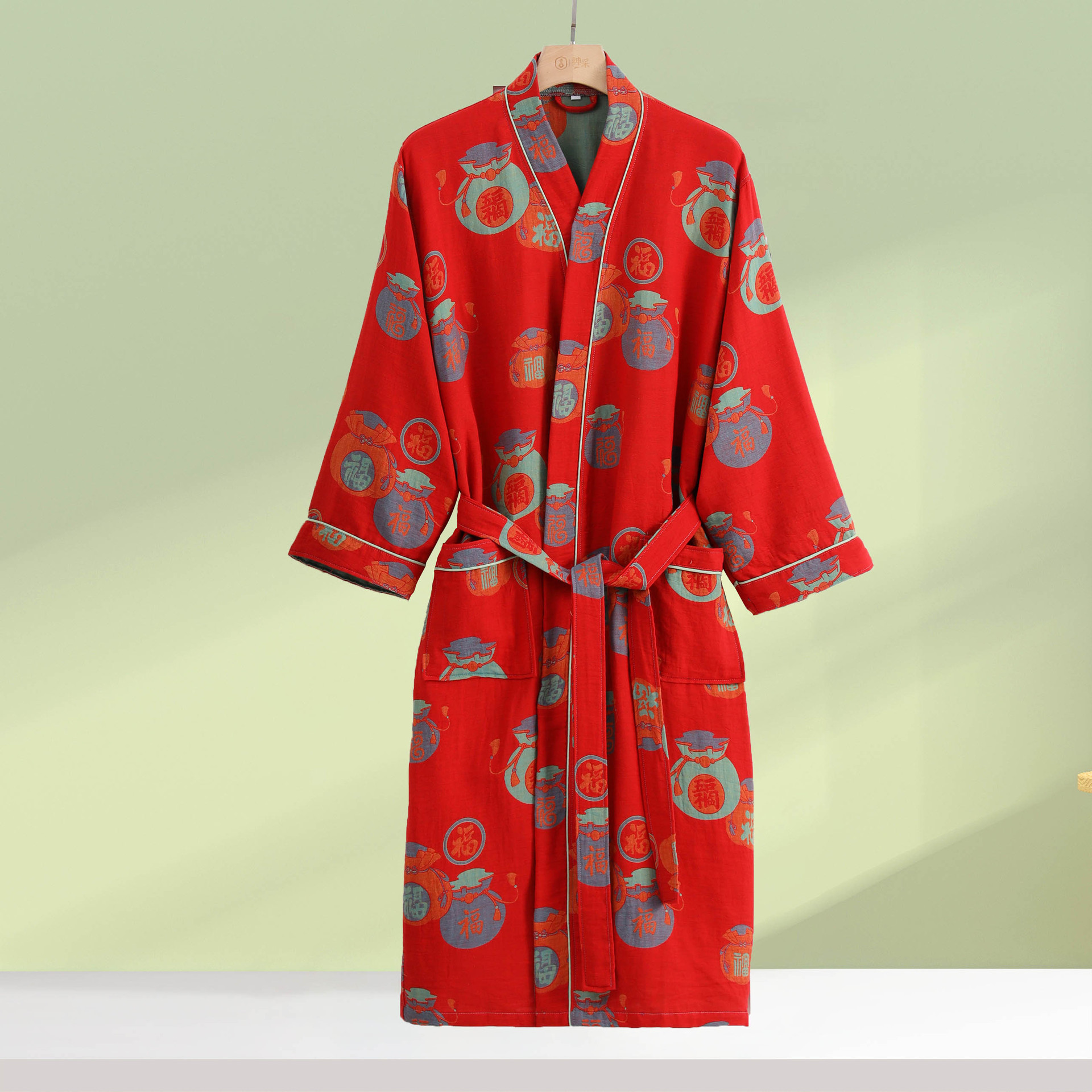 (总)洛兰沙家居馆 新款幸运红色睡衣女纯棉纱布国风家居服春夏九分袖居家服可外穿,花色1
