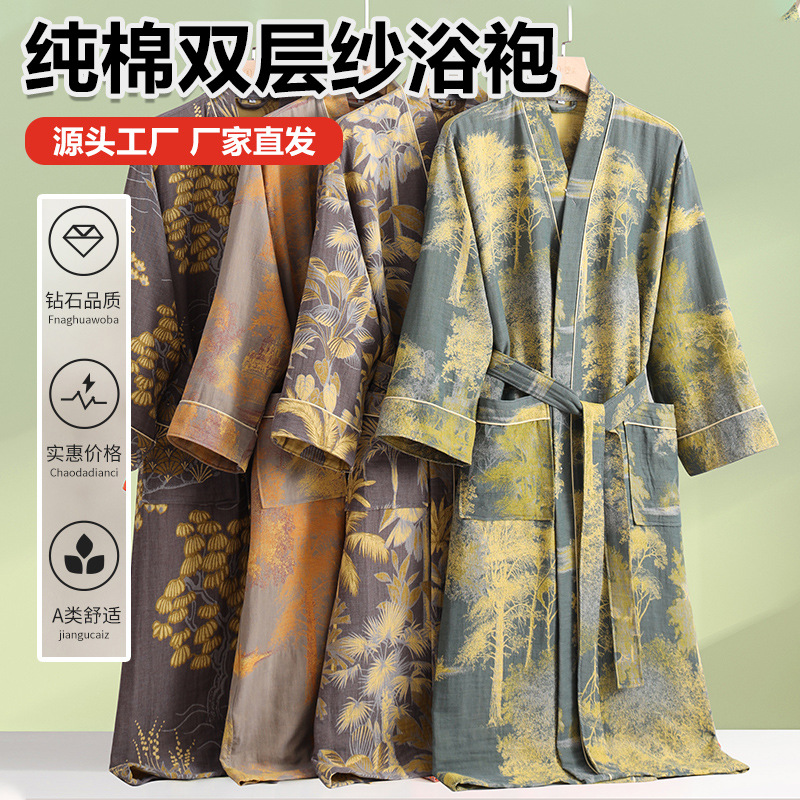 (总)洛兰沙家居馆 跨境新款纯棉双层纱浴袍全棉和服长袖情侣睡衣家居服吸水浴衣批发