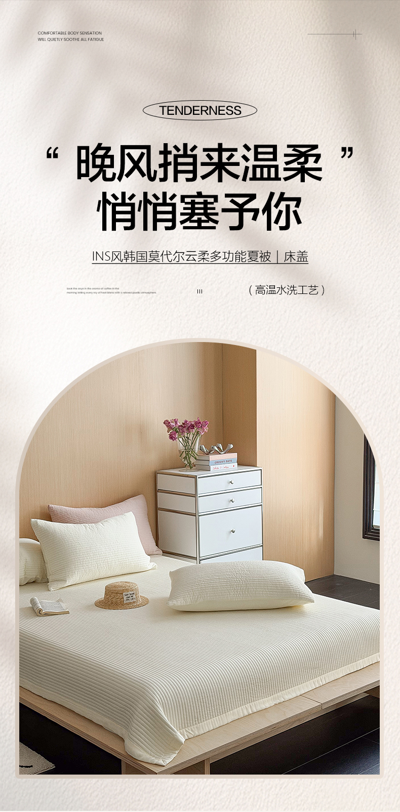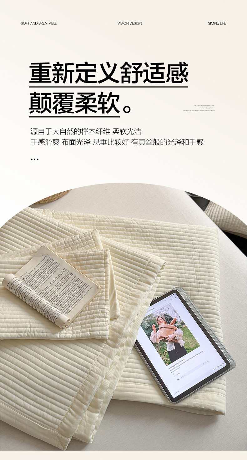 商品名称:漫调家纺 2026新款韩国莫代尔夏被床盖系列-宽边直条款 奶杏