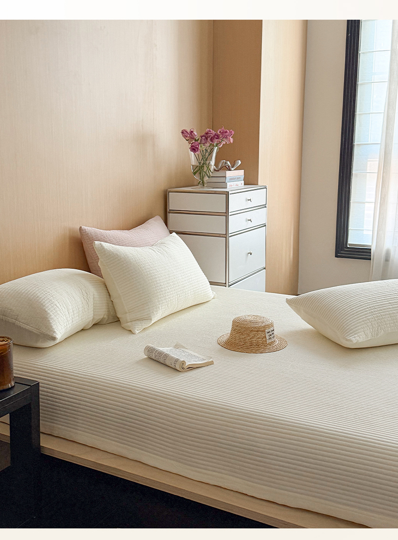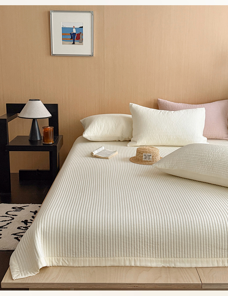 漫调家纺 2026新款韩国莫代尔夏被床盖系列-宽边直条款 奶杏