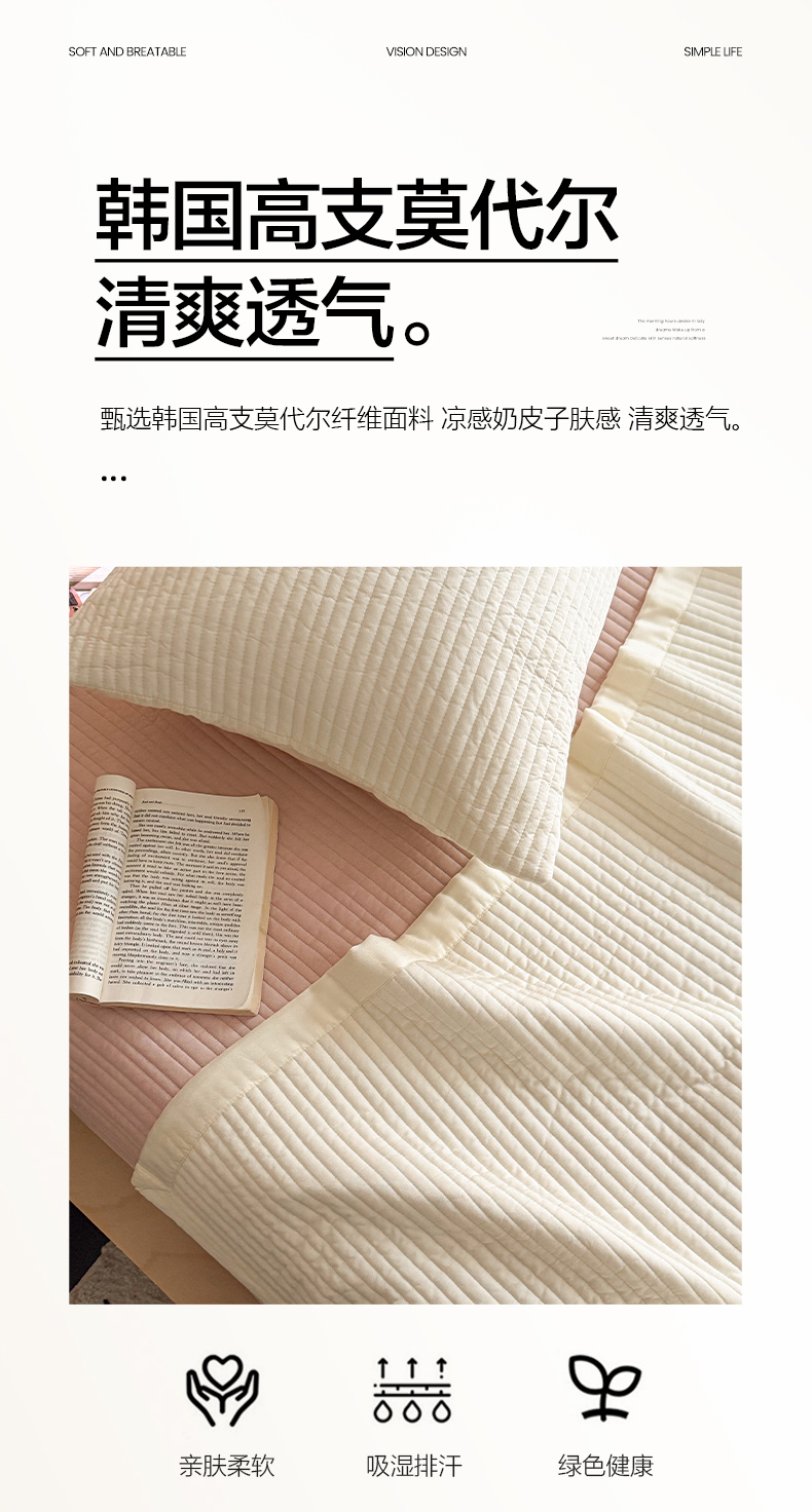 (总)漫调家纺 2026新款韩国莫代尔夏被床盖系列-宽边直条款,海盐蓝,可可暖棕,奶杏,柔粉,雾灰