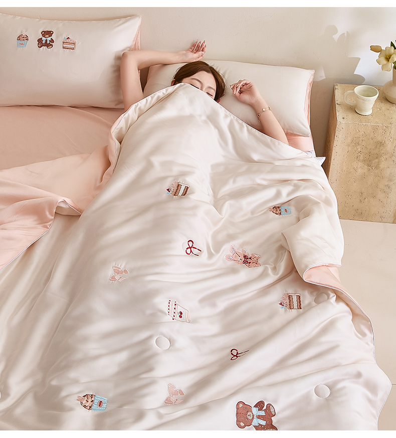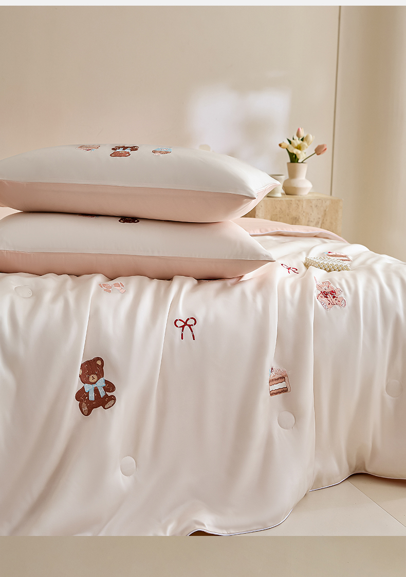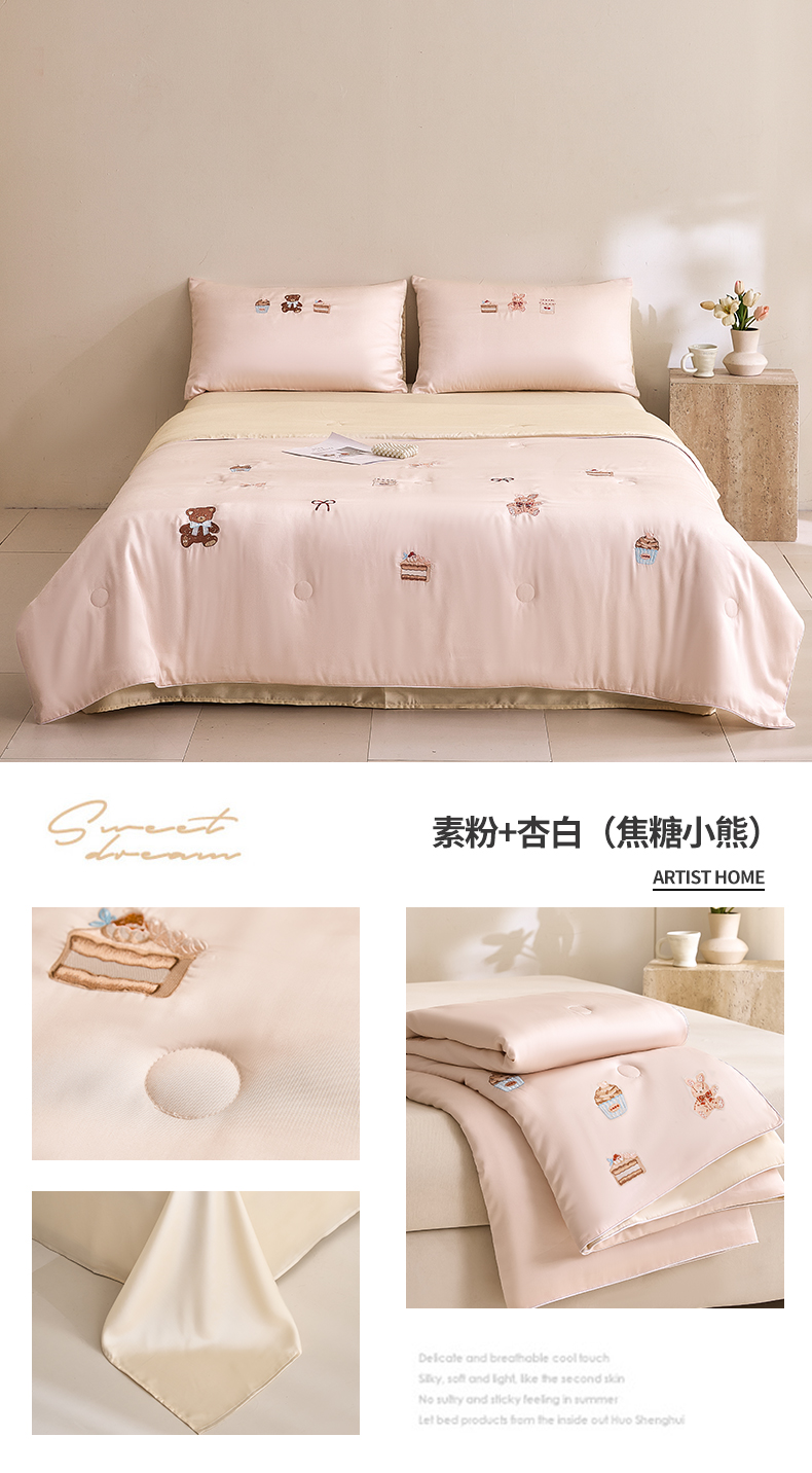 • 91家纺网 家纺一手货源 找家纺 DC 2026新款A类兰精天丝麻绳平绣系列夏被四件套 元气白桃+半熟蜜桃(焦糖小熊)