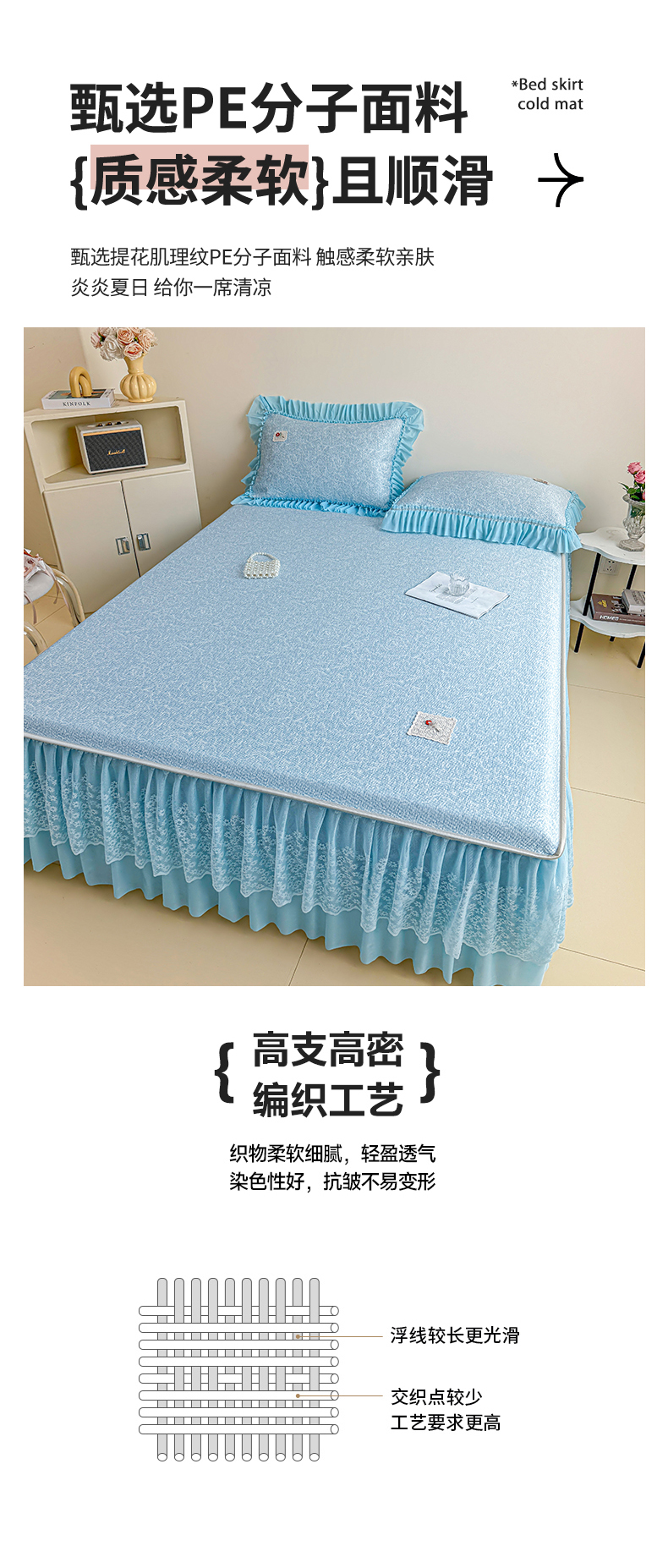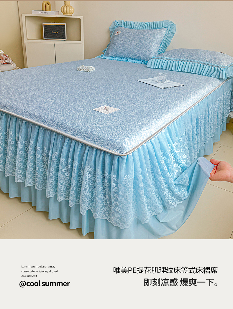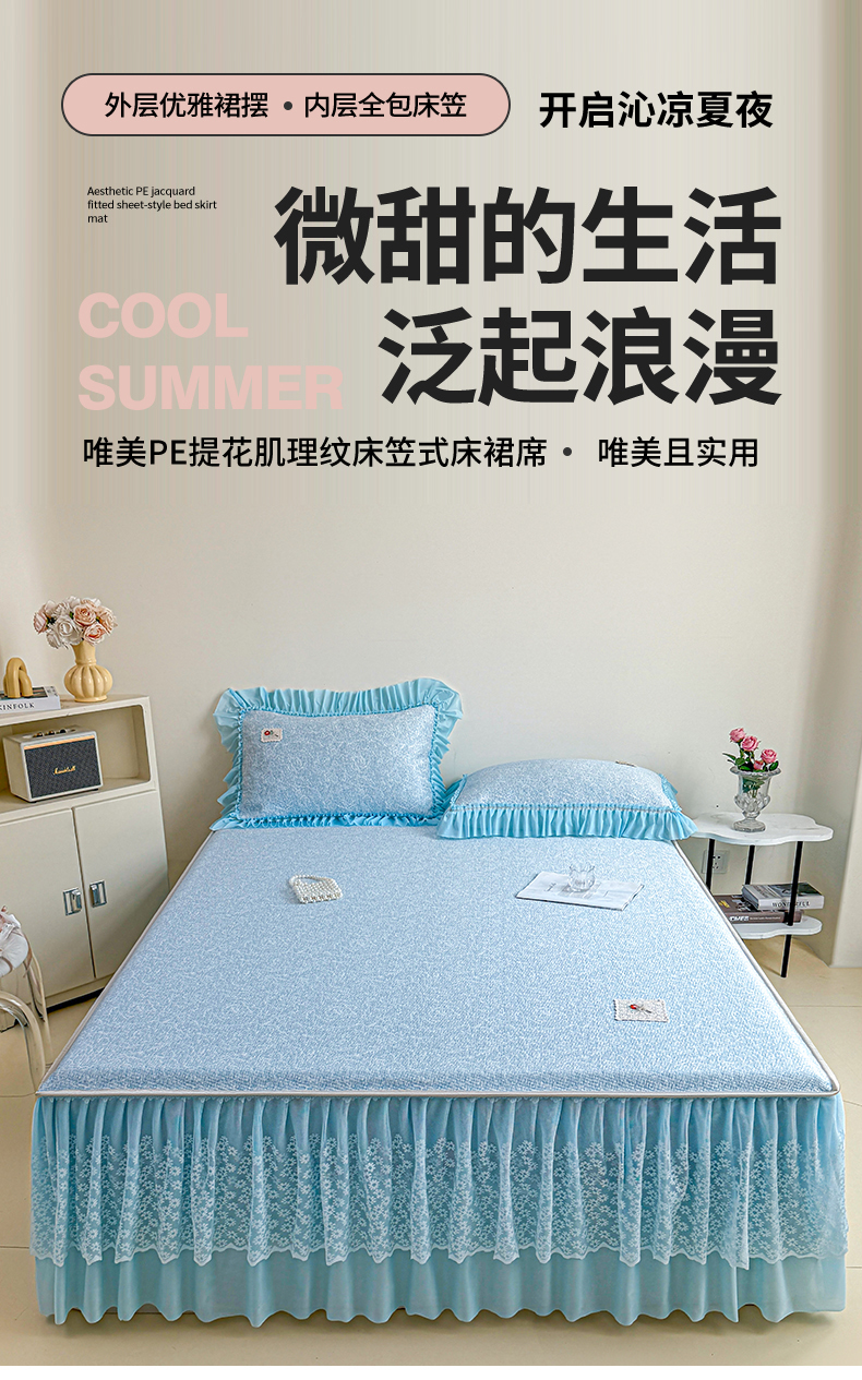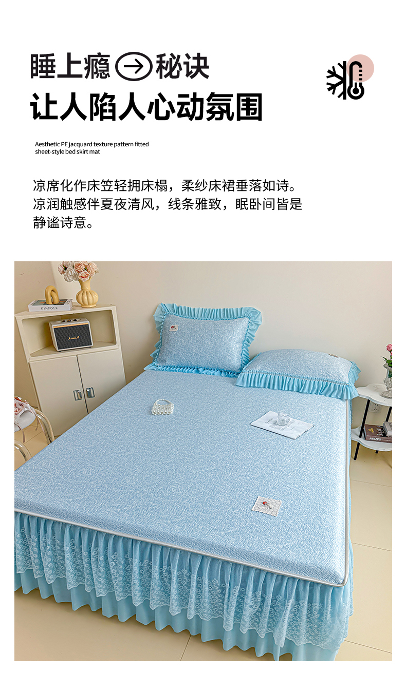 • 91家纺网 家纺一手货源 找家纺 情恒家纺 2026春夏新款PE提花肌理纹床笠式床裙席凉席席子-安娜 安娜-晚安蓝