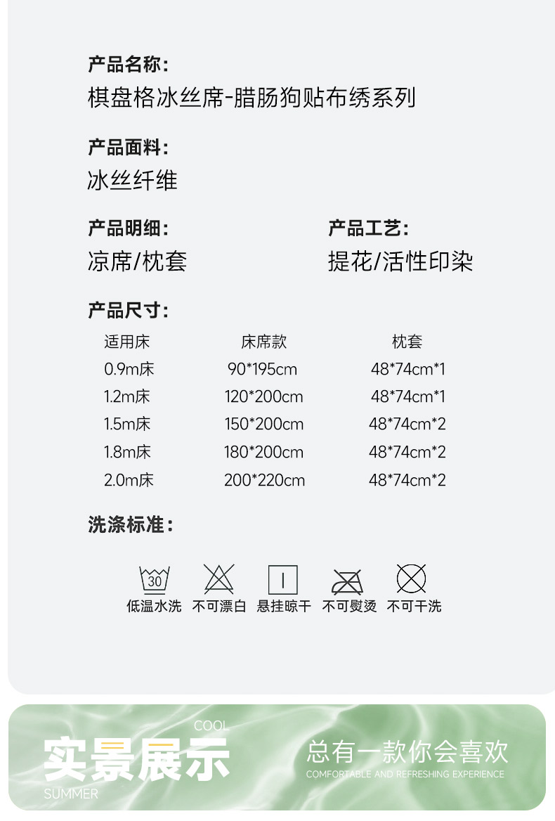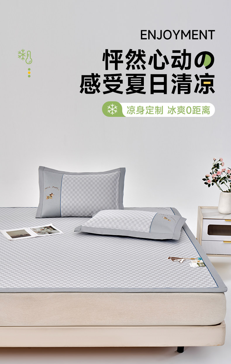 商品名称:小牛席业 2026新款棋盘格冰丝席(腊肠狗贴布绣)凉席三件套-床席款 腊肠狗贴布绣-灰色