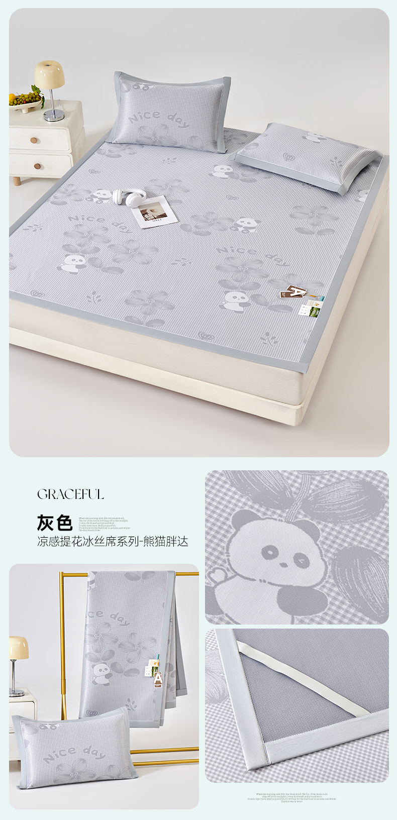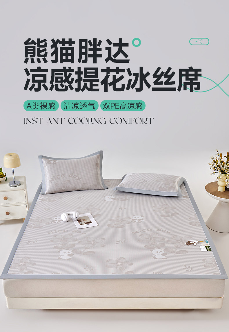 (总)小牛席业 2026新款胖达凉感提花冰丝席席子凉席-床笠款,粉色,灰色,蓝色,香槟