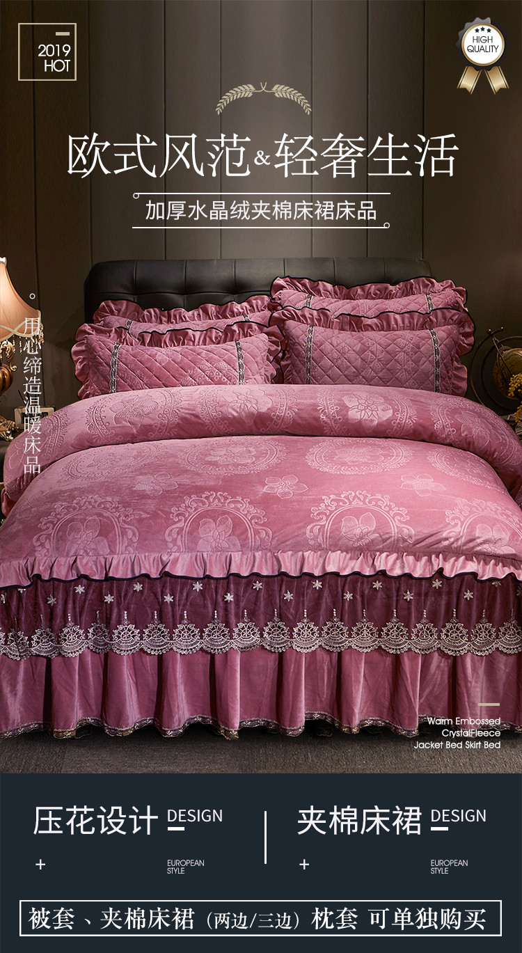 宜凡家纺 2019新款水晶绒夹棉床裙四件套 花之都-浅豆沙