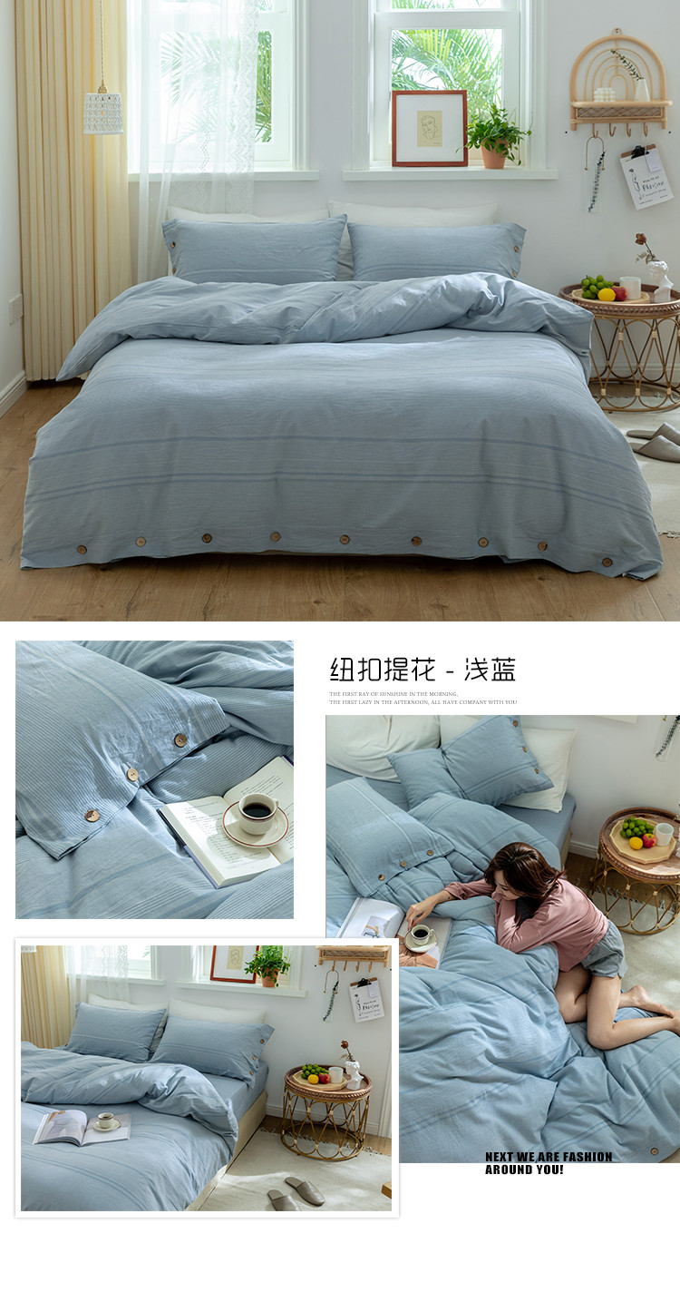 当前位置: 91家纺网 > 商品网购 > 床品套件 > 四件套 > 水洗棉四件套 > 华超针织 2021新款水洗棉提花纽扣款四件套 提花纽扣款 浅蓝