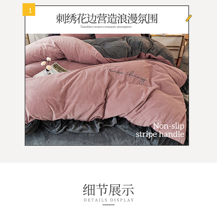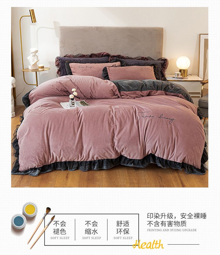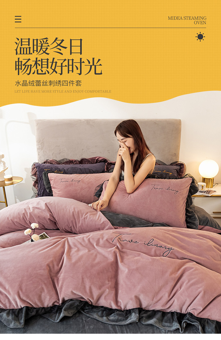 商品名称:蓝巢 2020新款水晶绒蕾丝边四件套 绒-豆沙深灰