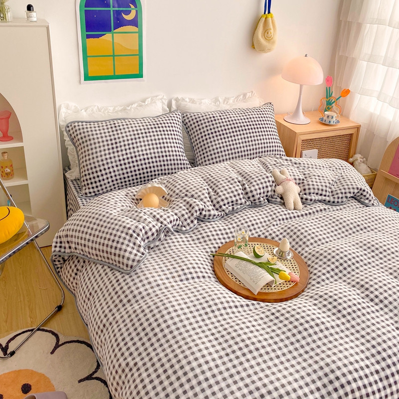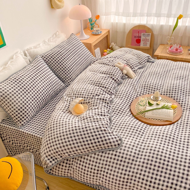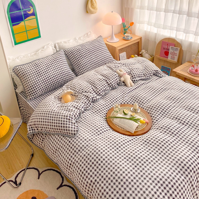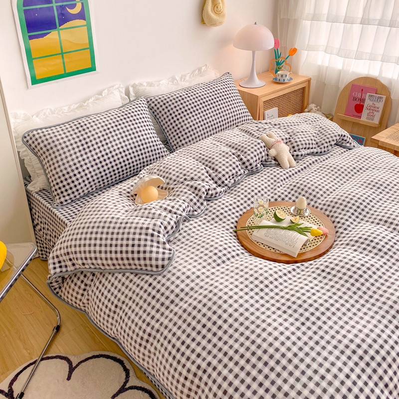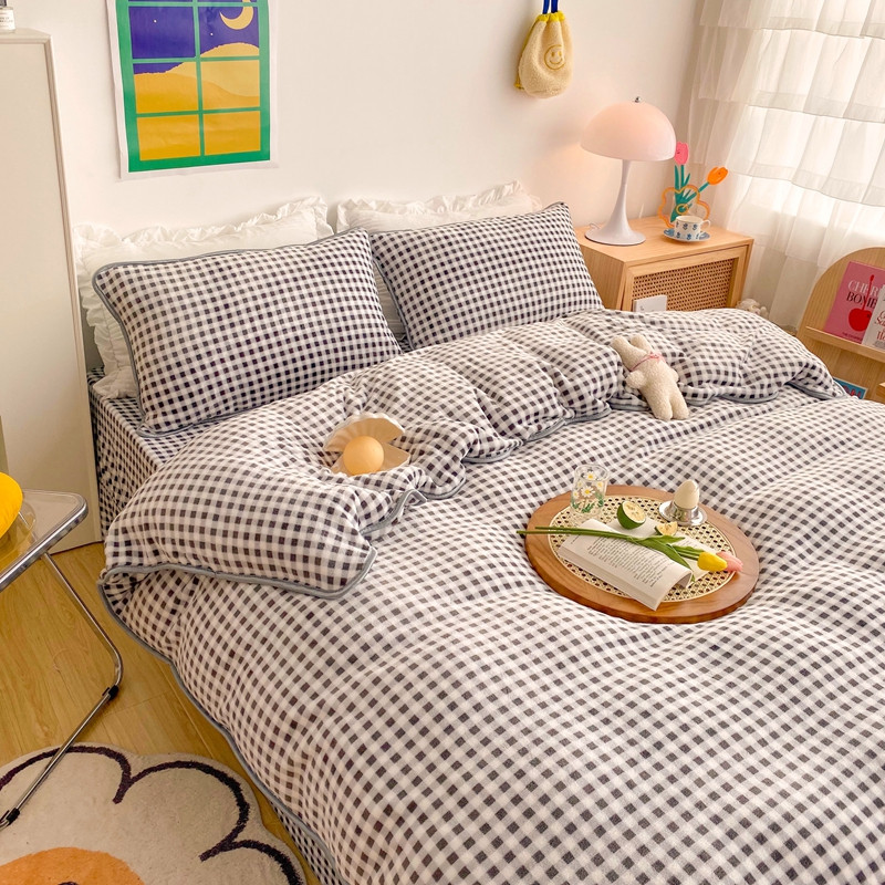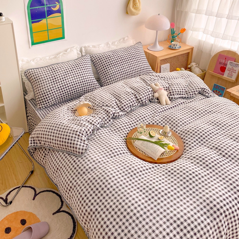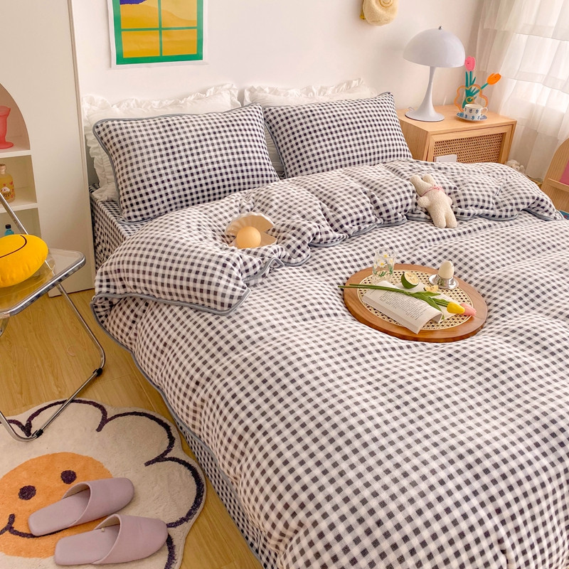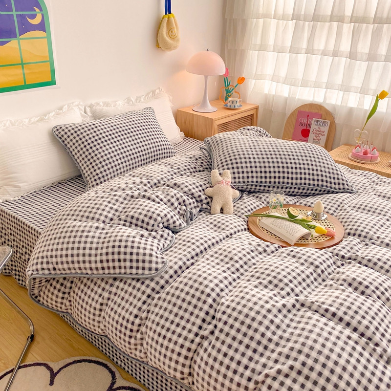 (总)顾里家纺 2024新款ins奶萌格子狗狗毛巾绣牛奶绒四件套,粉格小狗,黄格小狗,咖格小狗,蓝格小狗,绿格小狗