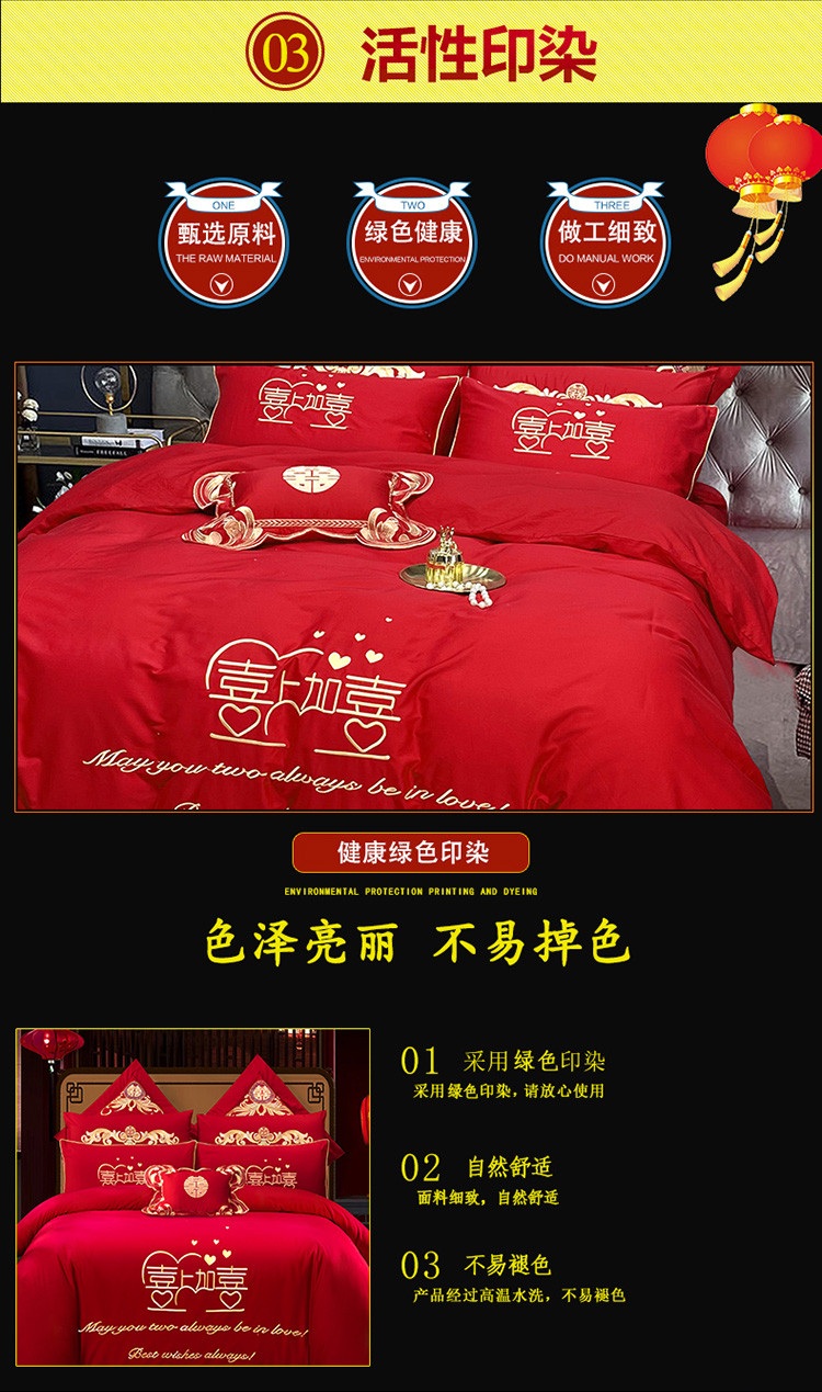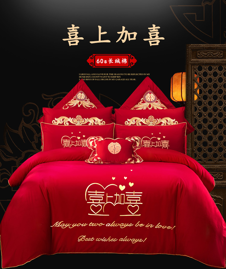 当前位置: 91家纺网 > 商品网购 > 床品套件 > 四件套 > 长绒棉四件套 > 慕她 婚庆四件套大红色60支长绒棉结婚全棉纯棉多件套喜上加喜