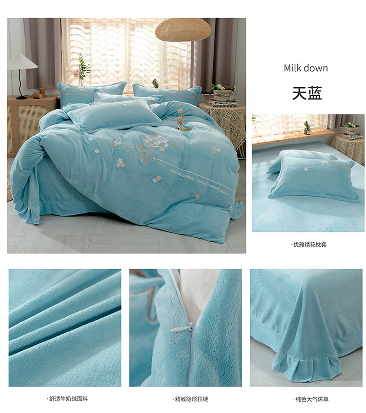 (总)佳梦家纺 2021新款牛奶绒刺绣四件套,湖蓝,浅绿,天蓝