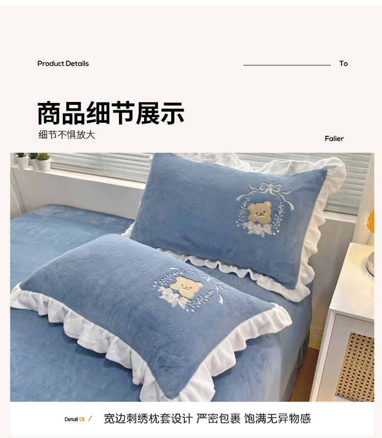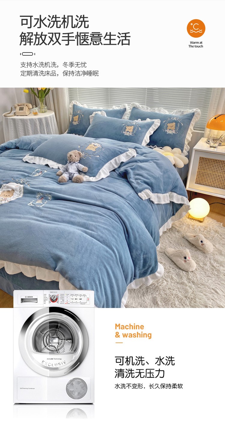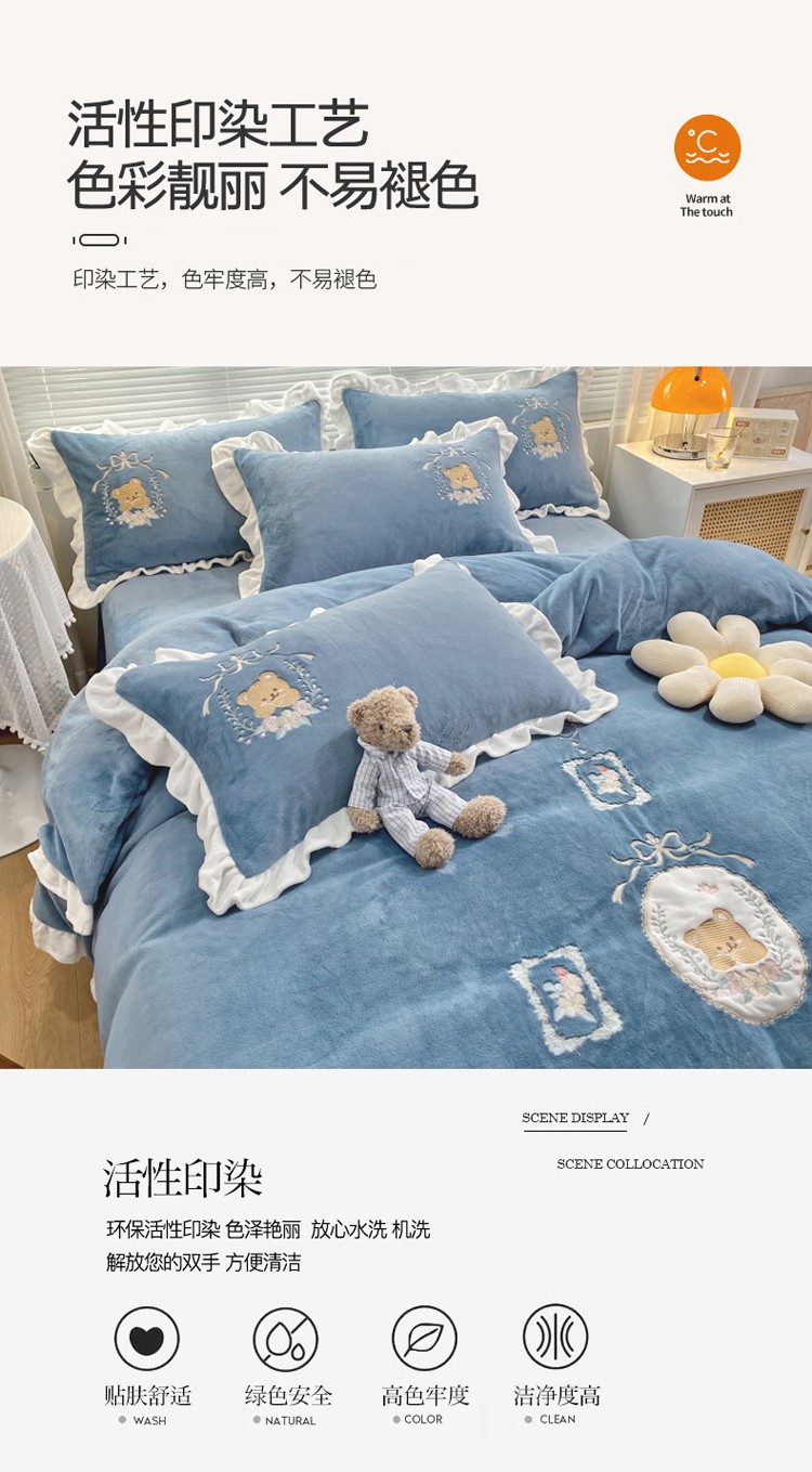 商品名称:星尚 高品质牛奶绒绣花四件套加厚法莱宝宝婴儿绒-乖乖熊 浅蓝