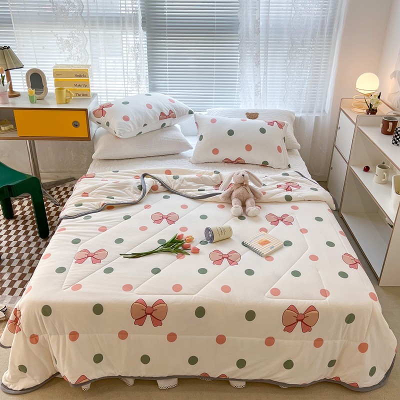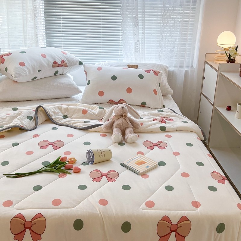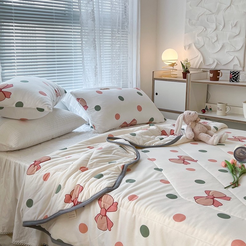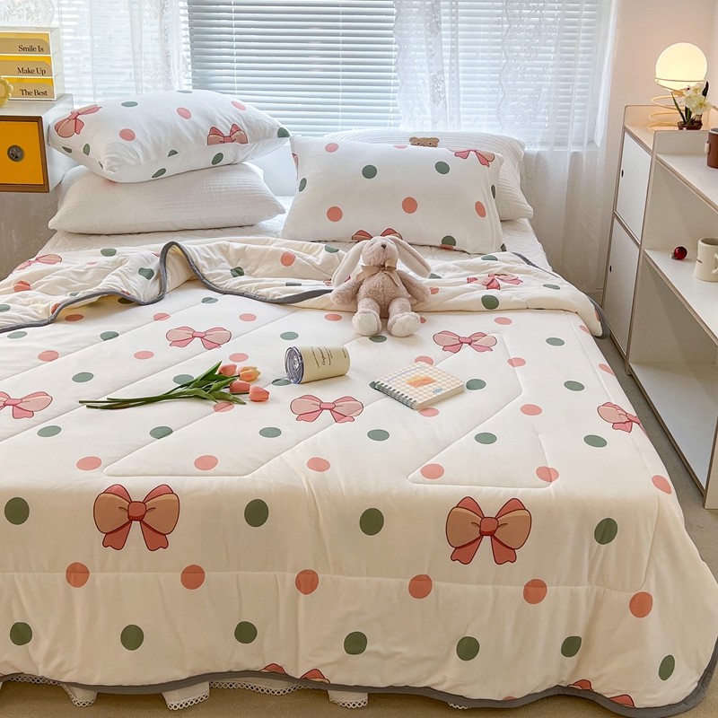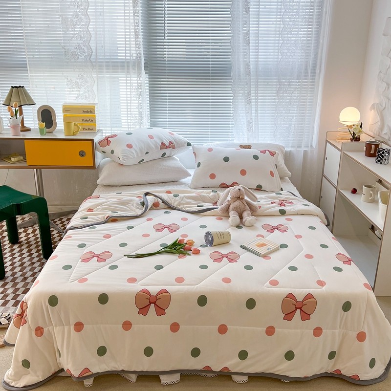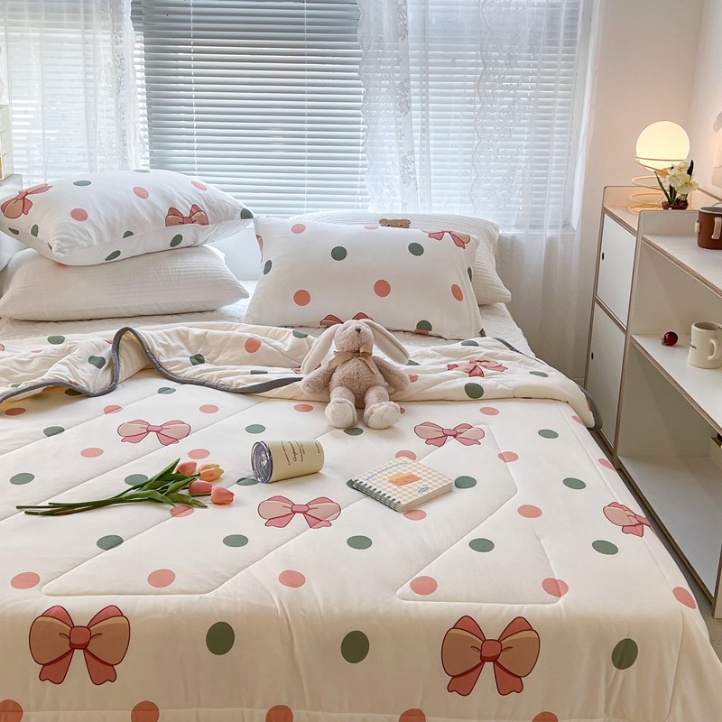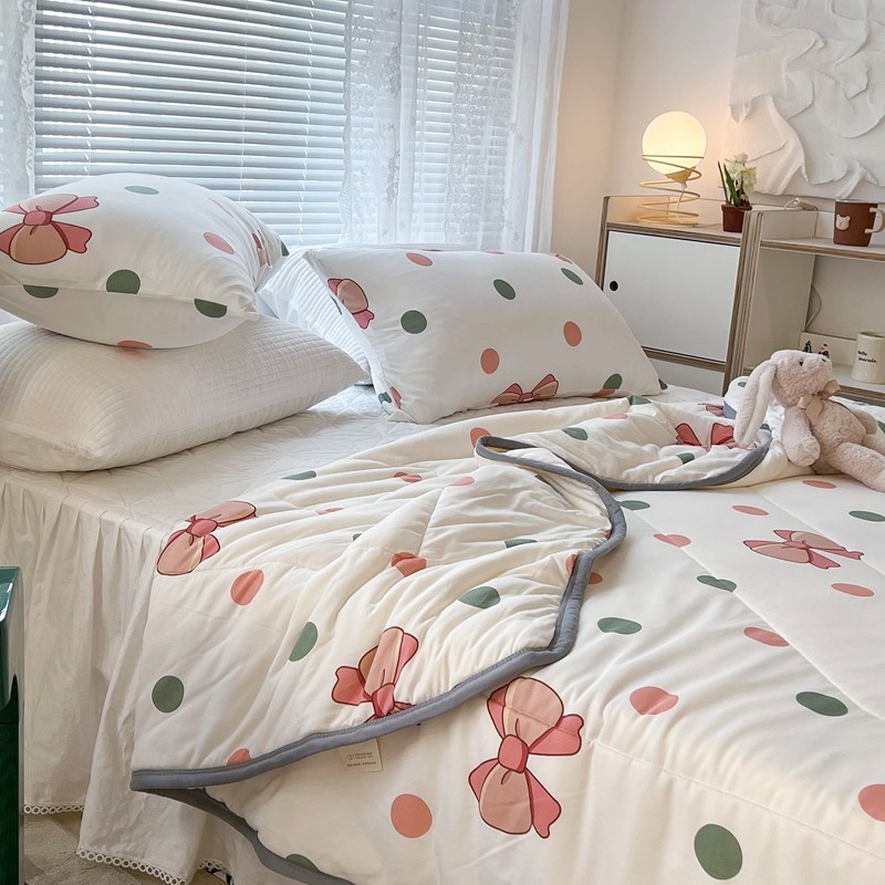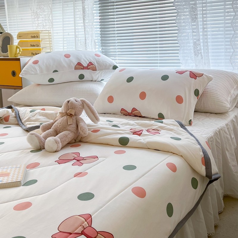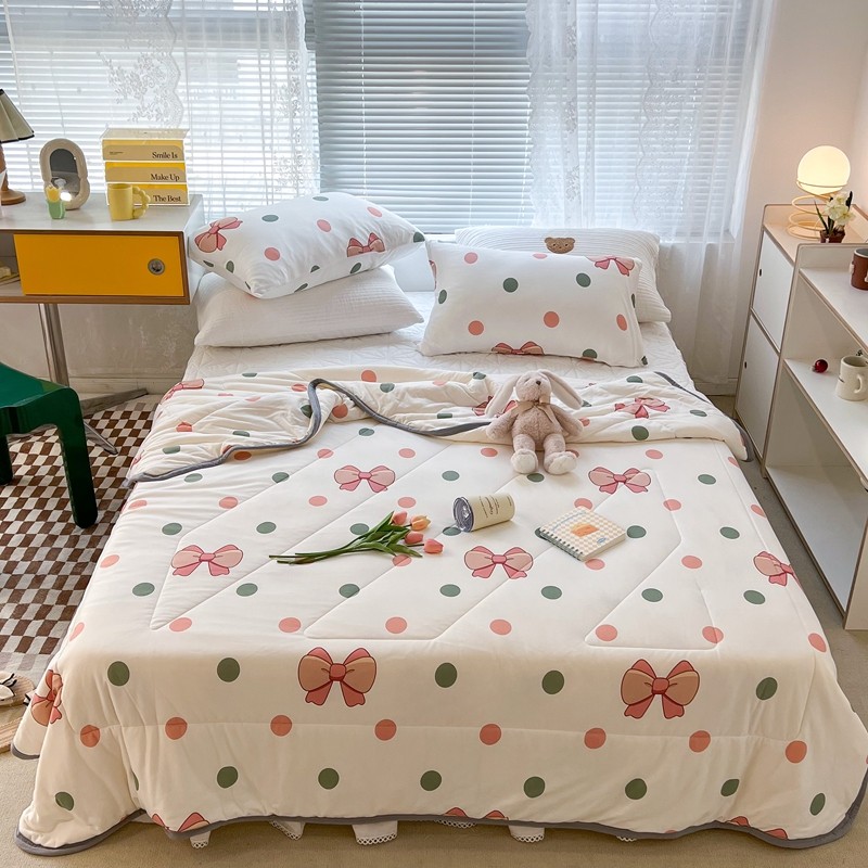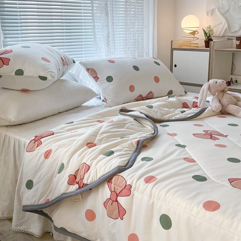 商品名称:昔可 2022新款包边牛奶丝针织夏被 粉绿波点蝴蝶结