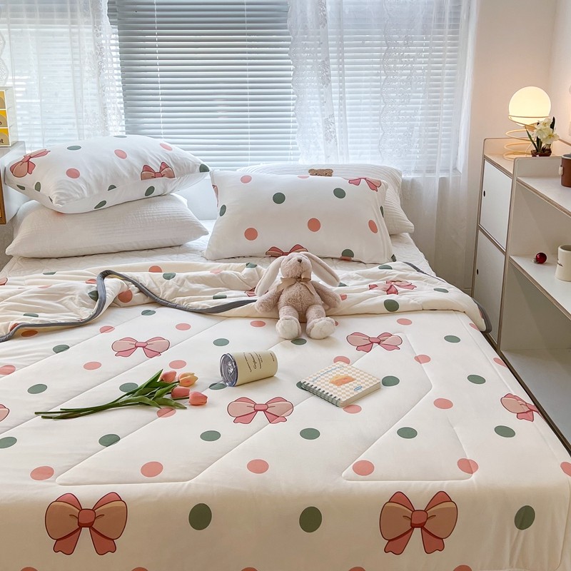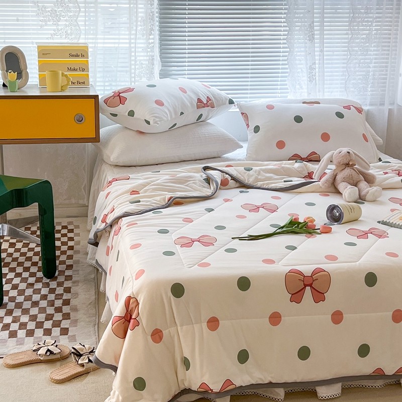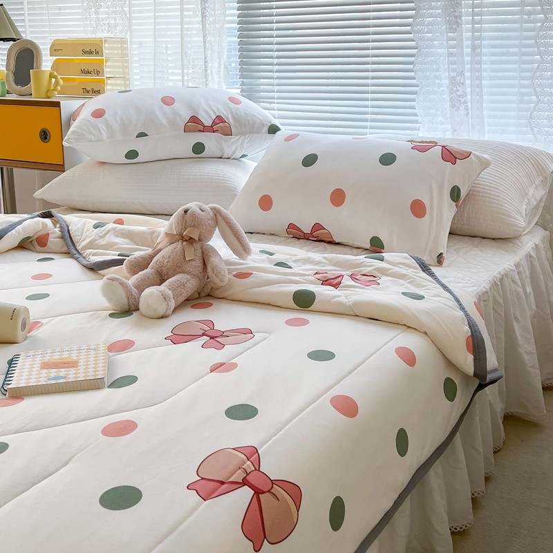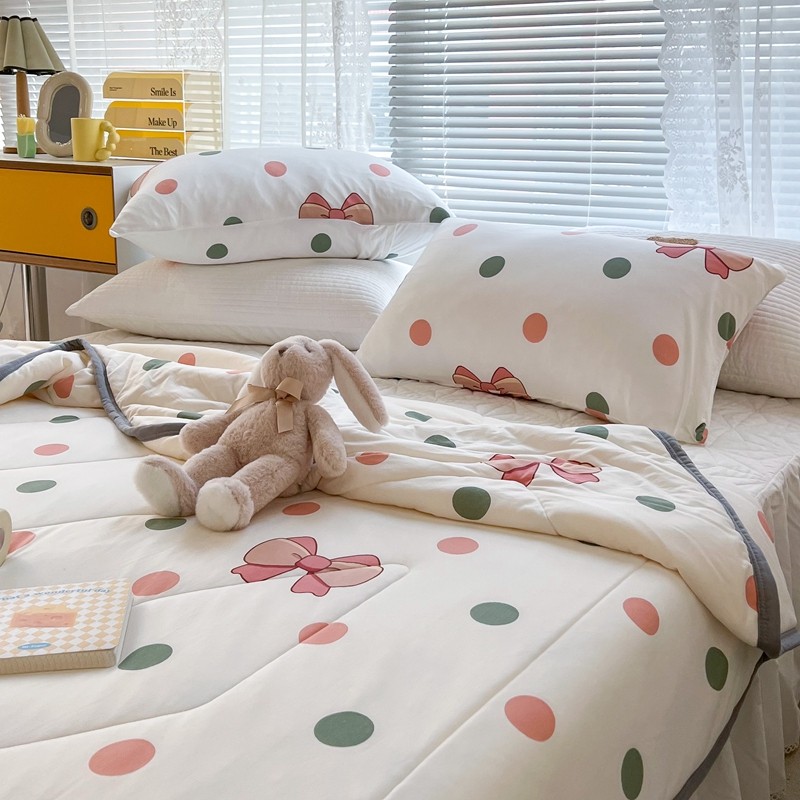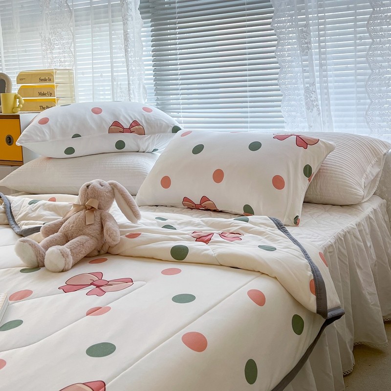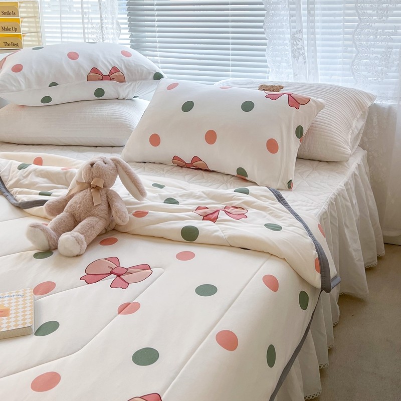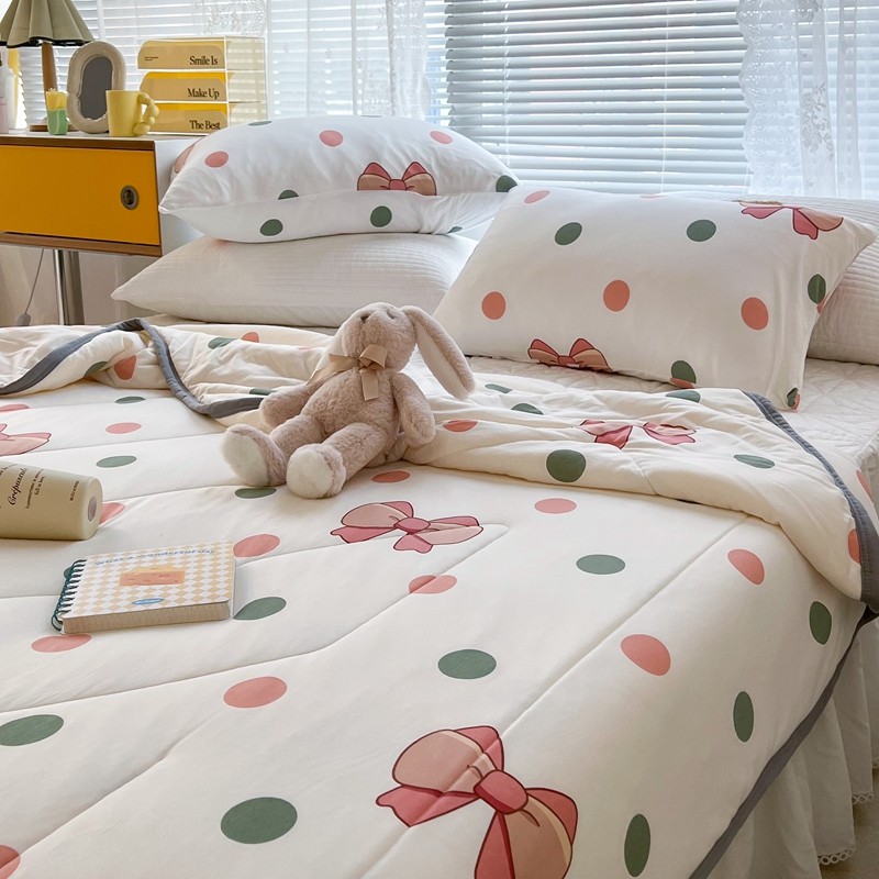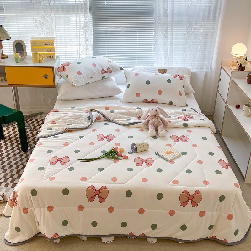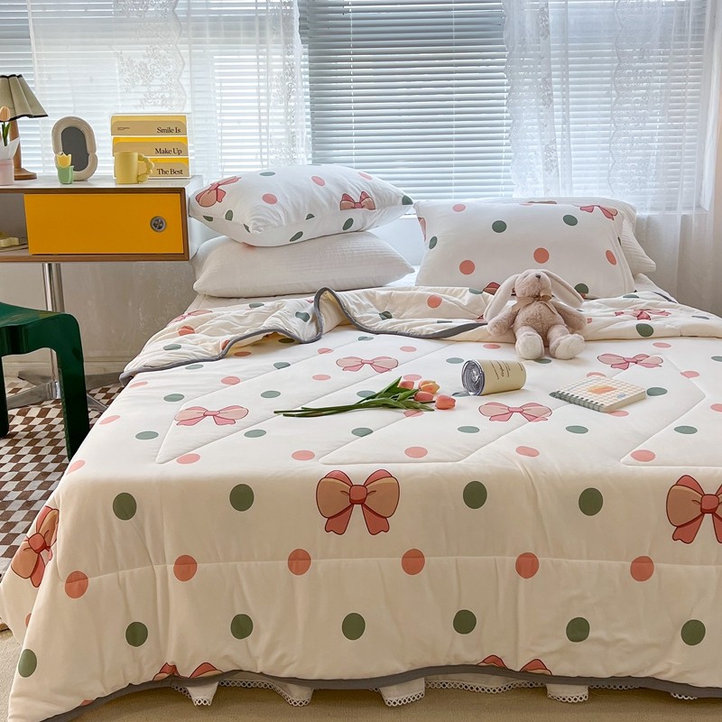 商品名称:昔可 2022新款包边牛奶丝针织夏被 粉绿波点蝴蝶结