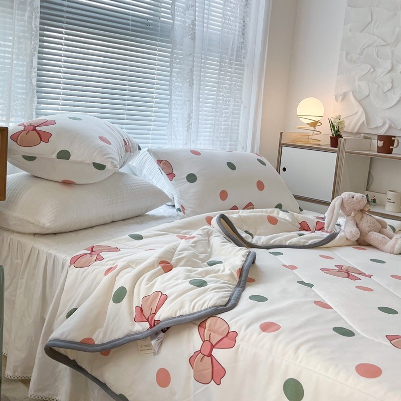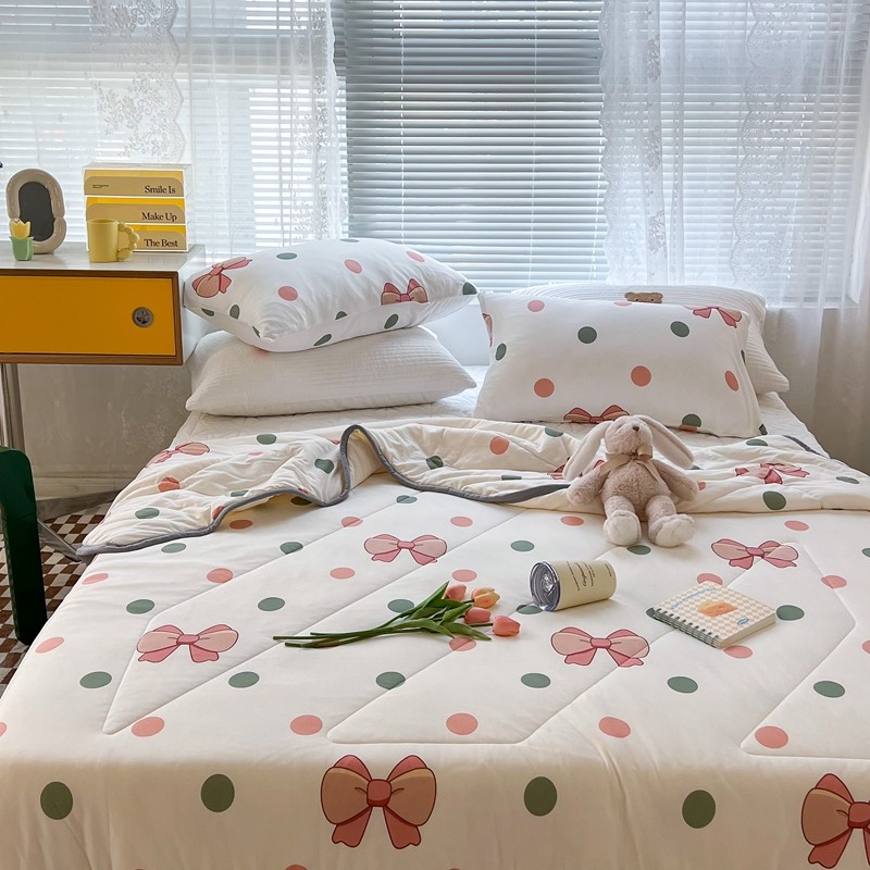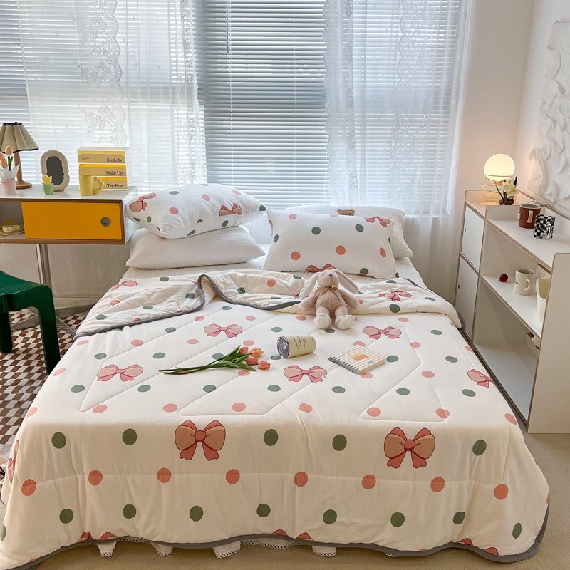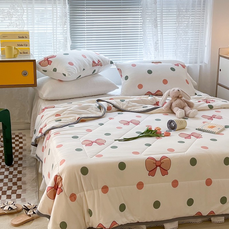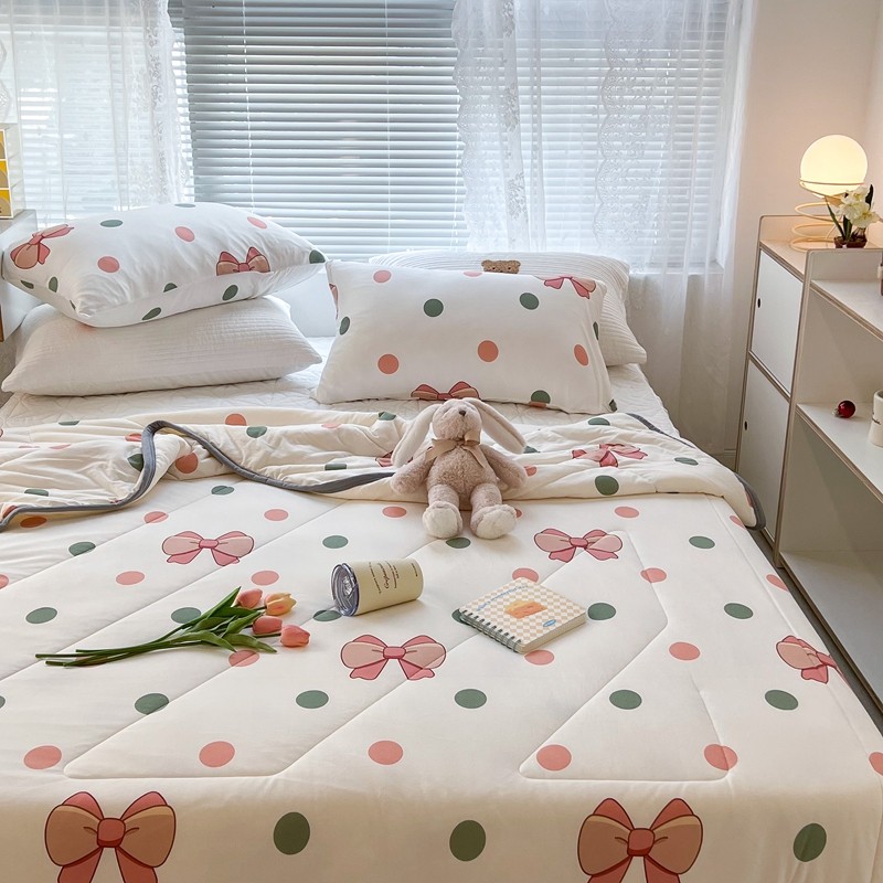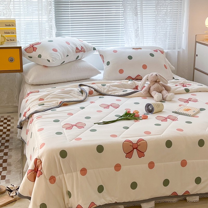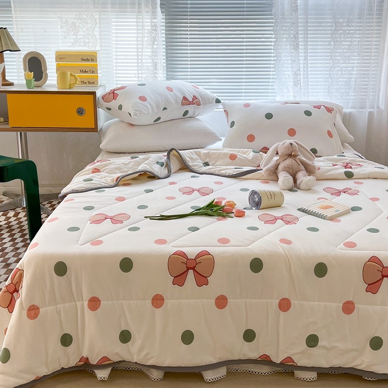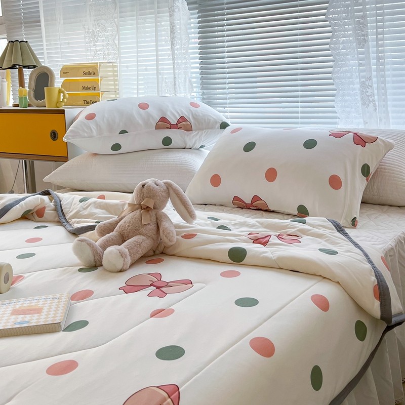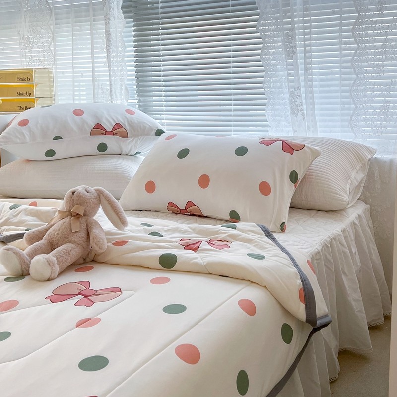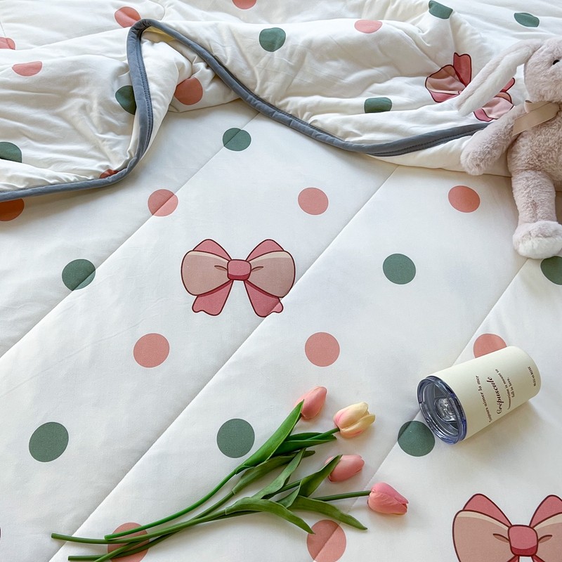 商品名称:昔可 2022新款包边牛奶丝针织夏被 粉绿波点蝴蝶结