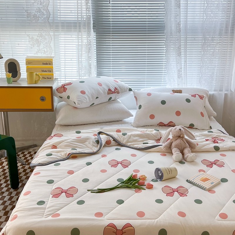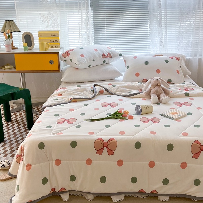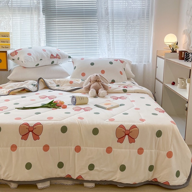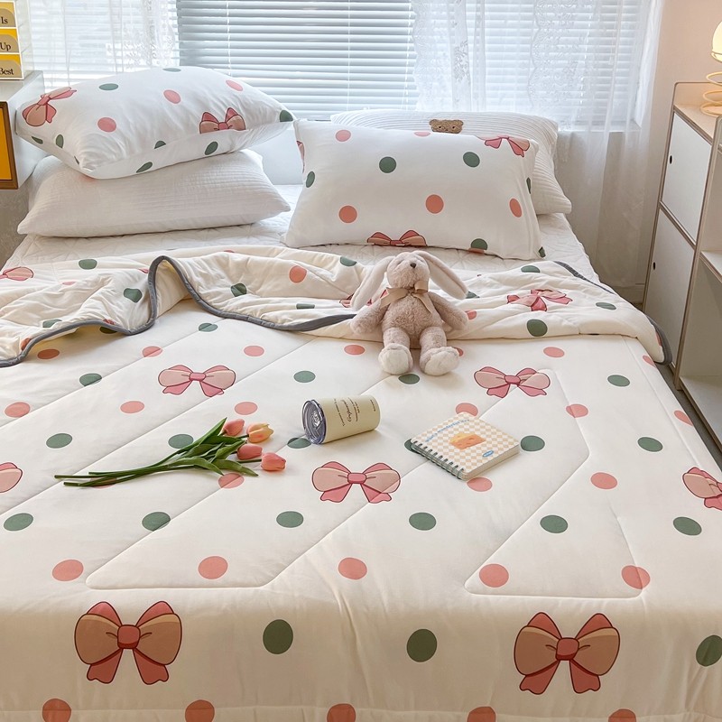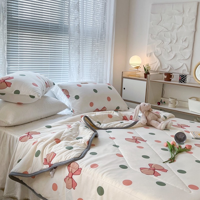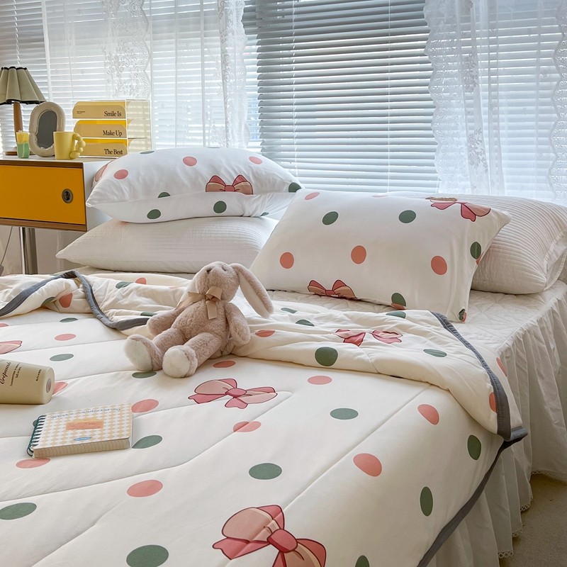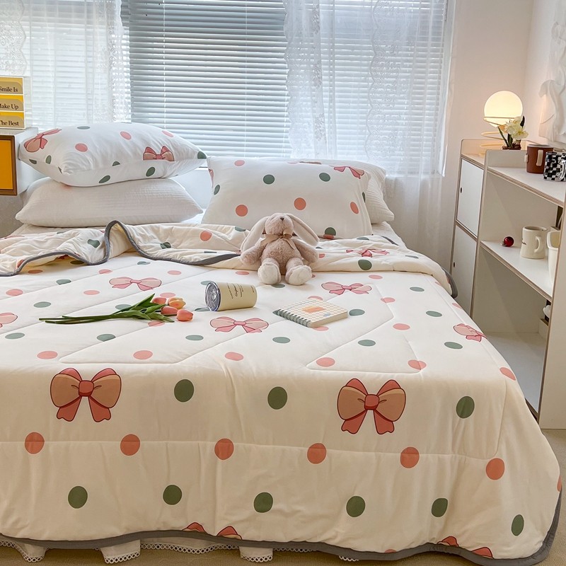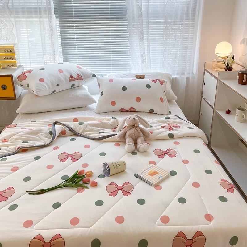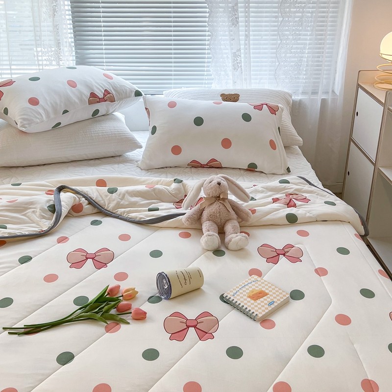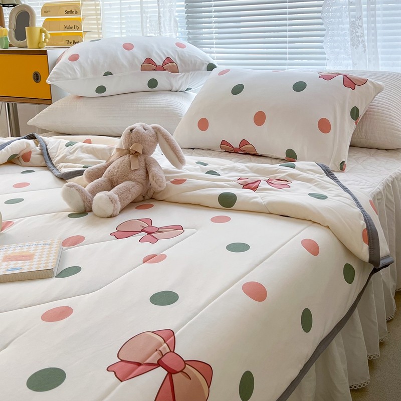 商品名称:昔可 2022新款包边牛奶丝针织夏被 粉绿波点蝴蝶结
