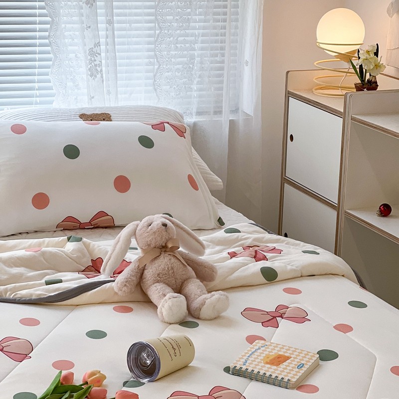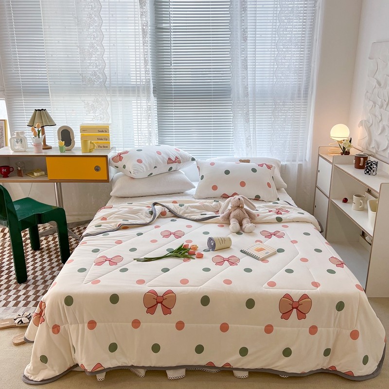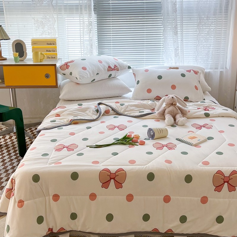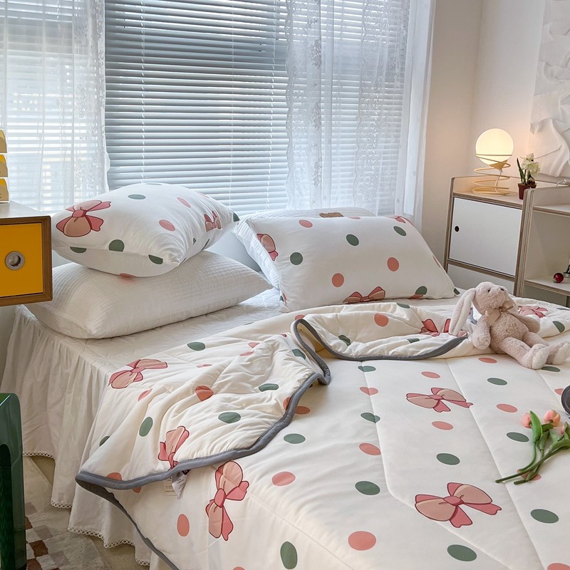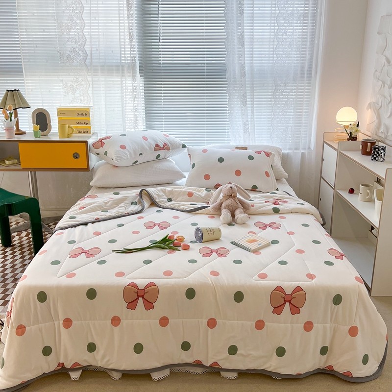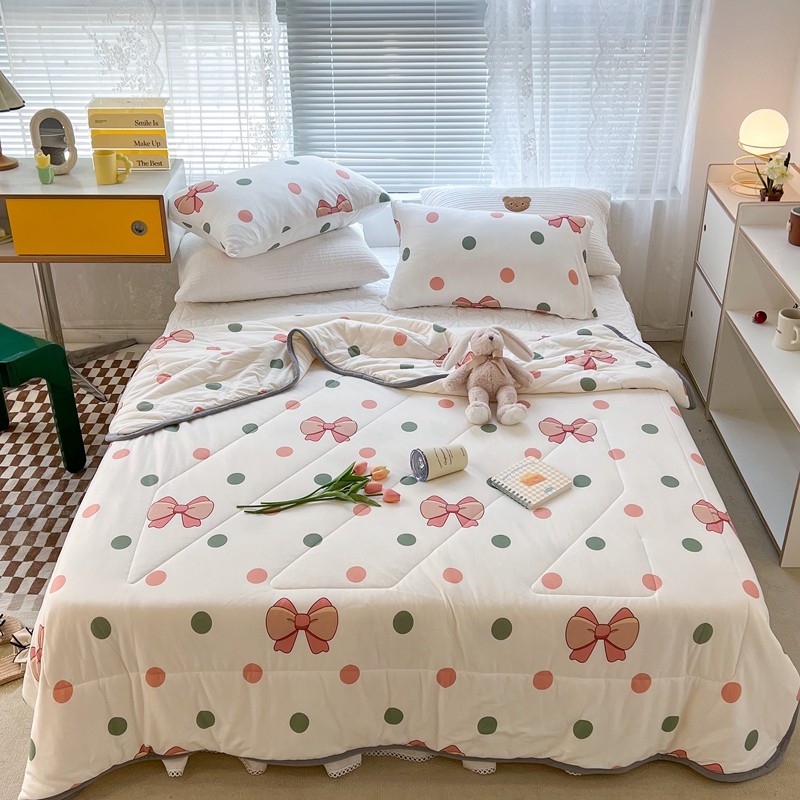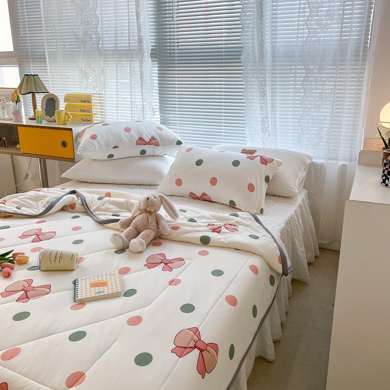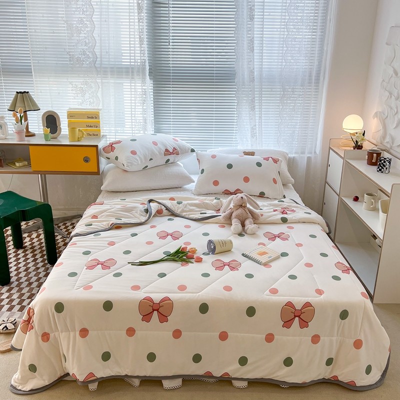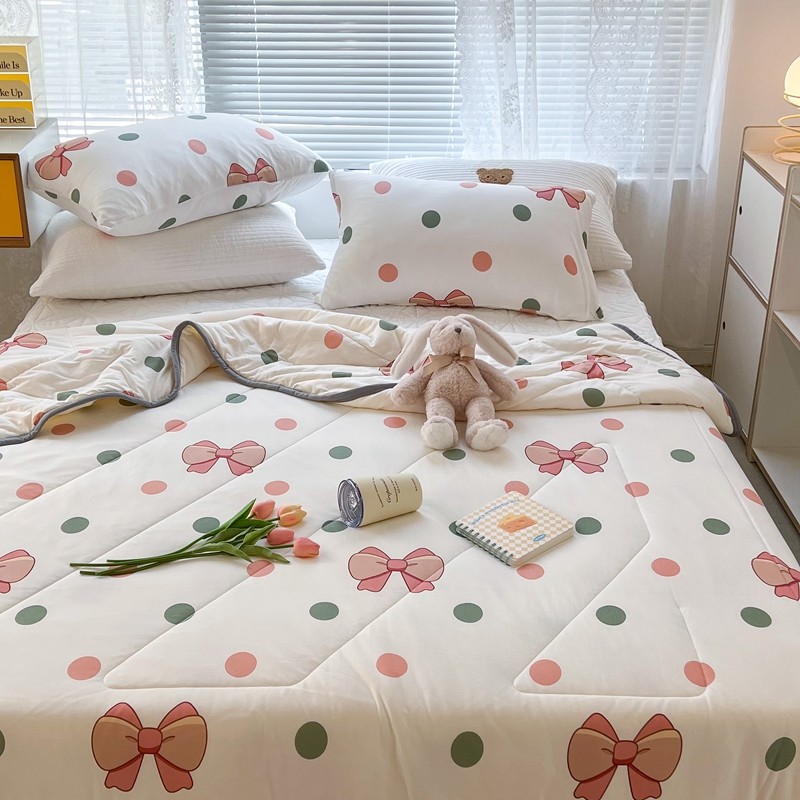 商品名称:昔可 2022新款包边牛奶丝针织夏被 粉绿波点蝴蝶结