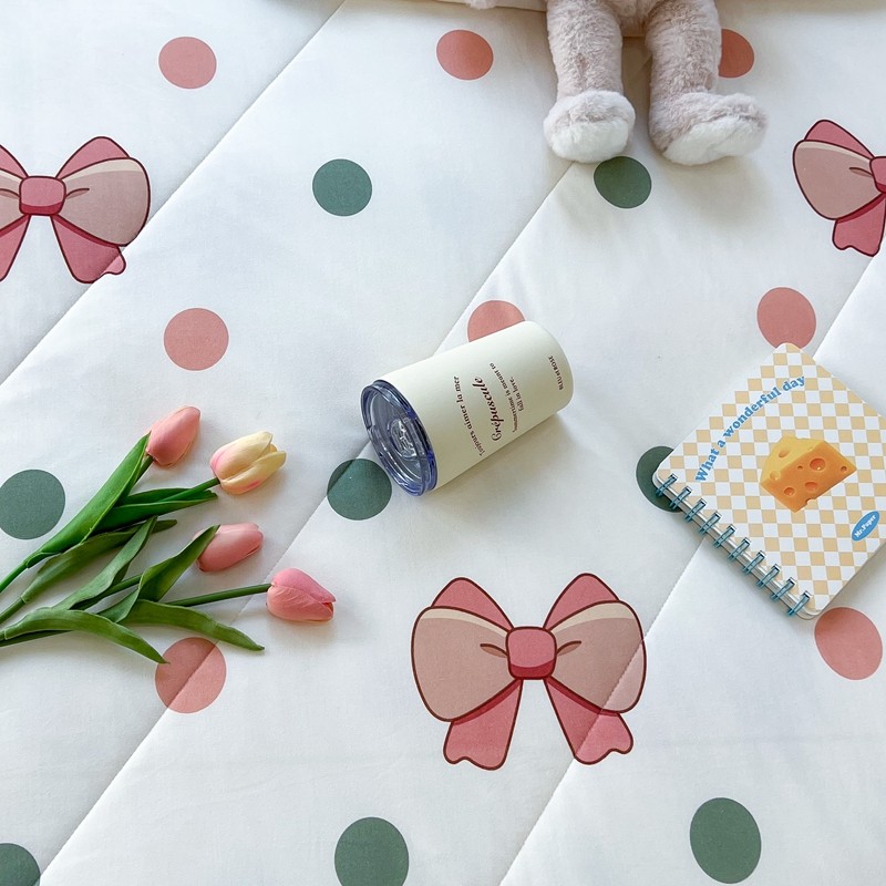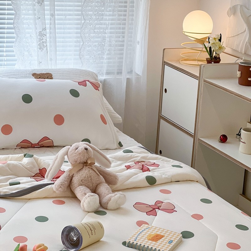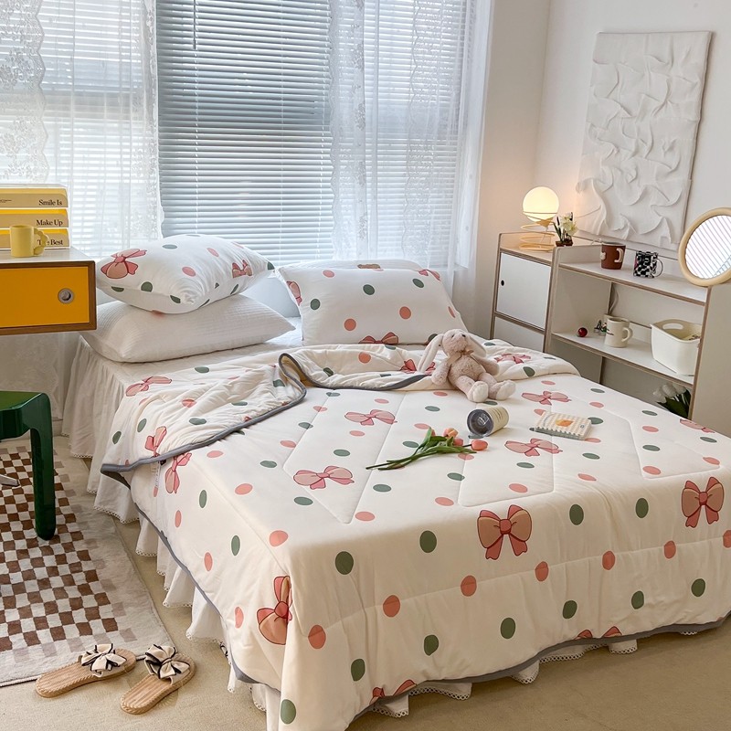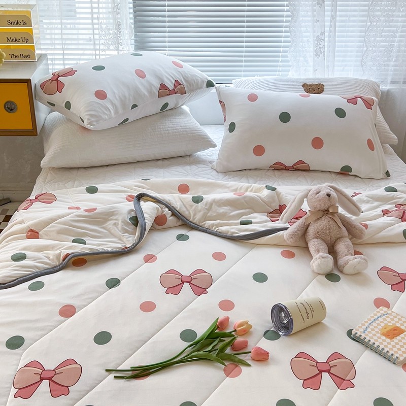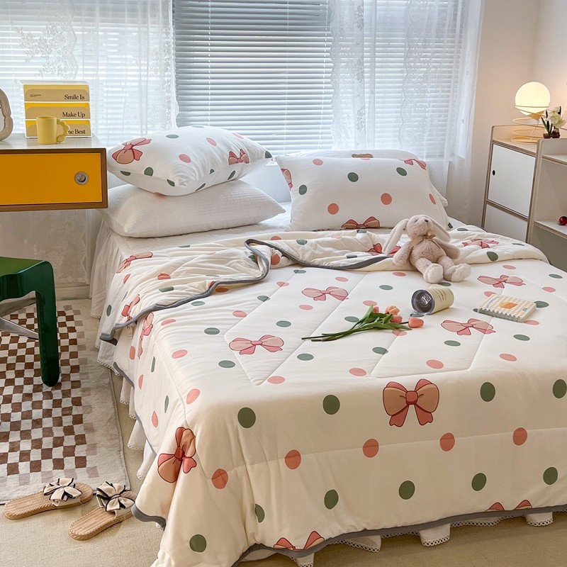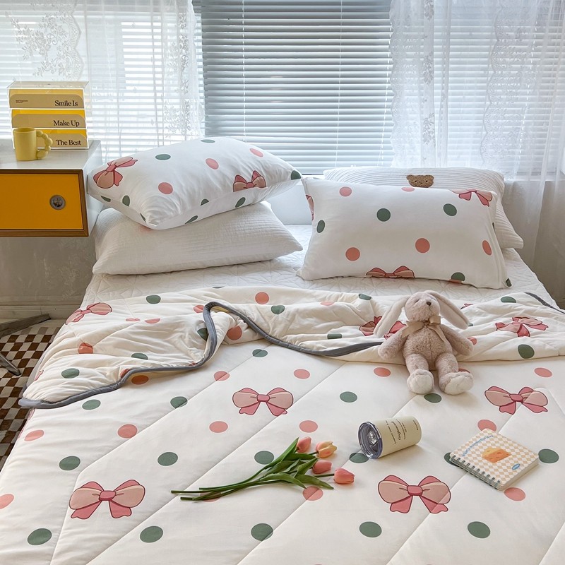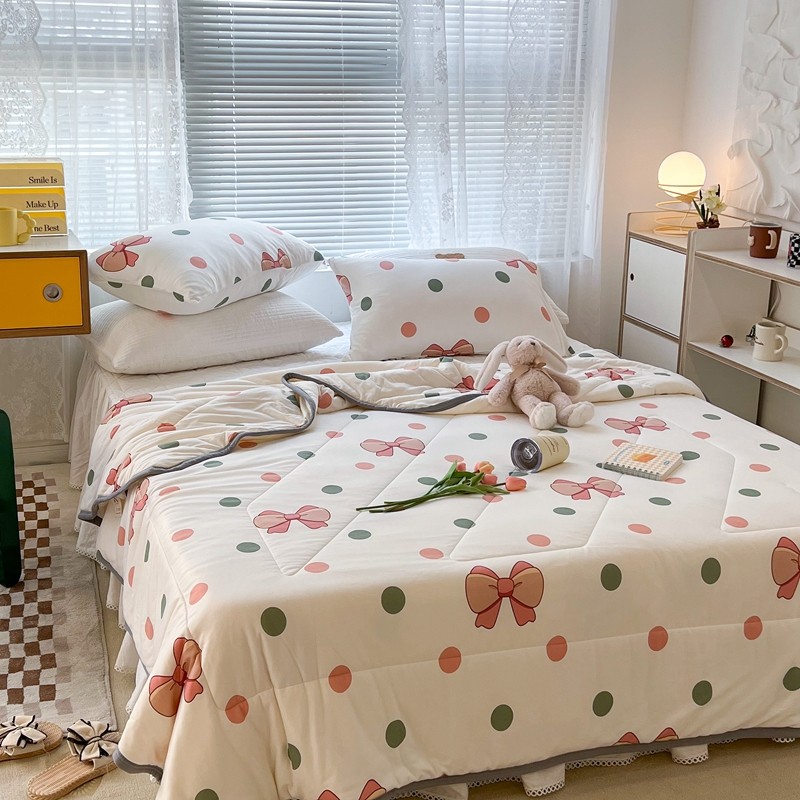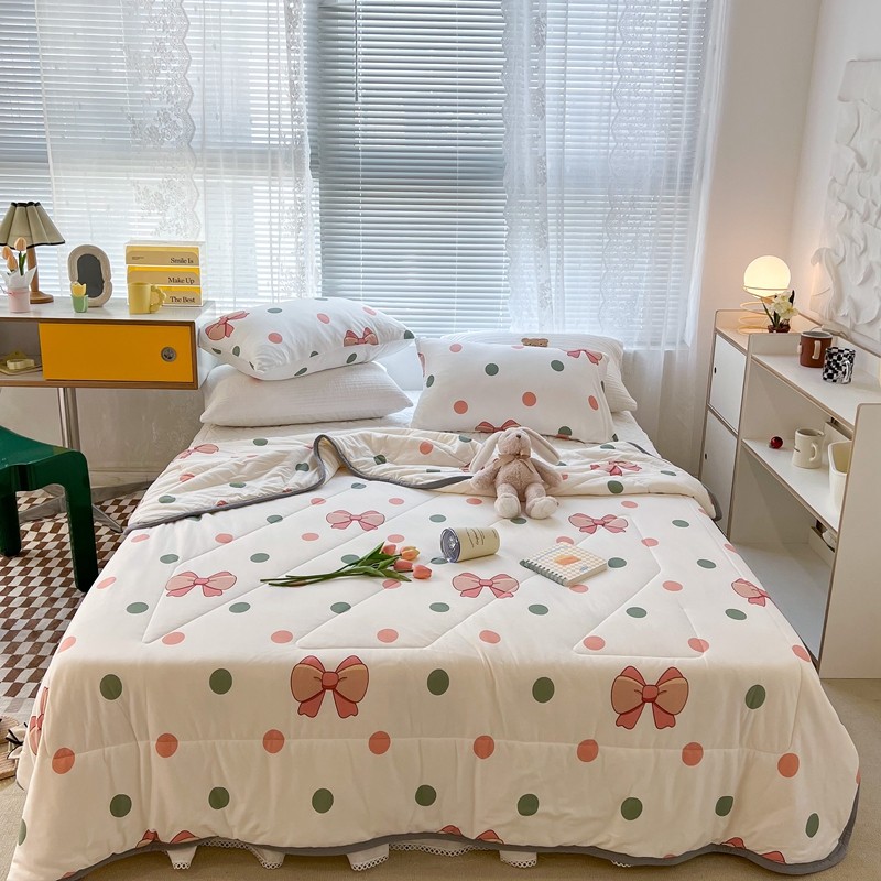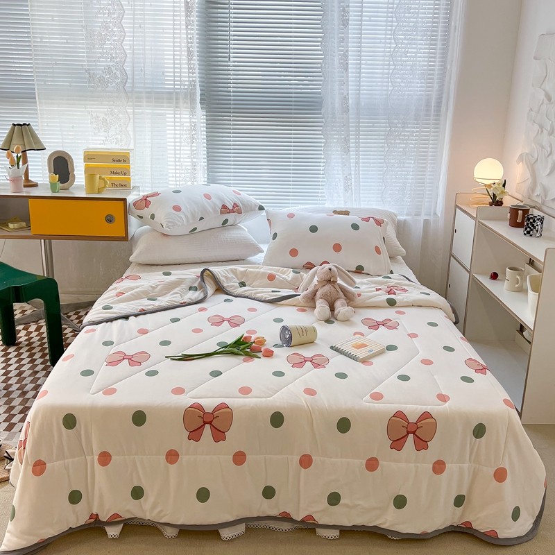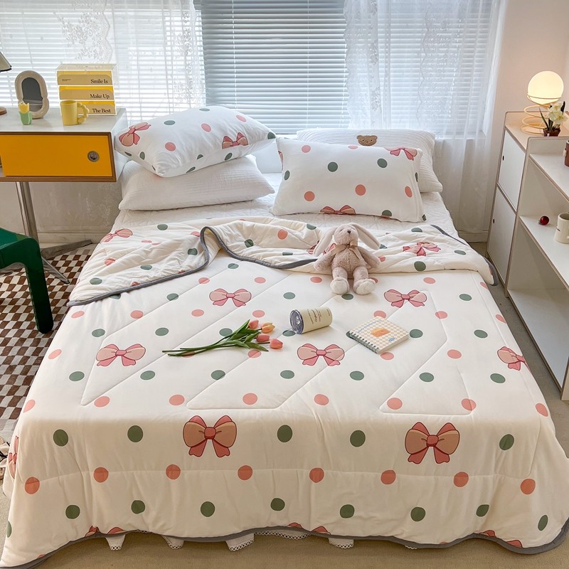商品名称:昔可 2022新款包边牛奶丝针织夏被 粉绿波点蝴蝶结