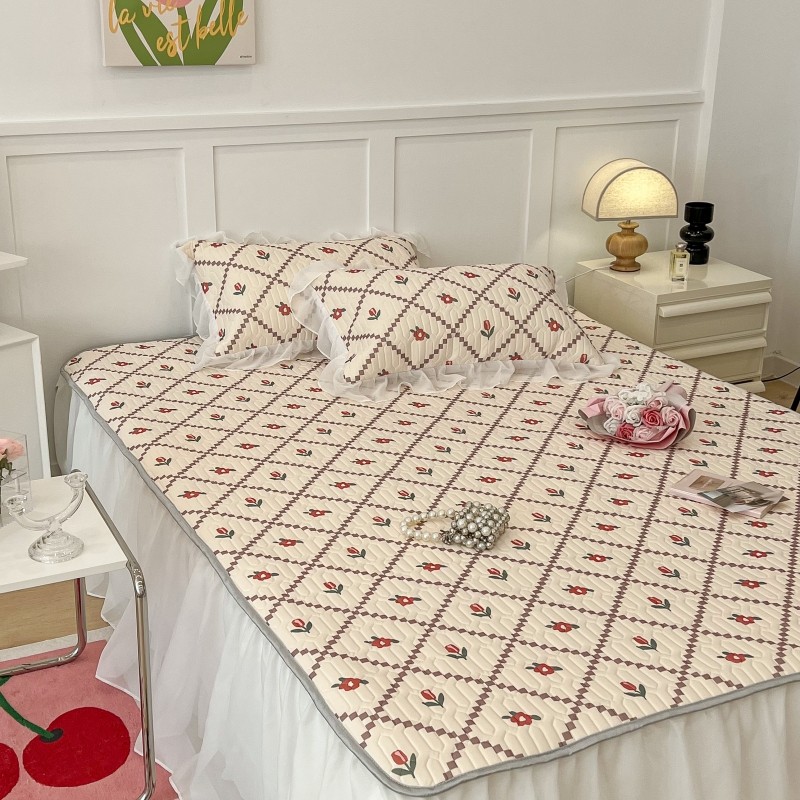 昔可 2022新款ins风小清新床裙款乳胶凉席三件套 床裙款-菱形小花红