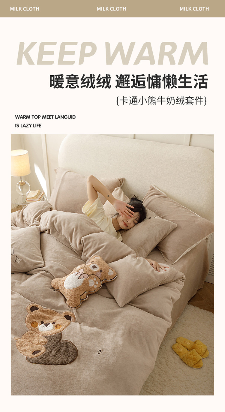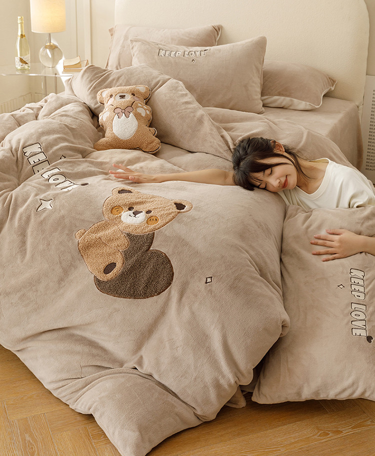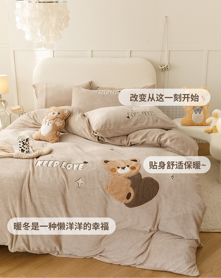 铭动 2023新款卡通小熊牛奶绒四件套 爱心熊-咖