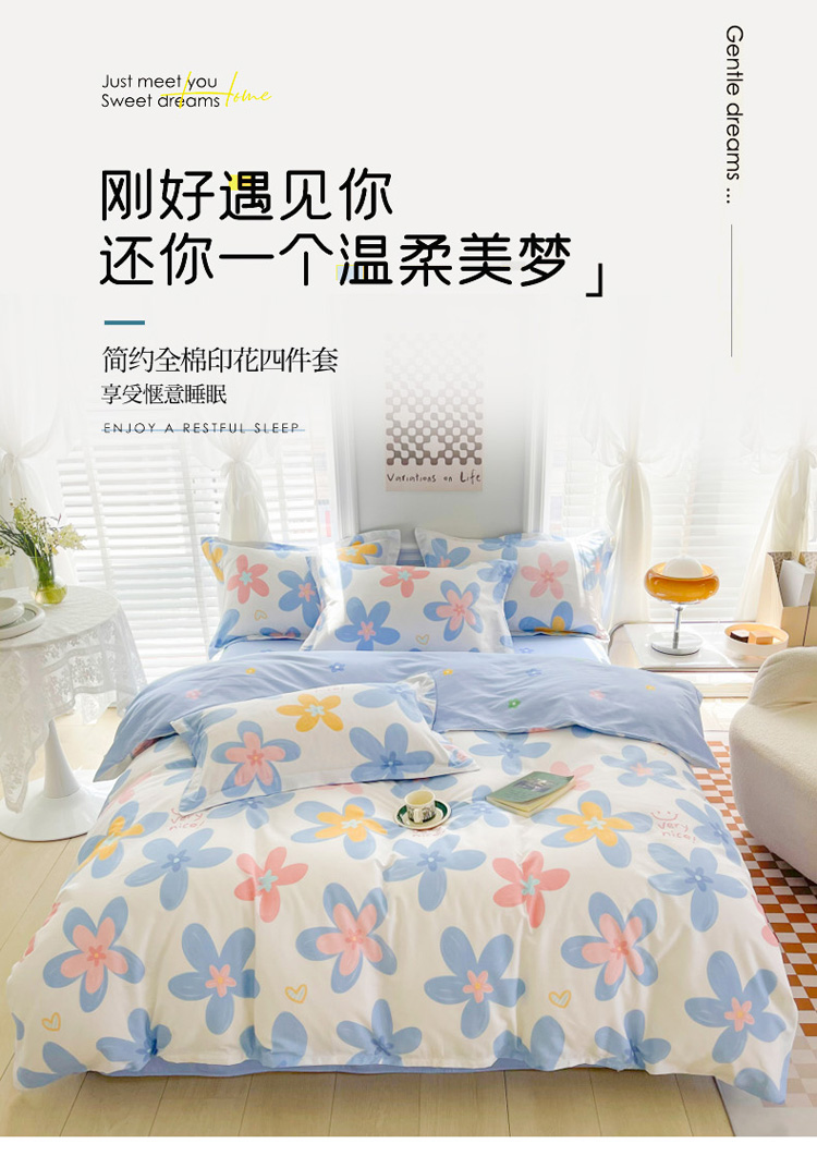 盛馨家纺 全棉ins北欧风高支高密全棉喷气小清新纯棉四件套 花海蓝