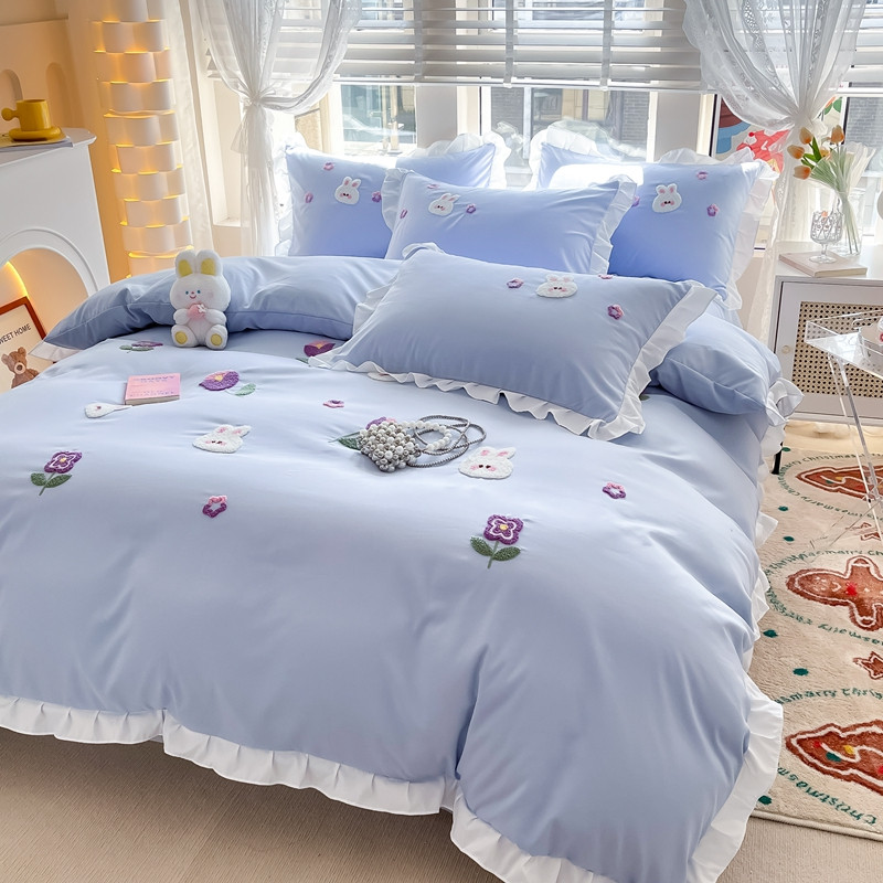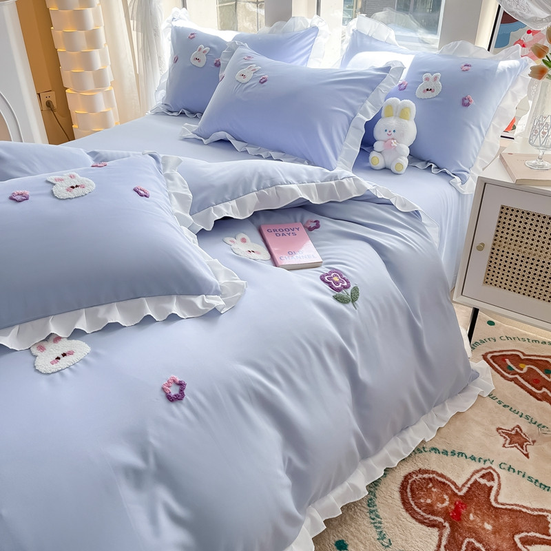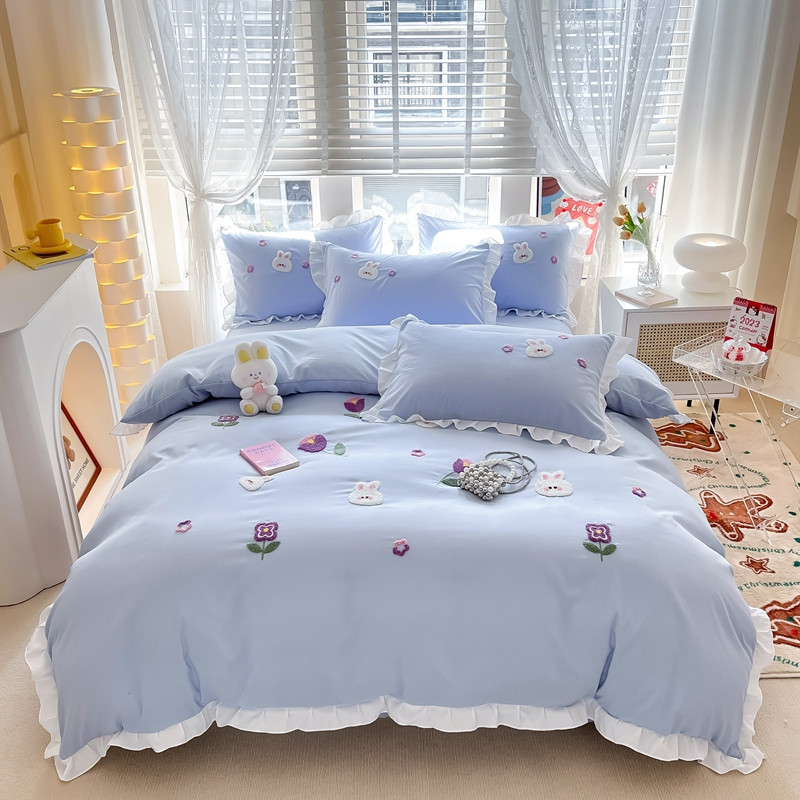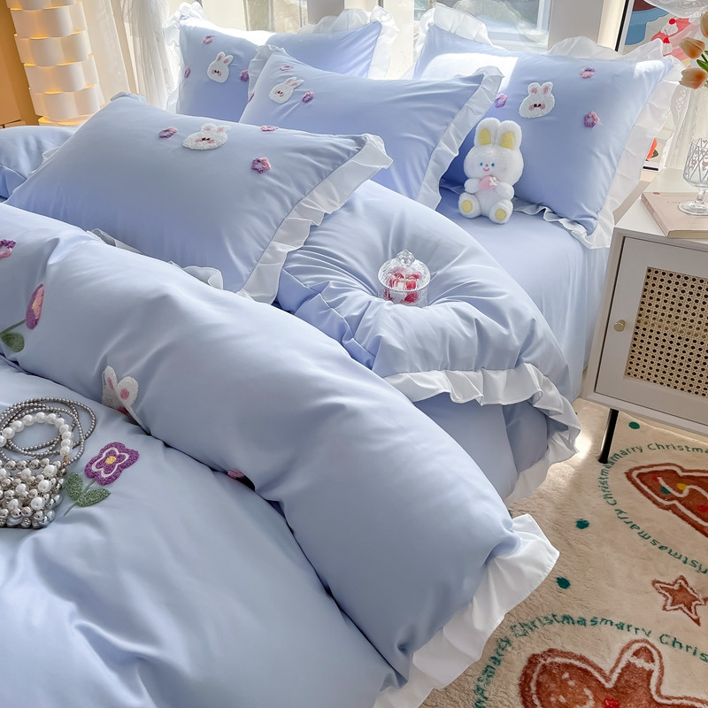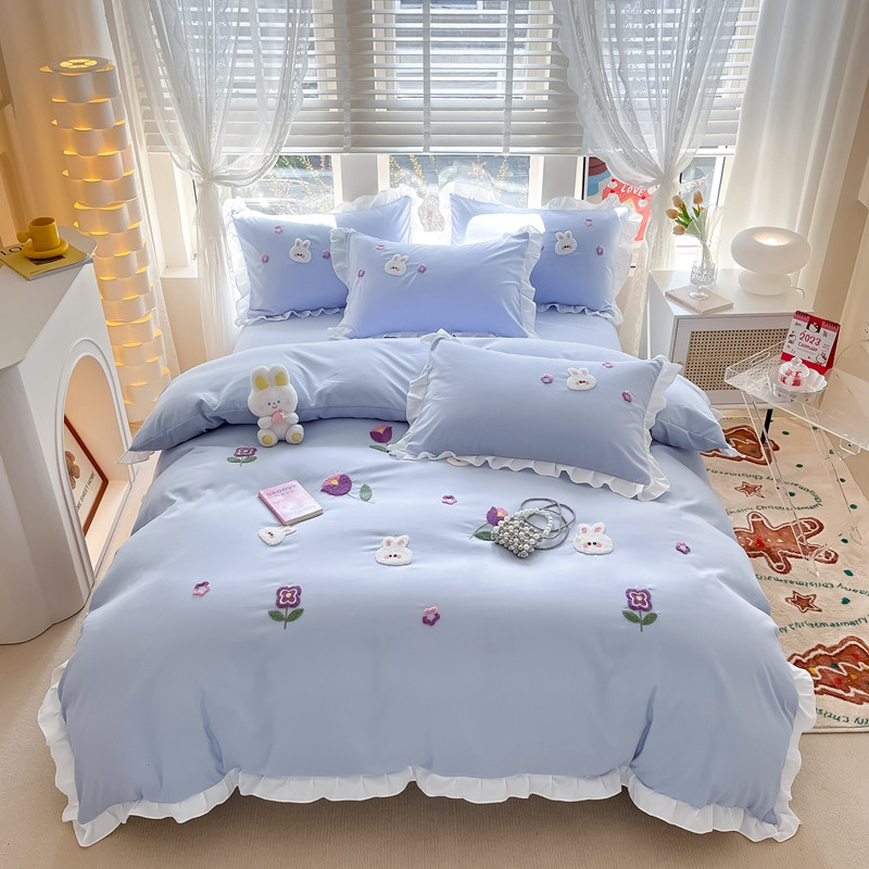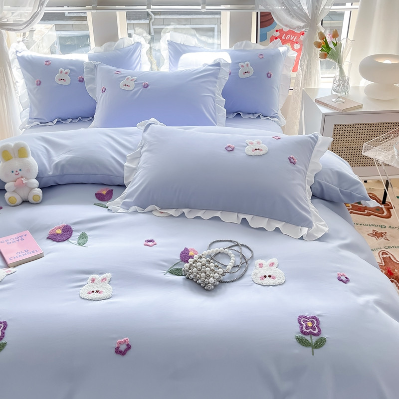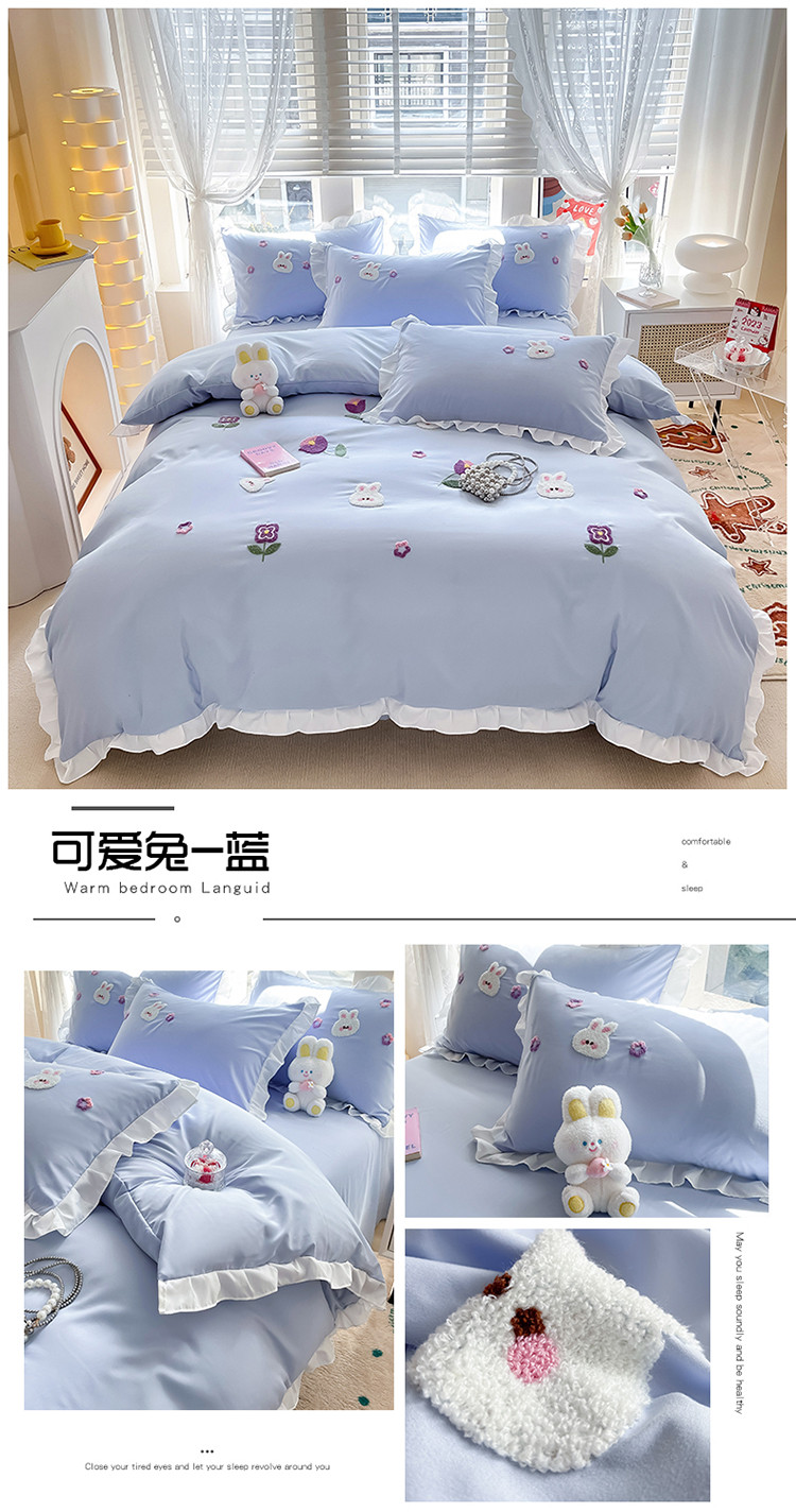 芯贝儿2023新款小清新卡通贴布绣水洗m毛巾绣花四件套 可爱兔--蓝