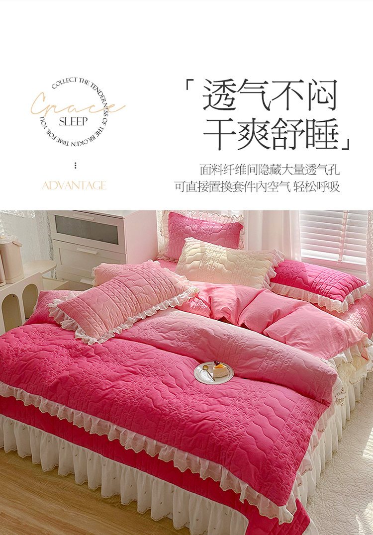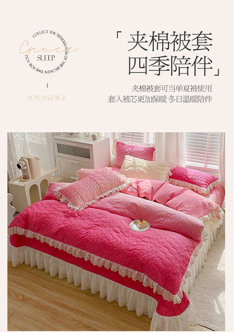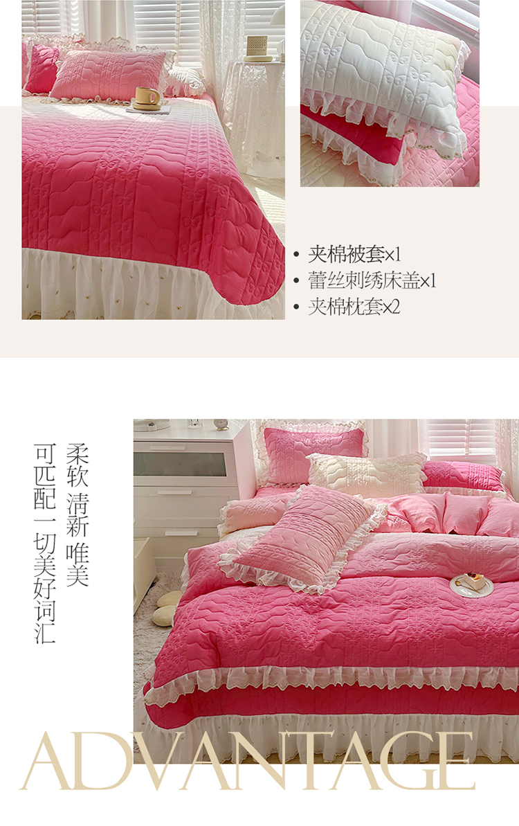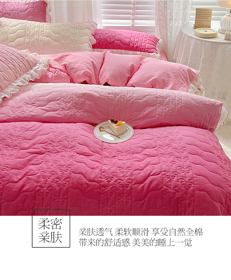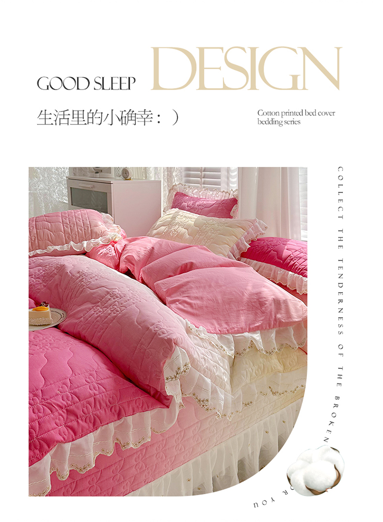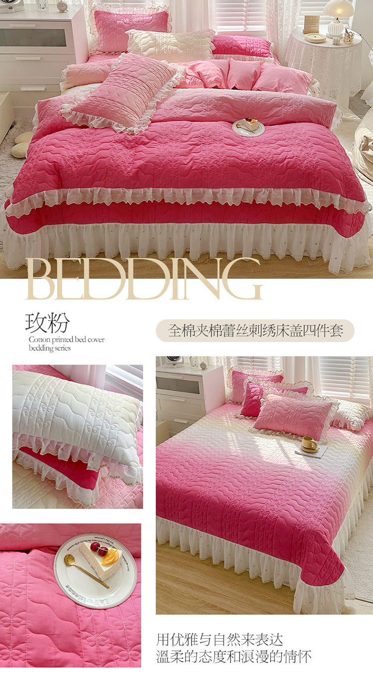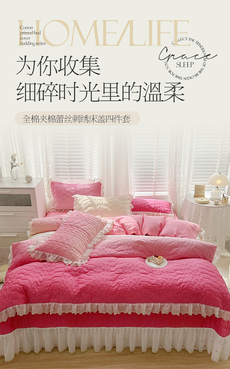 • 91家纺网 家纺一手货源 找家纺  2023新款全棉蕾丝刺绣床盖四件套(夹棉被套) 玫粉