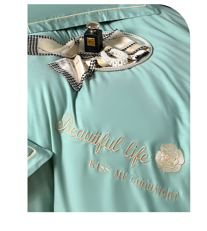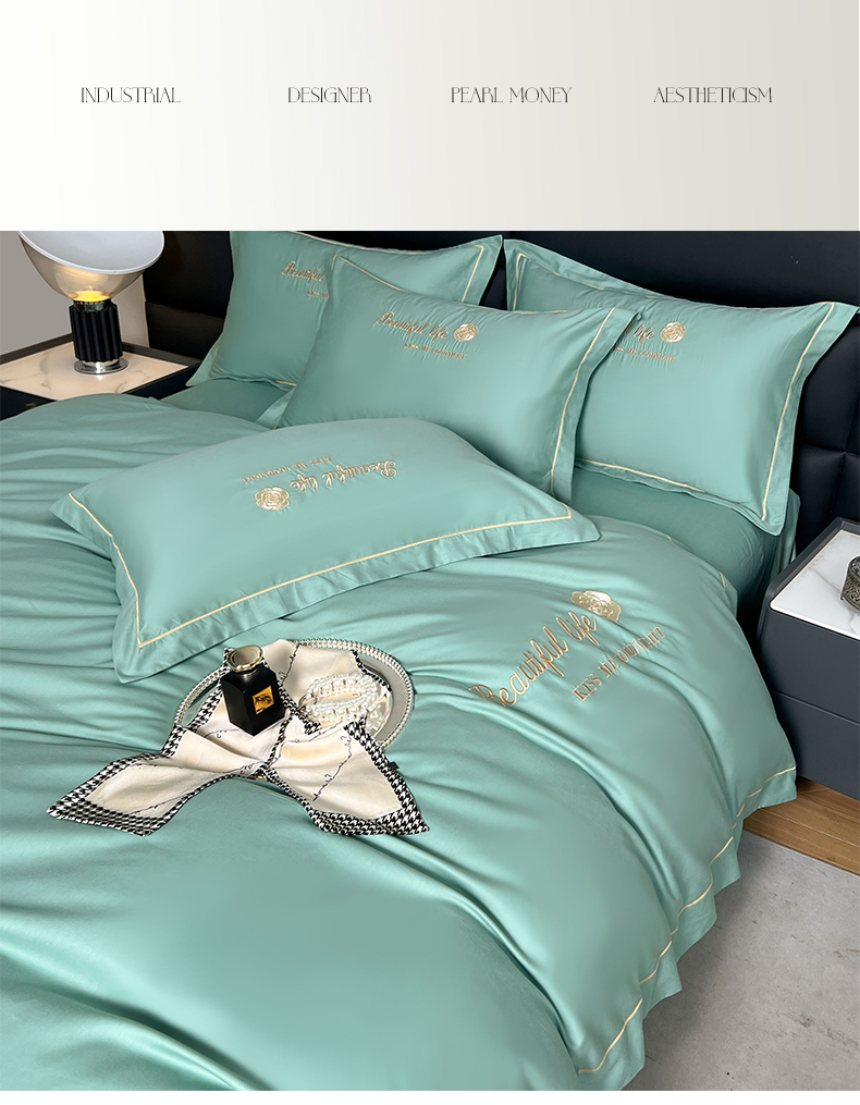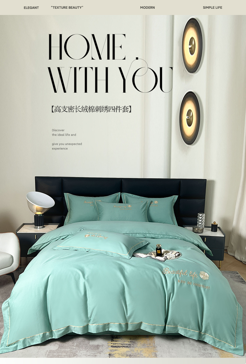 盛馨2023新款轻奢高支高密长绒棉全棉床单床笠刺绣四件套 BF-湖绿