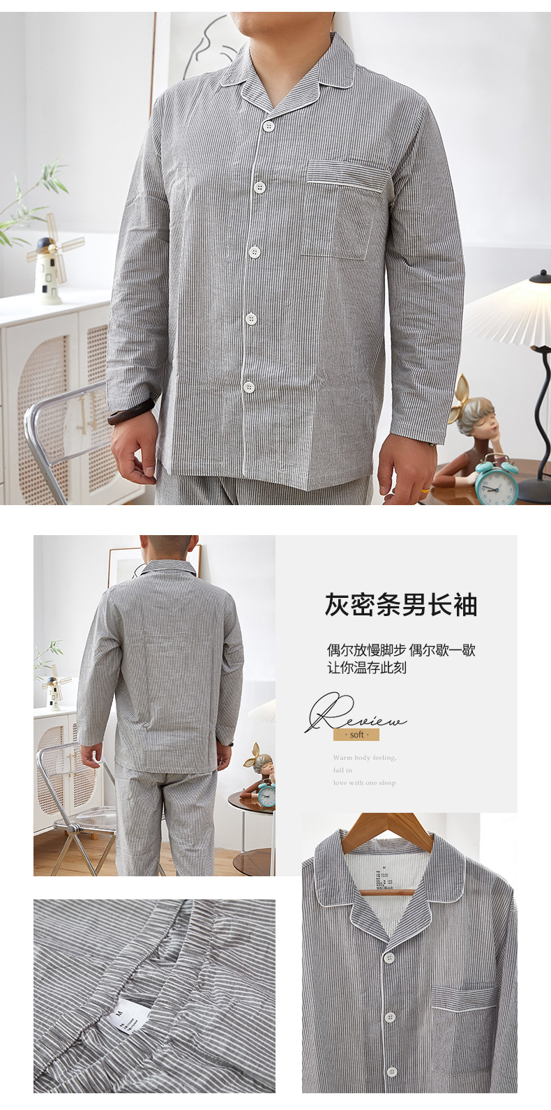 商品名称:玖弘 2023新款水洗棉长袖家居服 灰密条男长袖