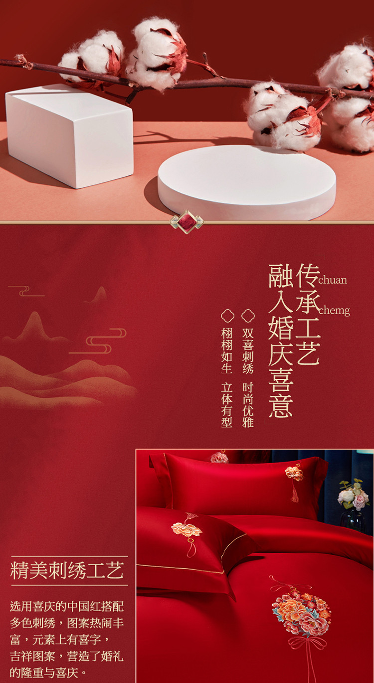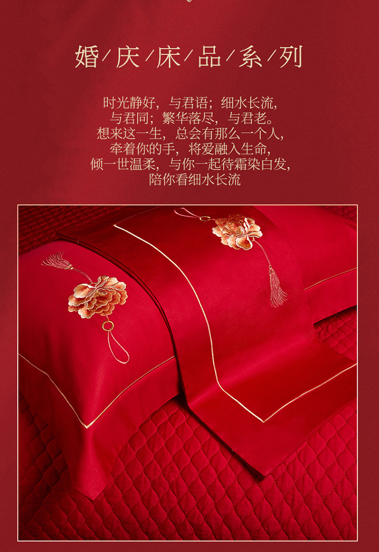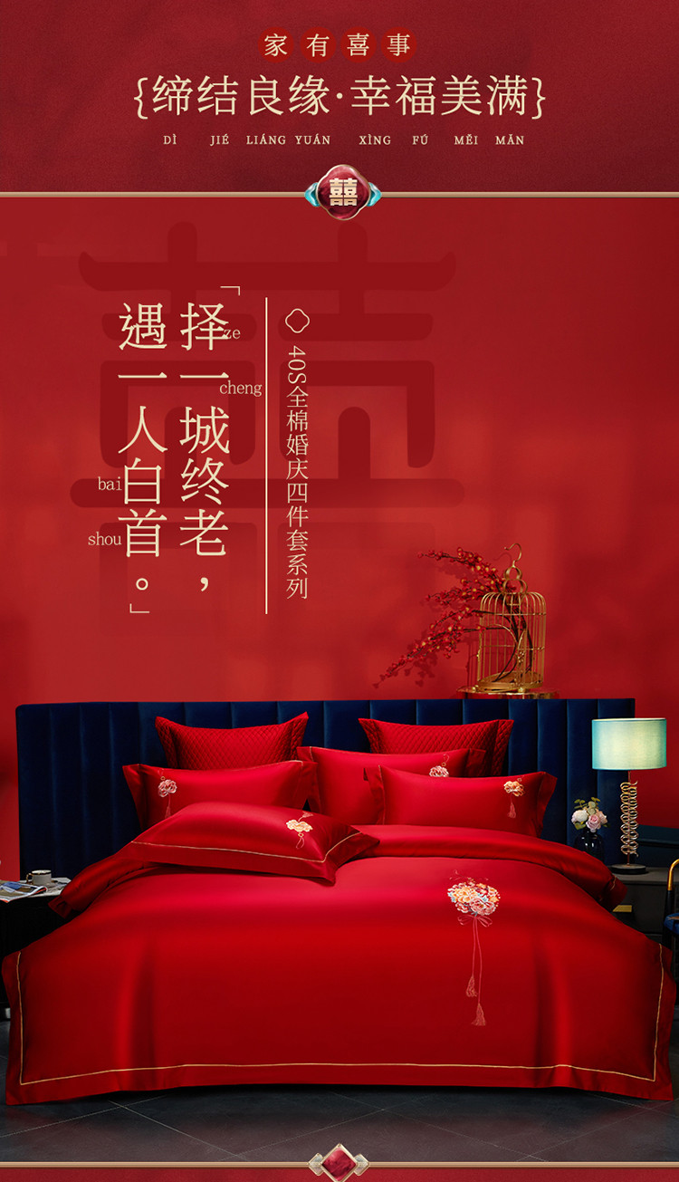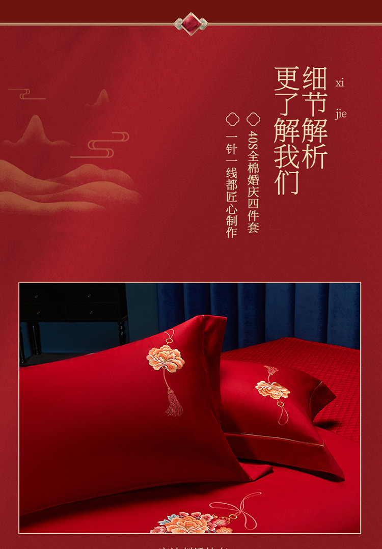 当前位置: 91家纺网 > 商品网购 > 床品套件 > 多件套 > 多件套 > 美娘阁 2023年秋冬新品长绒棉刺绣系列婚庆 四件套/多件套 唯爱