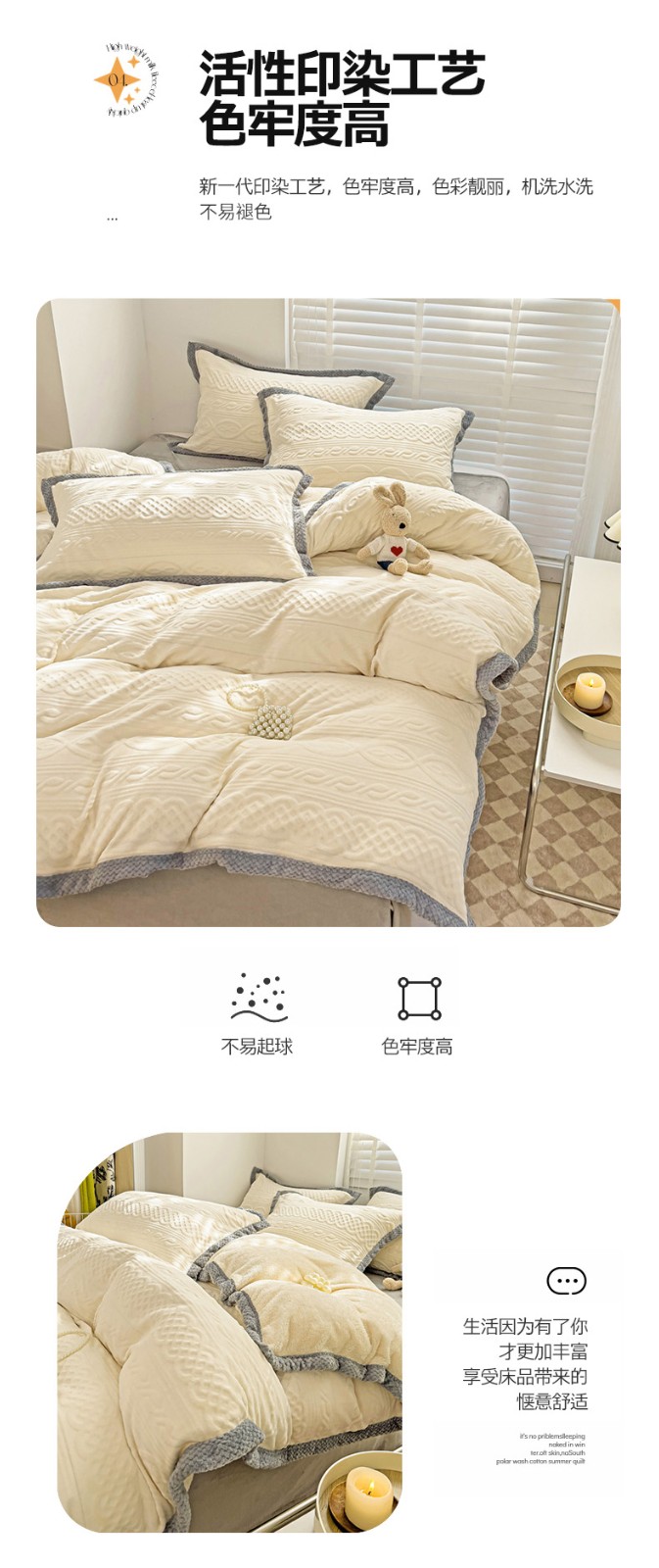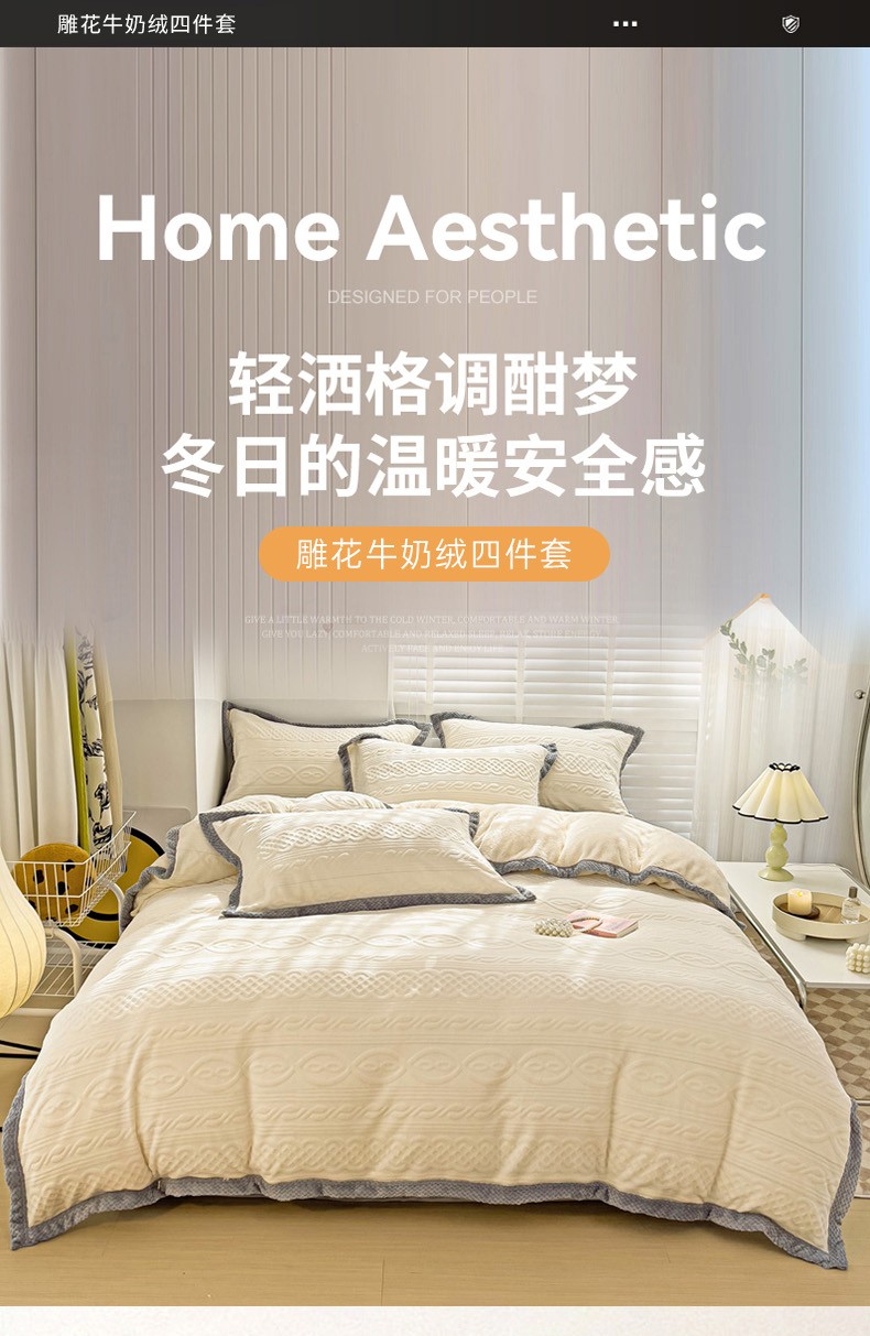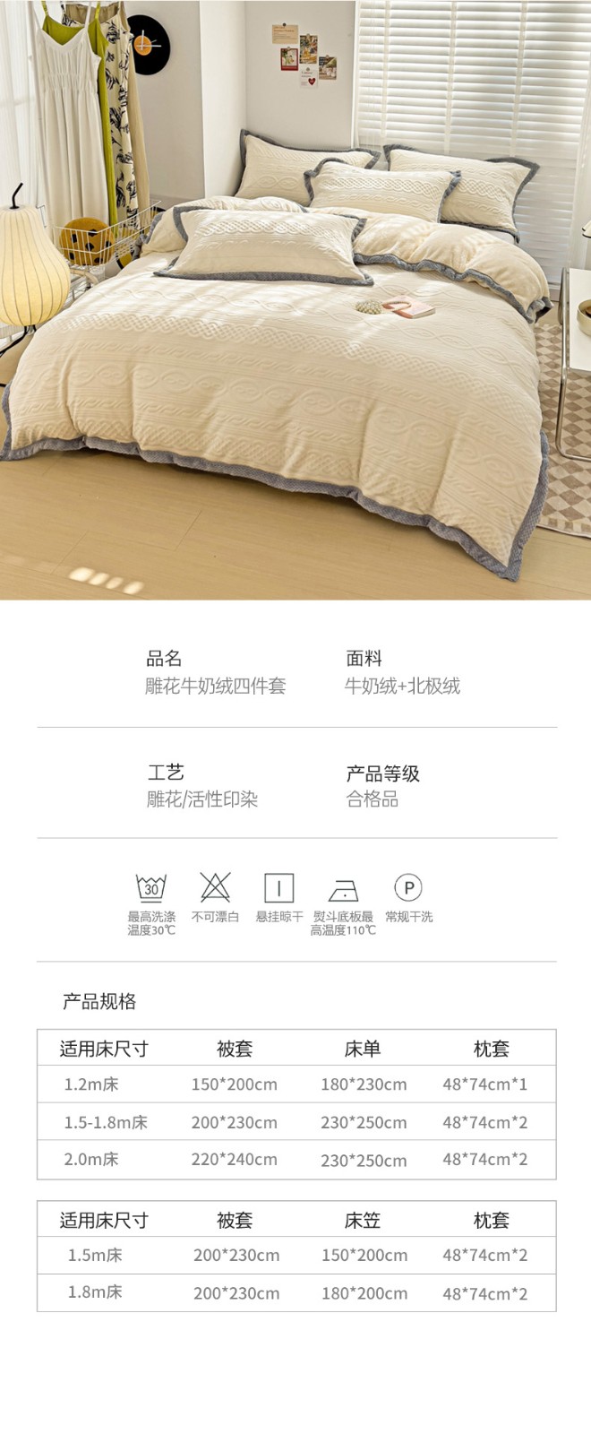 商品名称:法澳 2023新款220克雕花绒纯色牛奶绒四件套 爱莎-米白