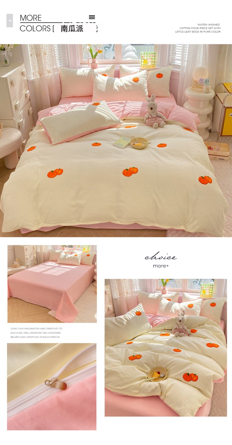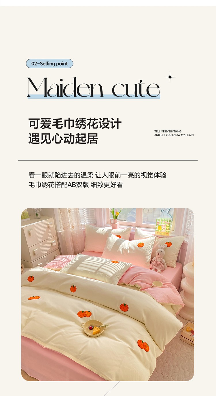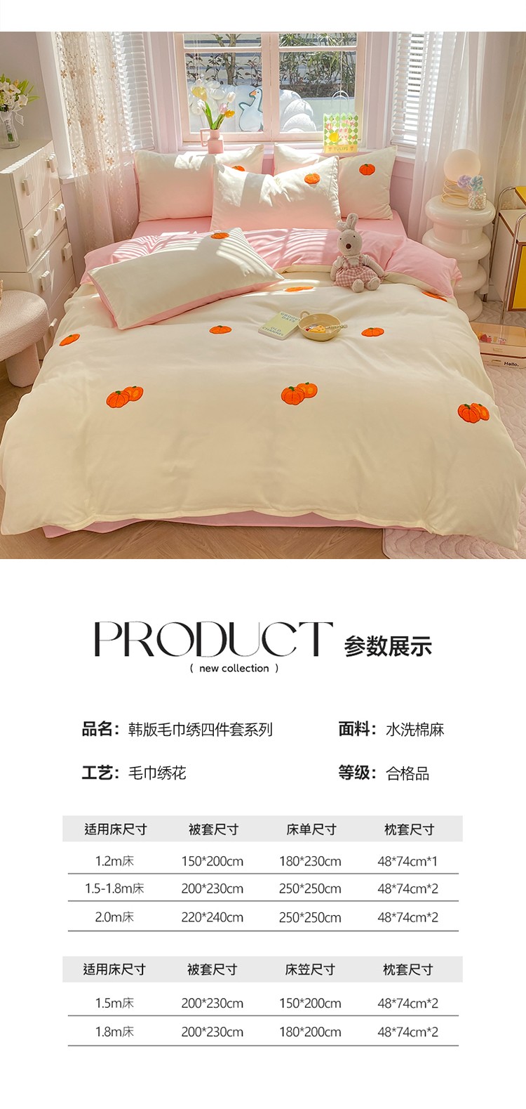 商品名称:欧冠 2023新款秋冬保暖专版水洗棉麻毛巾绣四件套 南瓜派