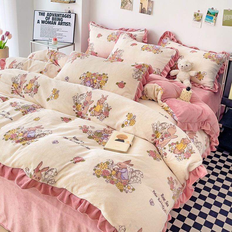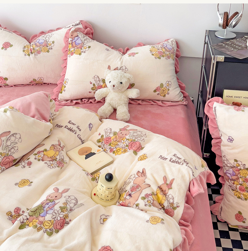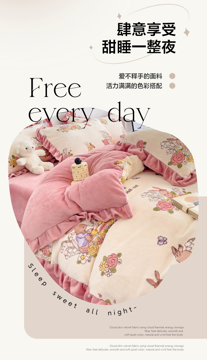 家之硕 2023新款韩版荷叶边印花牛奶绒四件套 兔先生