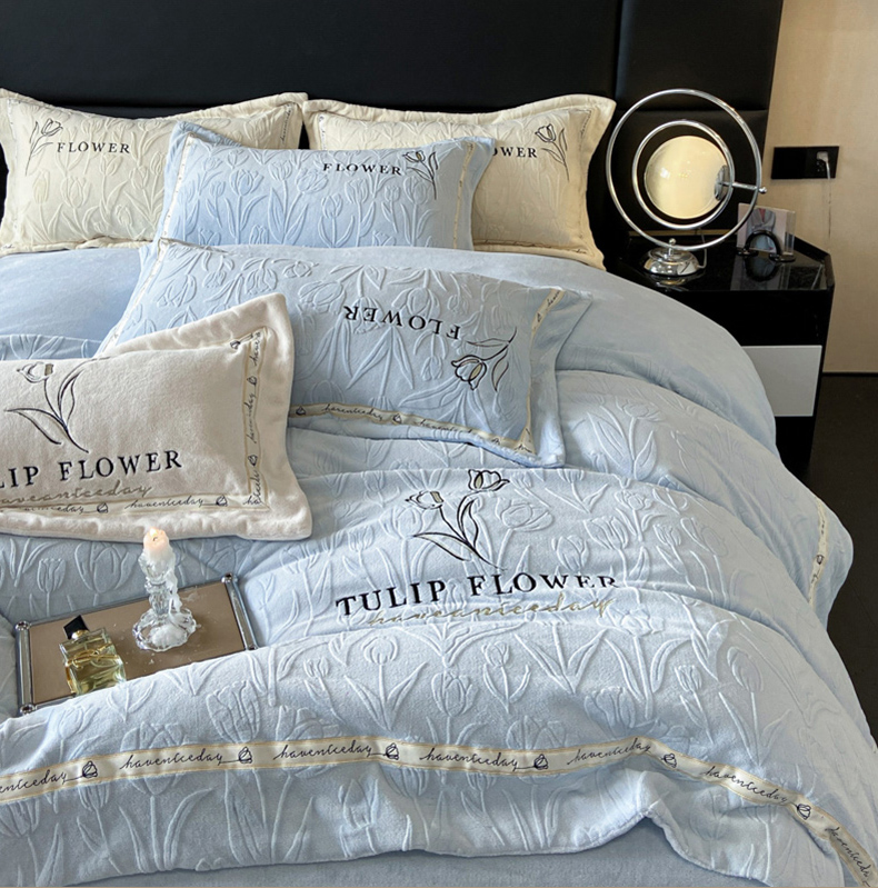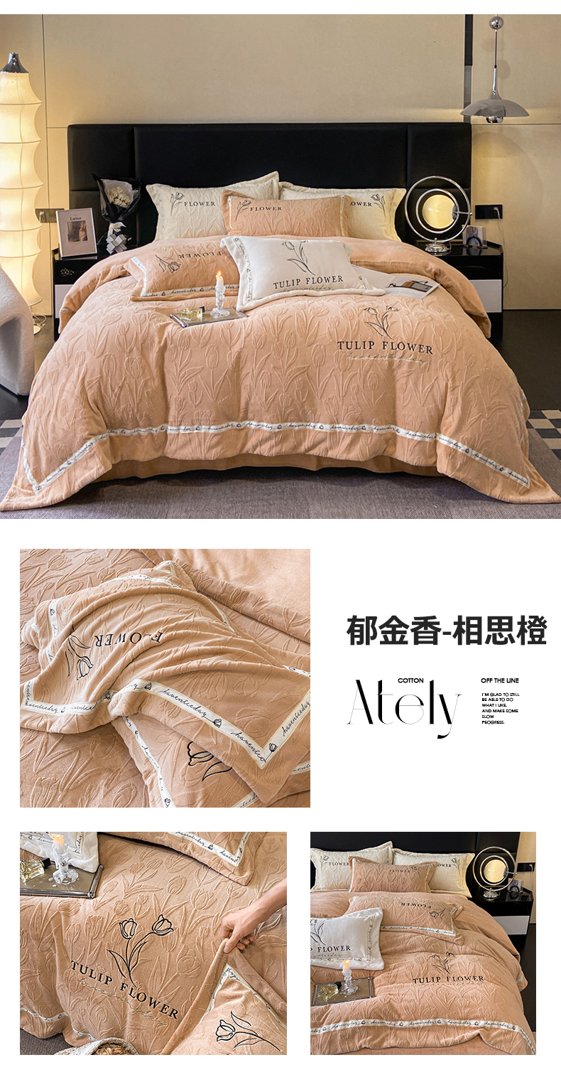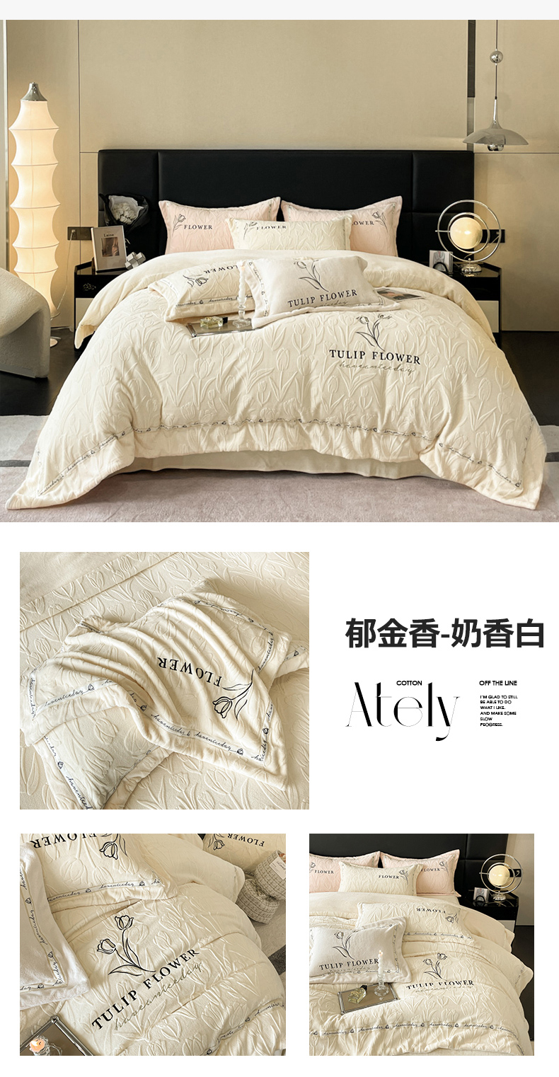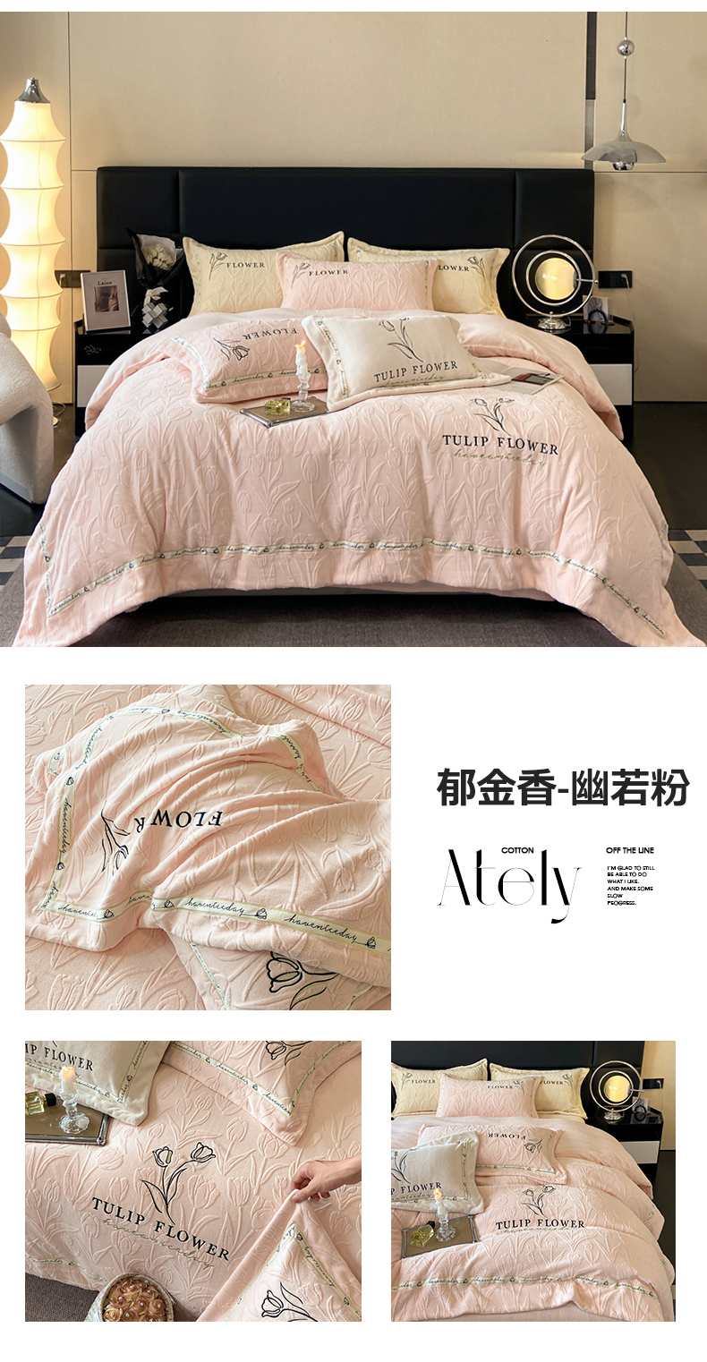 (总)祺瑞佳家纺 2023新款A类母婴高克重超柔牛奶绒婴儿绒雕花烂花刺绣绣花四件套-郁金香