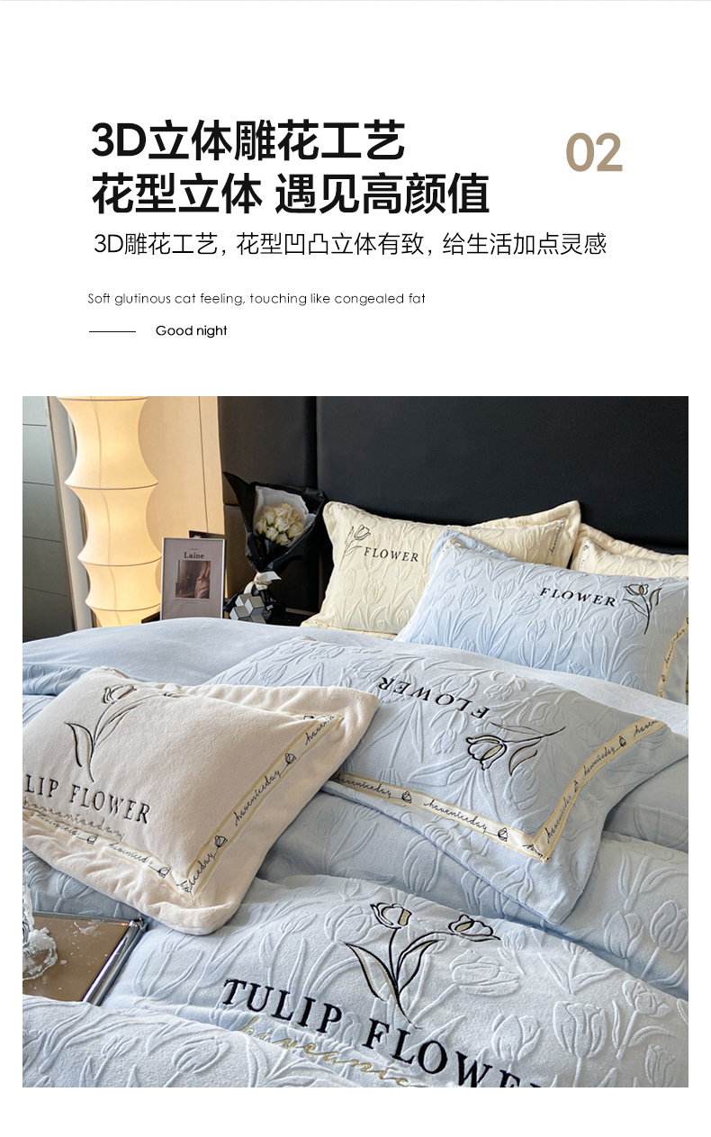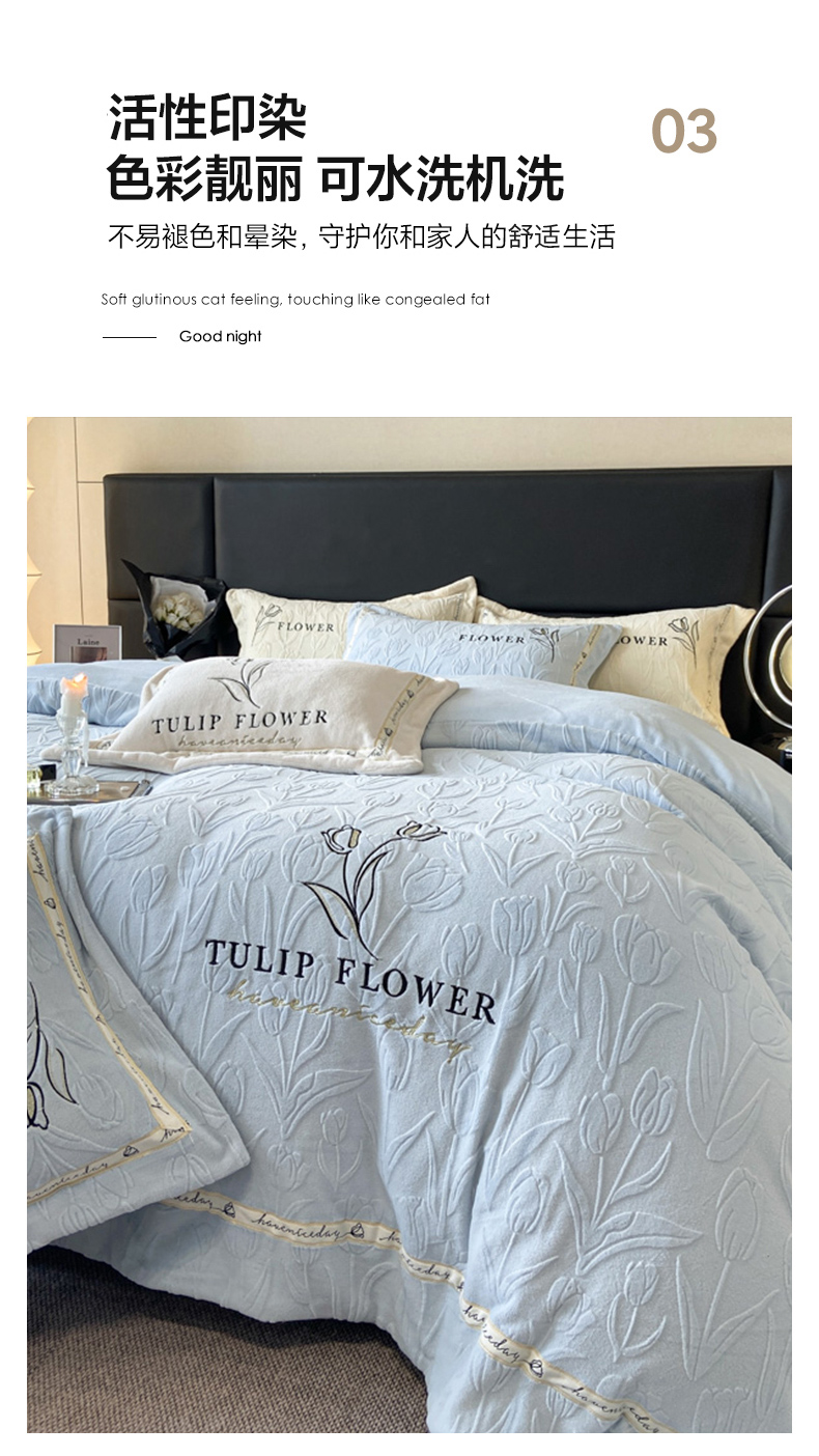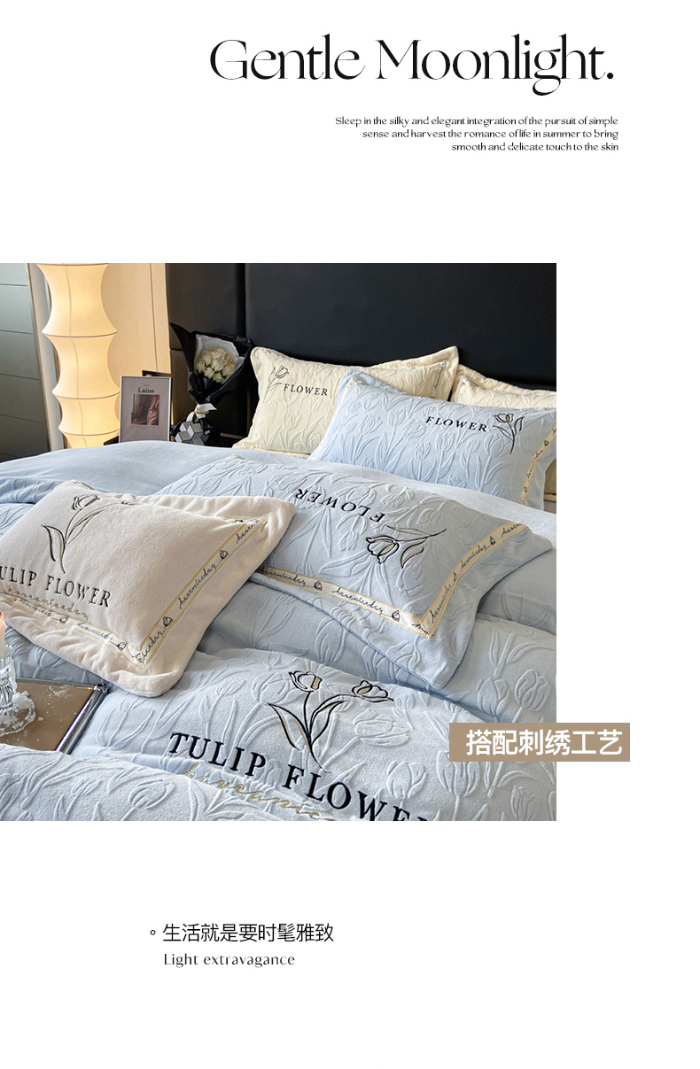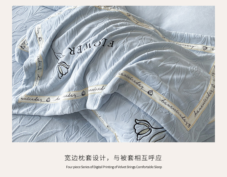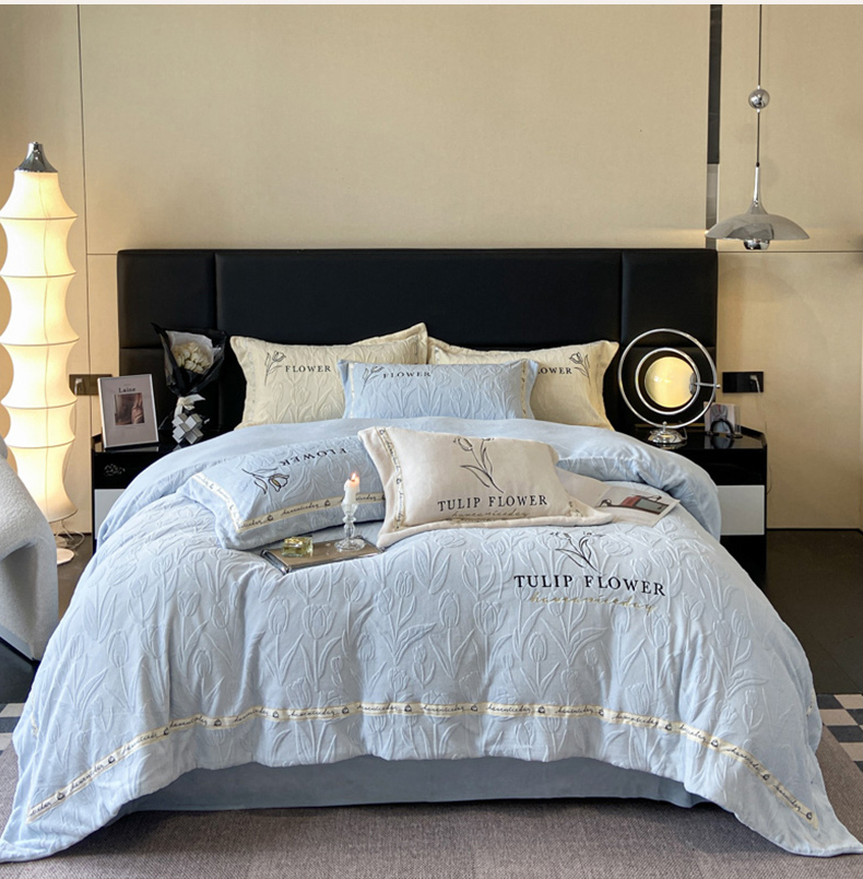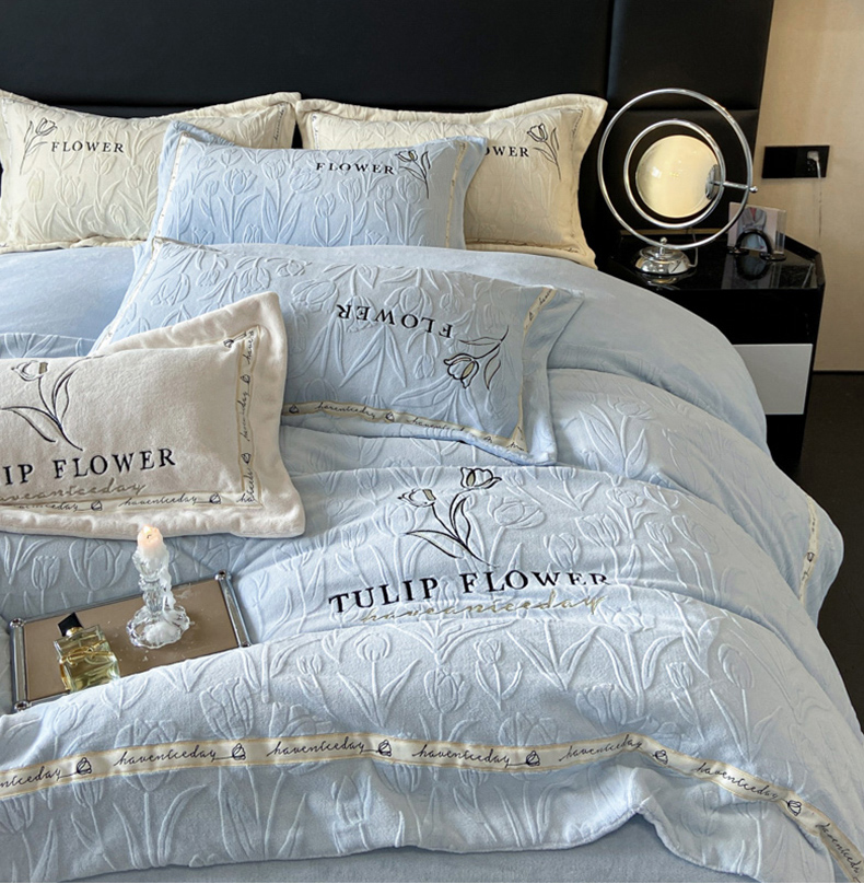 (总)祺瑞佳家纺 2023新款A类母婴高克重超柔牛奶绒婴儿绒雕花烂花刺绣绣花四件套-郁金香