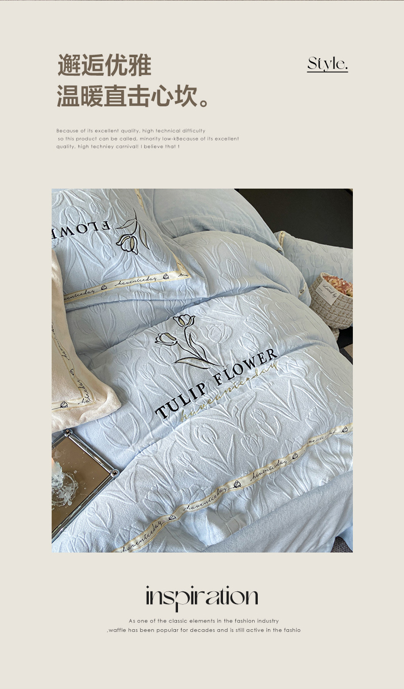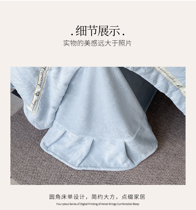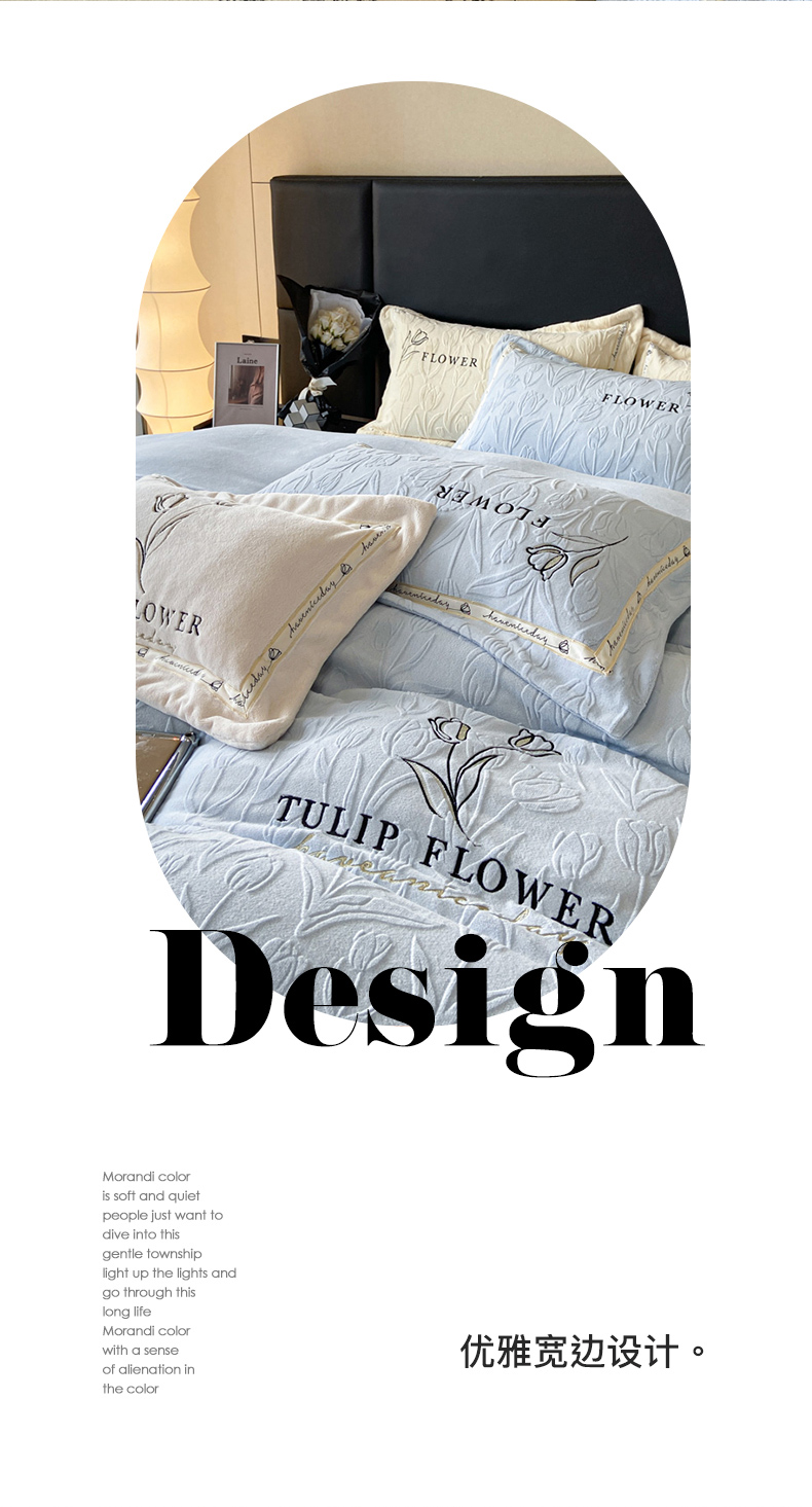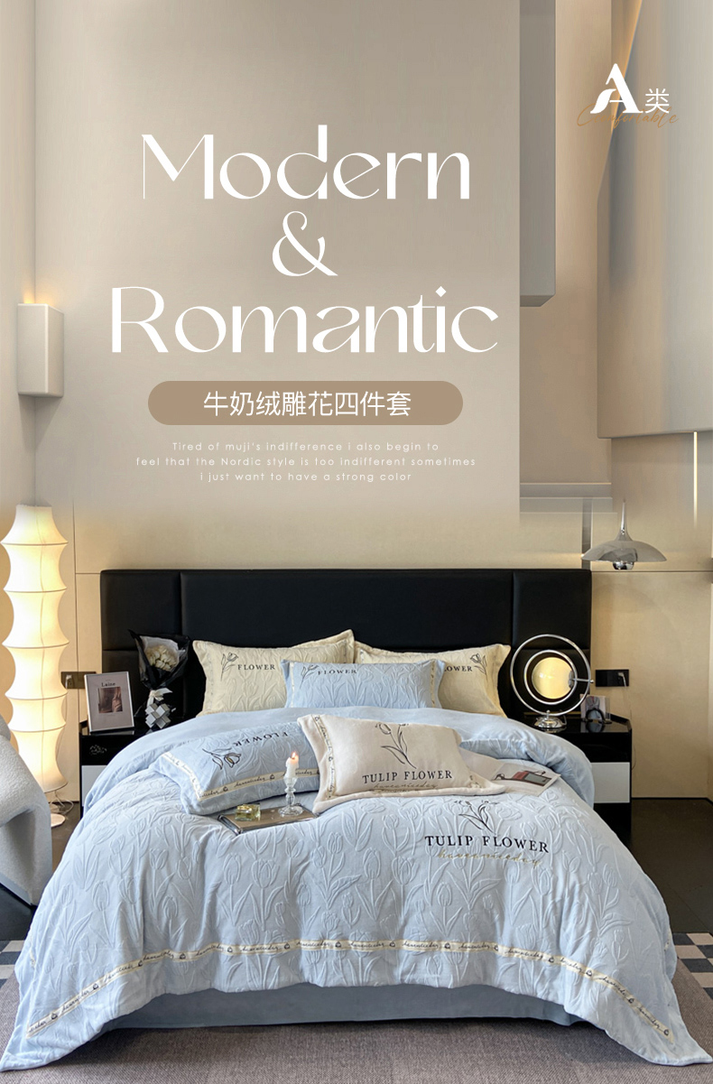 (总)祺瑞佳家纺 2023新款A类母婴高克重超柔牛奶绒婴儿绒雕花烂花刺绣绣花四件套-郁金香