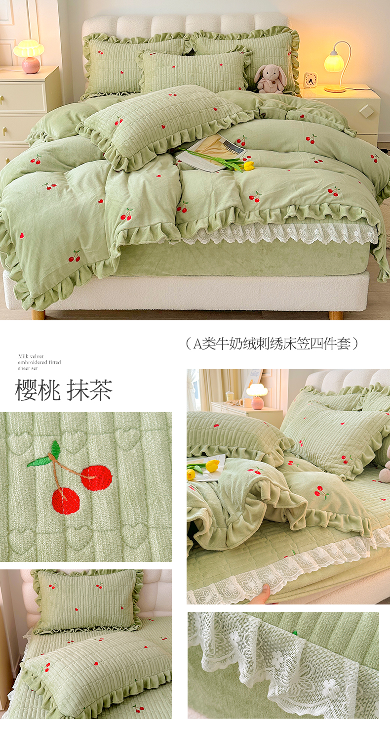 商品名称:宜凡 2023新款牛奶绒夹棉绗缝绣花床笠四件套 樱桃-抹茶