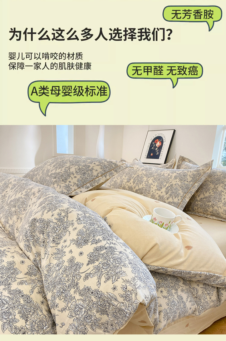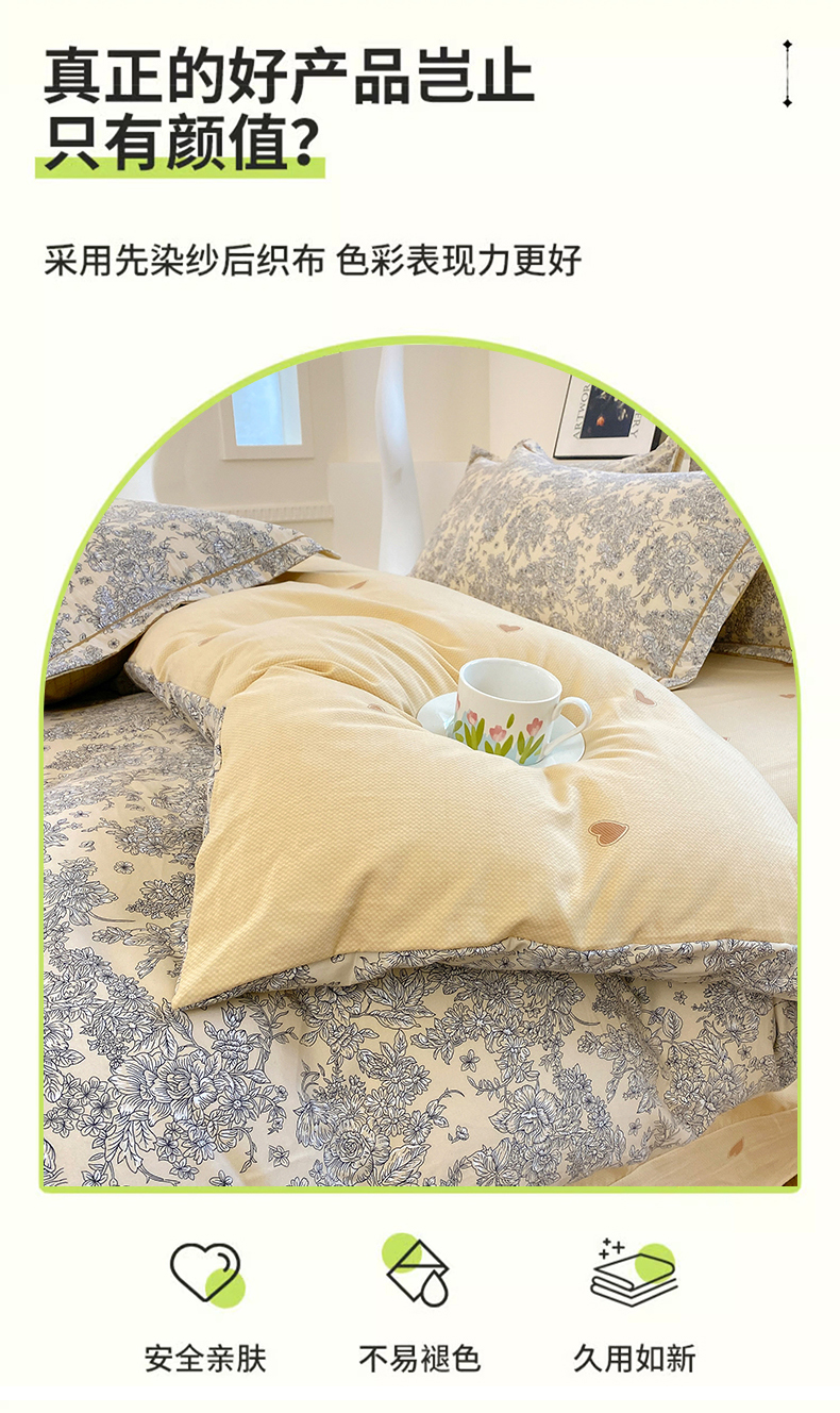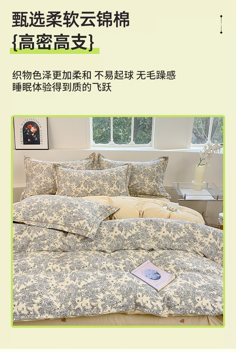 当前位置: 91家纺网 > 商品网购 > 床品套件 > 四件套 > 全棉普通四件套 > 家贝爱 2024春日新款A类精选高支高密水洗云锦棉四件套 静秋