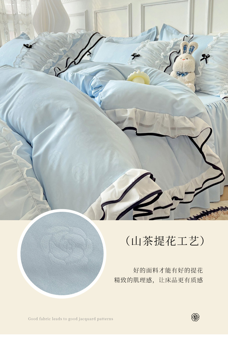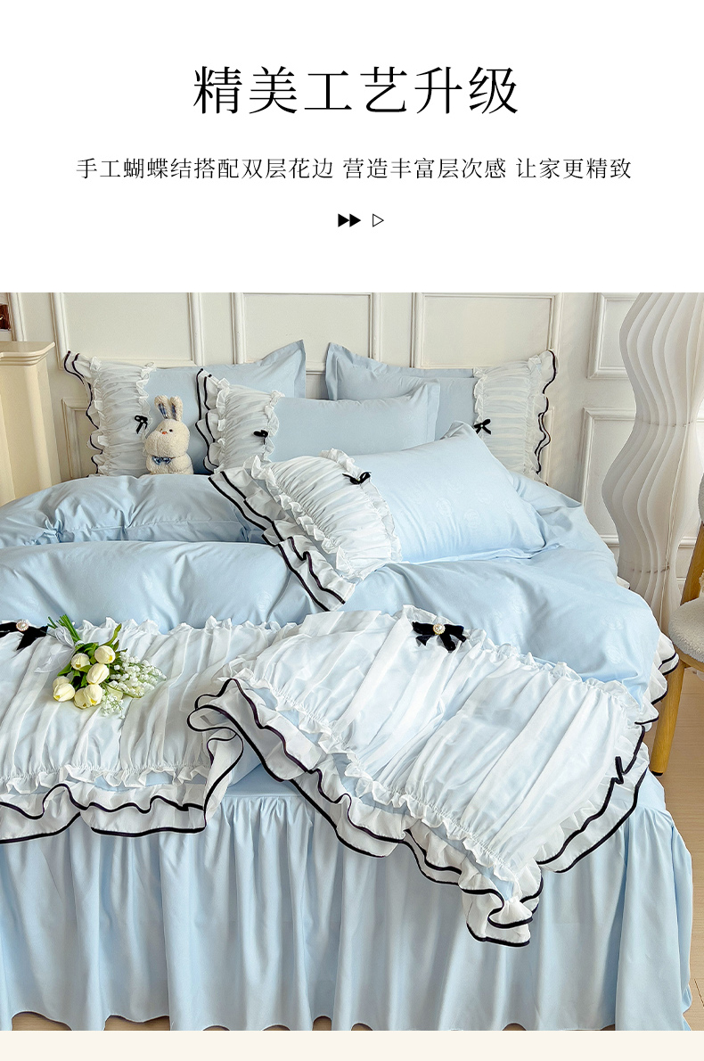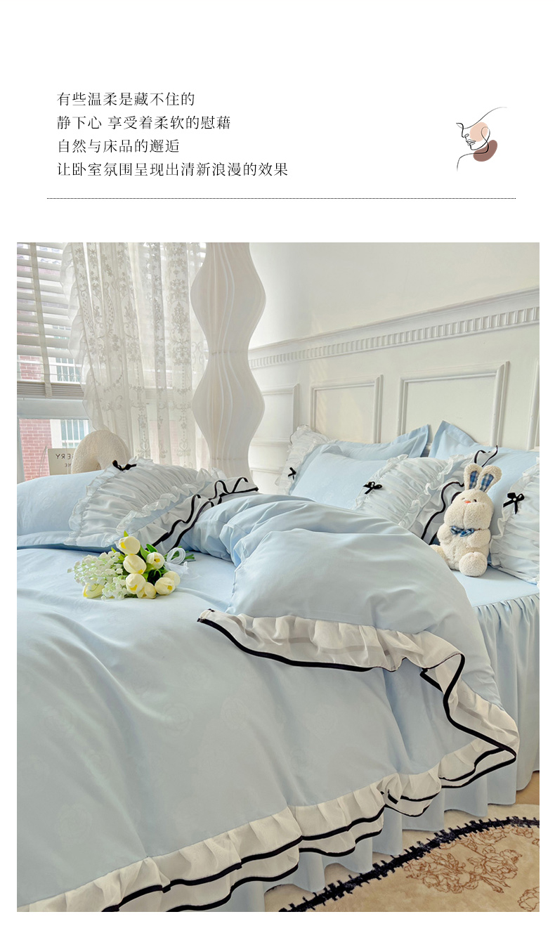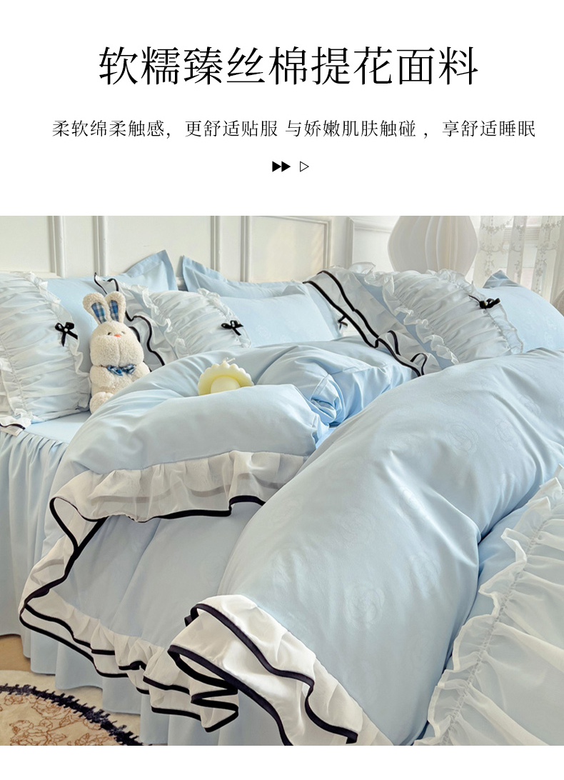 当前位置: 91家纺网 > 商品网购 > 床品套件 > 四件套 > 化纤活性四件套 > 包小包 2024新款臻丝棉小香风提花双层花边韩版公主风四件套(提供买家秀) 小香风-蓝色