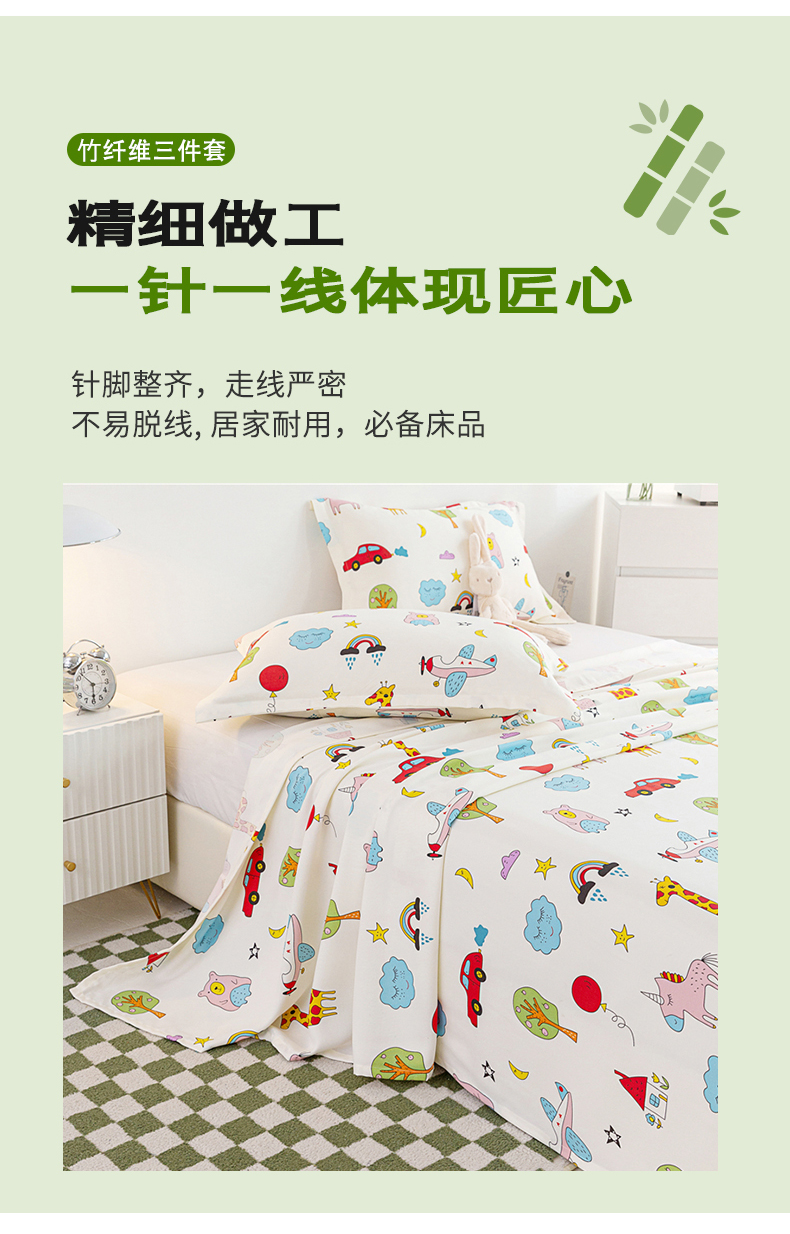 金泰莱 2025新款印花竹纤维凉席三件套软凉席竹席盖毯子 动物乐园-米