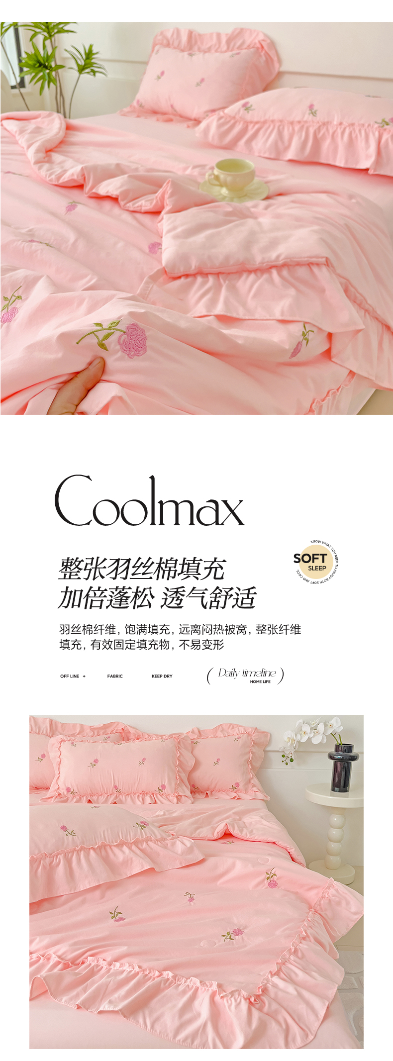 逸尚阁 2025新款水洗磨毛刺绣花边夏被四件套--初荷系列(拍法二) 初荷-粉玫瑰