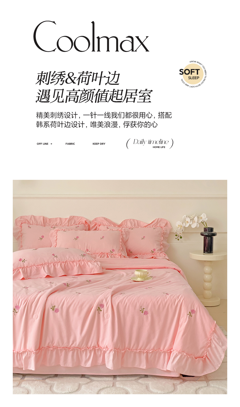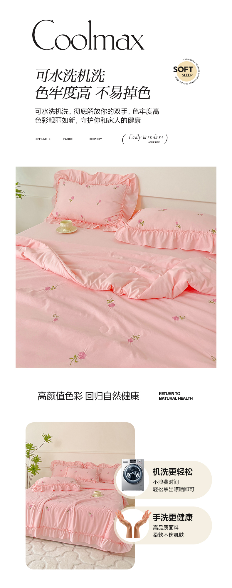 商品名称:逸尚阁 2025新款水洗磨毛刺绣花边夏被四件套--初荷系列(拍法二) 初荷-粉玫瑰