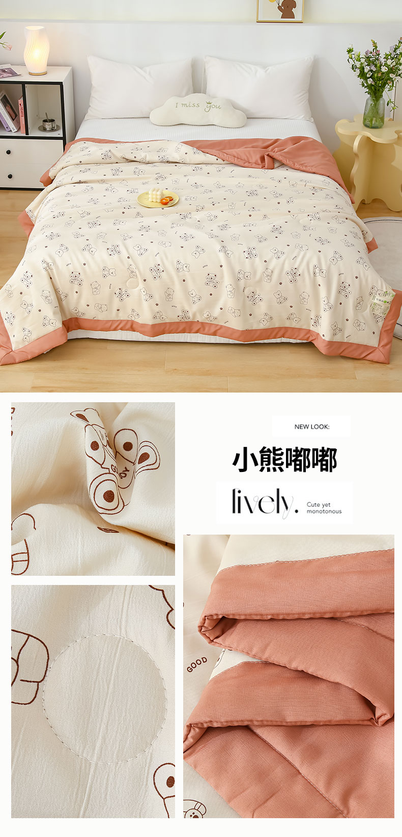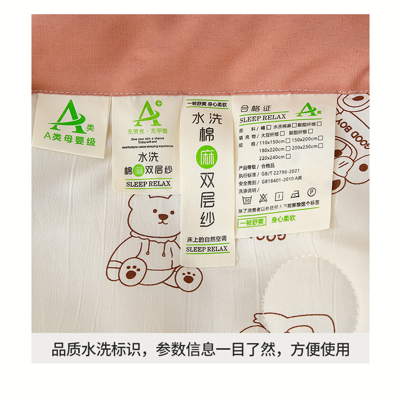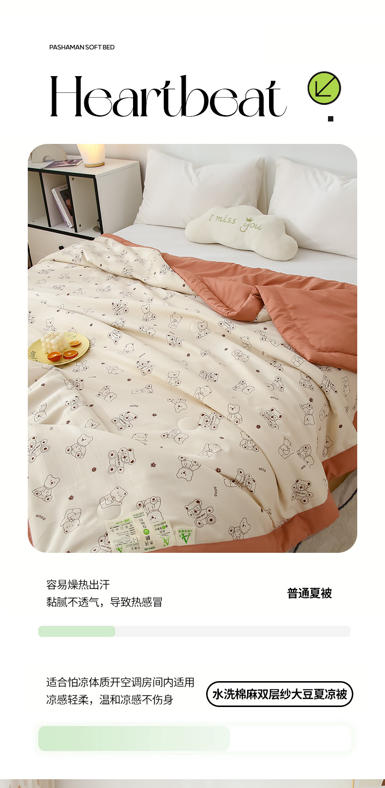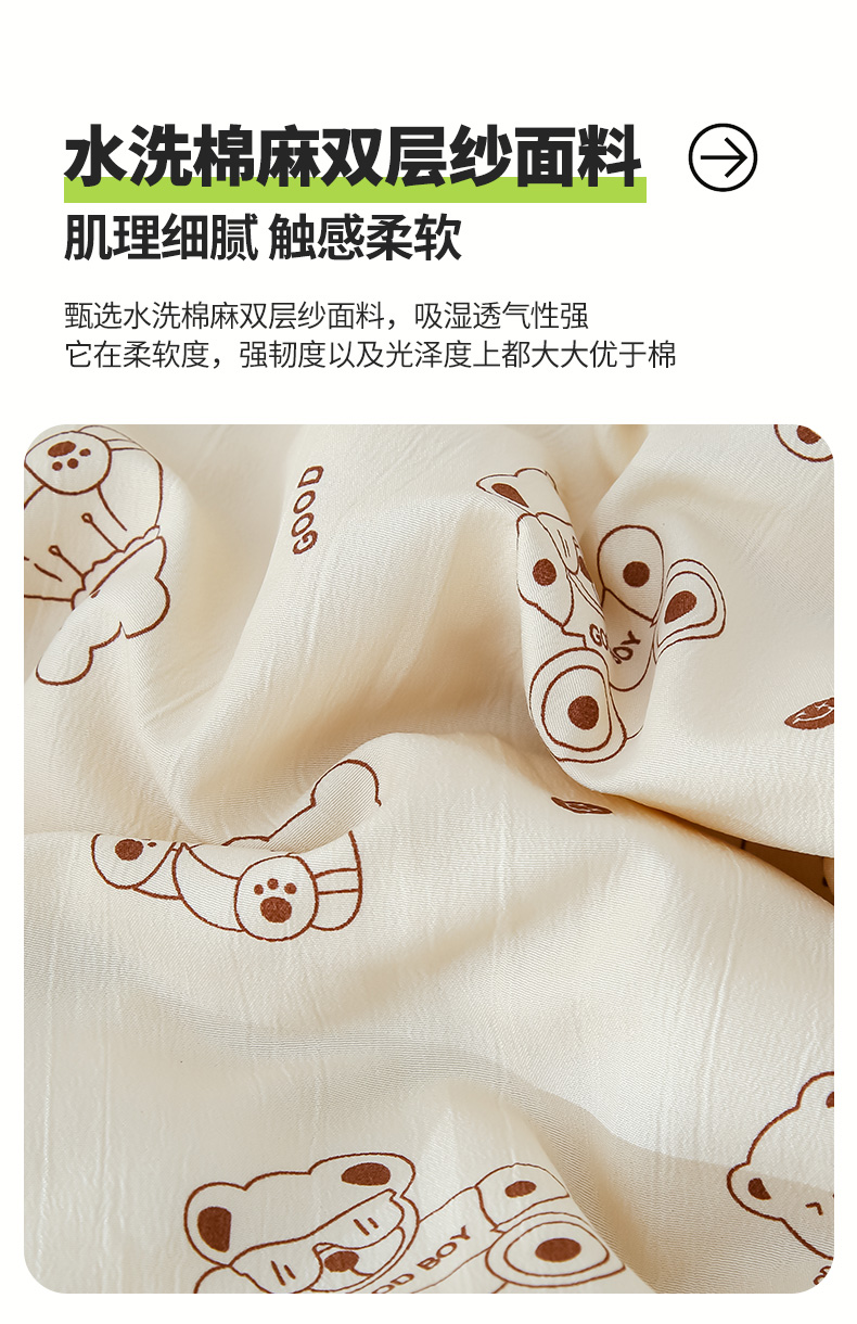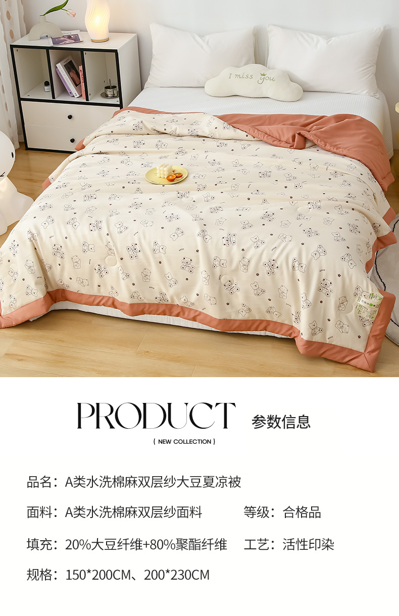 商品名称:江山被业 2025新款水洗棉麻双层纱大豆夏凉被 小熊嘟嘟