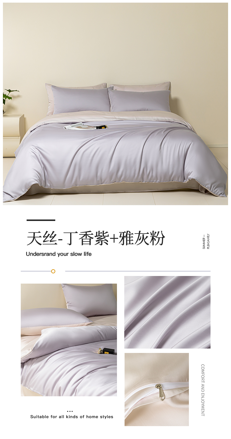 当前位置: 91家纺网 > 商品网购 > 床品套件 > 四件套 > 莱赛尔四件套 > 慕色家纺 2024新款高支莱赛尔天丝纯色拼色四件套 天丝-丁香紫+雅灰粉