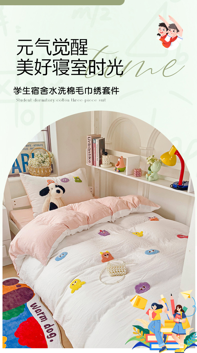 当前位置: 91家纺网 > 商品网购 > 床品套件 > 三件套 > 韩巢家纺 2024新款超柔水洗棉毛巾绣学生宿舍上下铺三件套四件套-小精灵系列 小精灵白浅粉