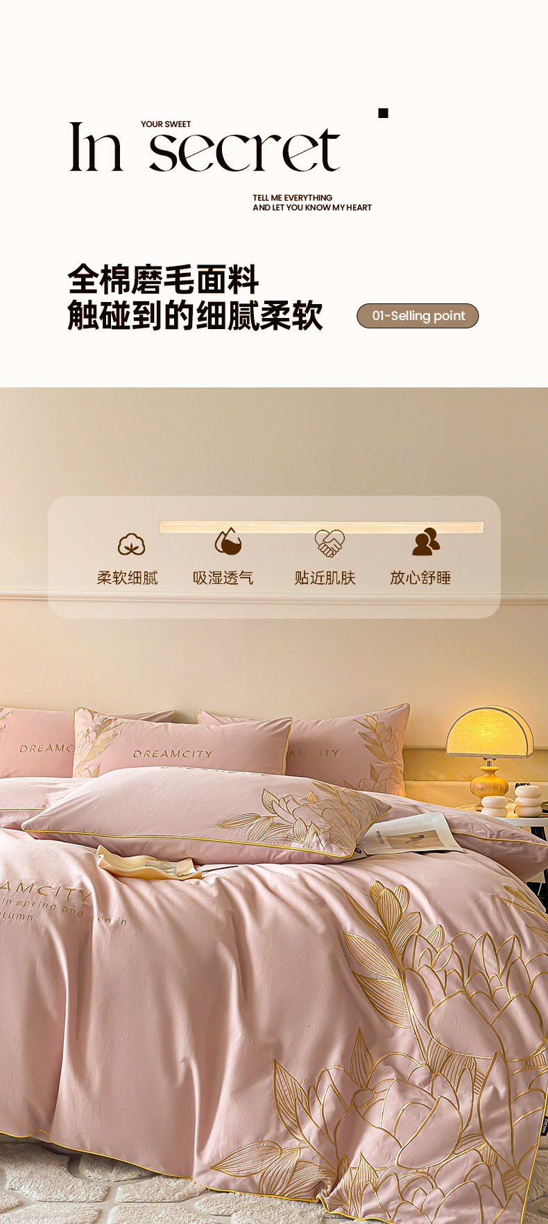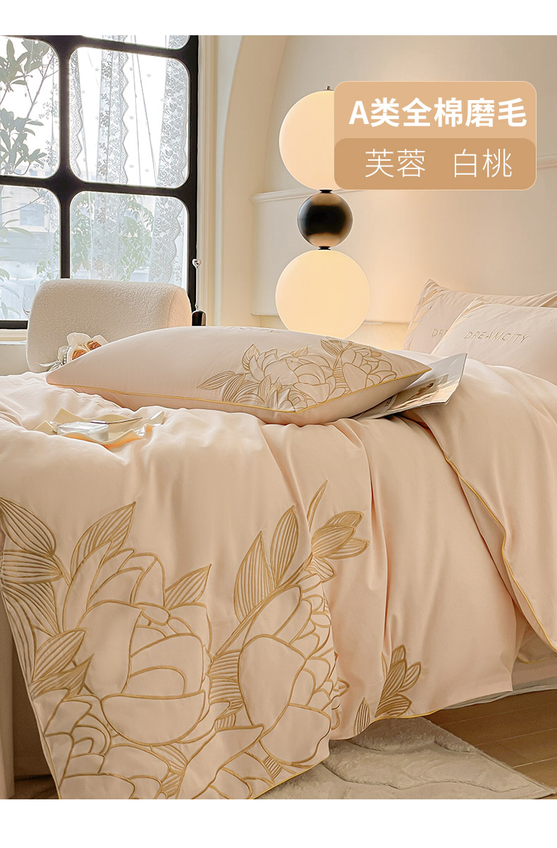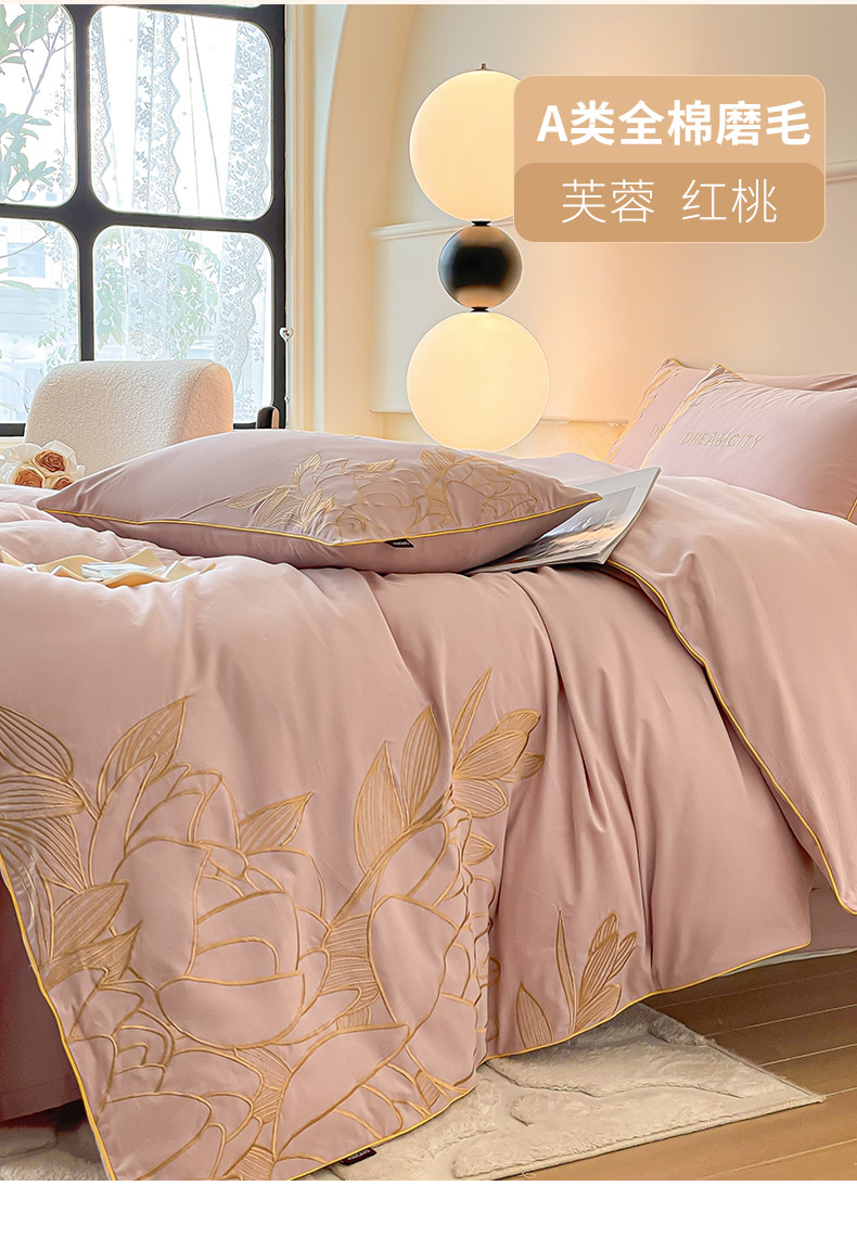 商品名称: 【提供检测报告】A类母婴级全棉加厚保暖磨毛四件套纯棉高精密刺绣长绒棉床上用品轻奢风 芙蓉-红桃