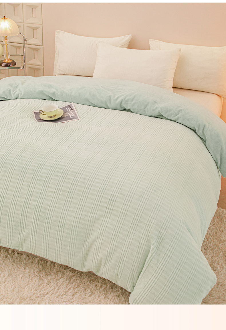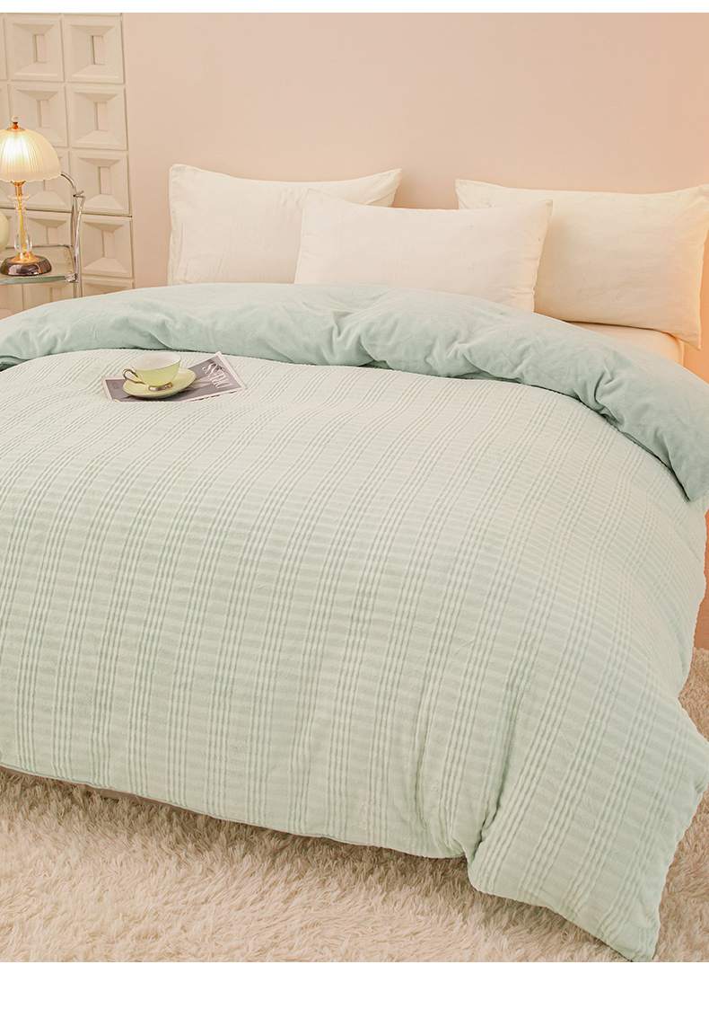 • 91家纺网 家纺一手货源 找家纺 锦罗绣 2024新款全消光230克牛奶绒烂花绒提花单被套 条纹-绿