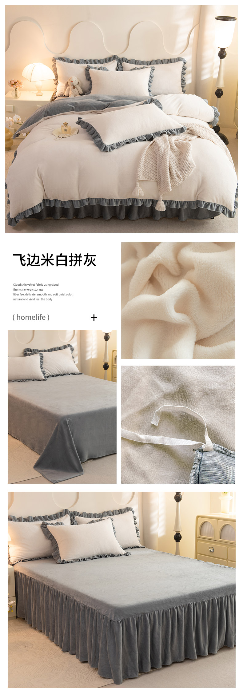 当前位置: 91家纺网 > 商品网购 > 床品套件 > 四件套 > 牛奶绒四件套 > 恩和家纺 2024新款高克重200g牛奶绒飞边款四件套 飞边米白拼灰